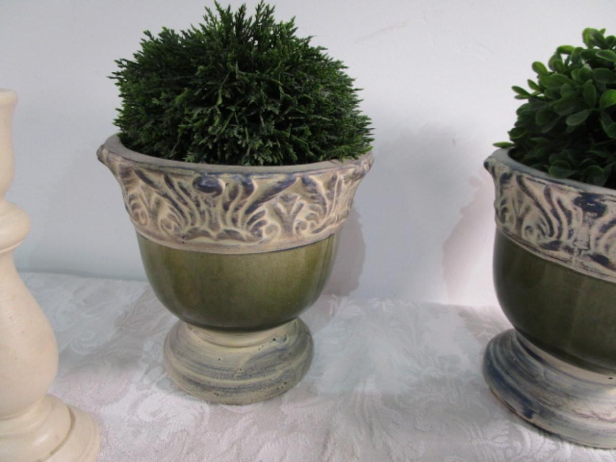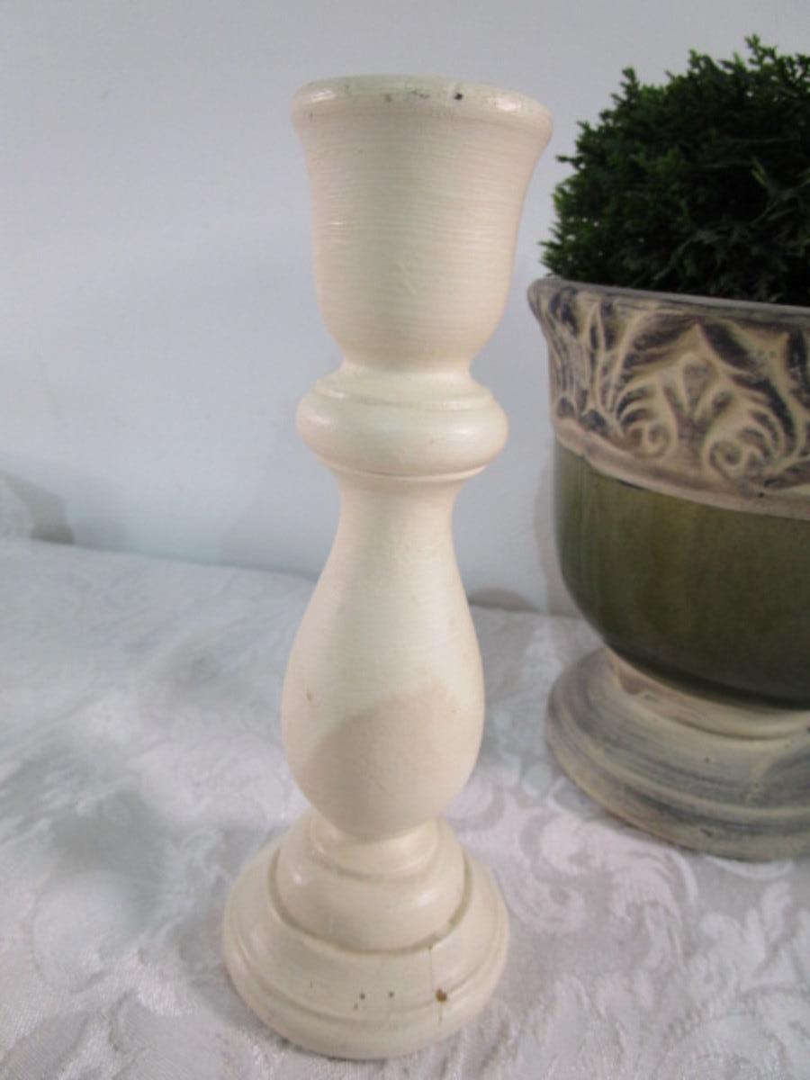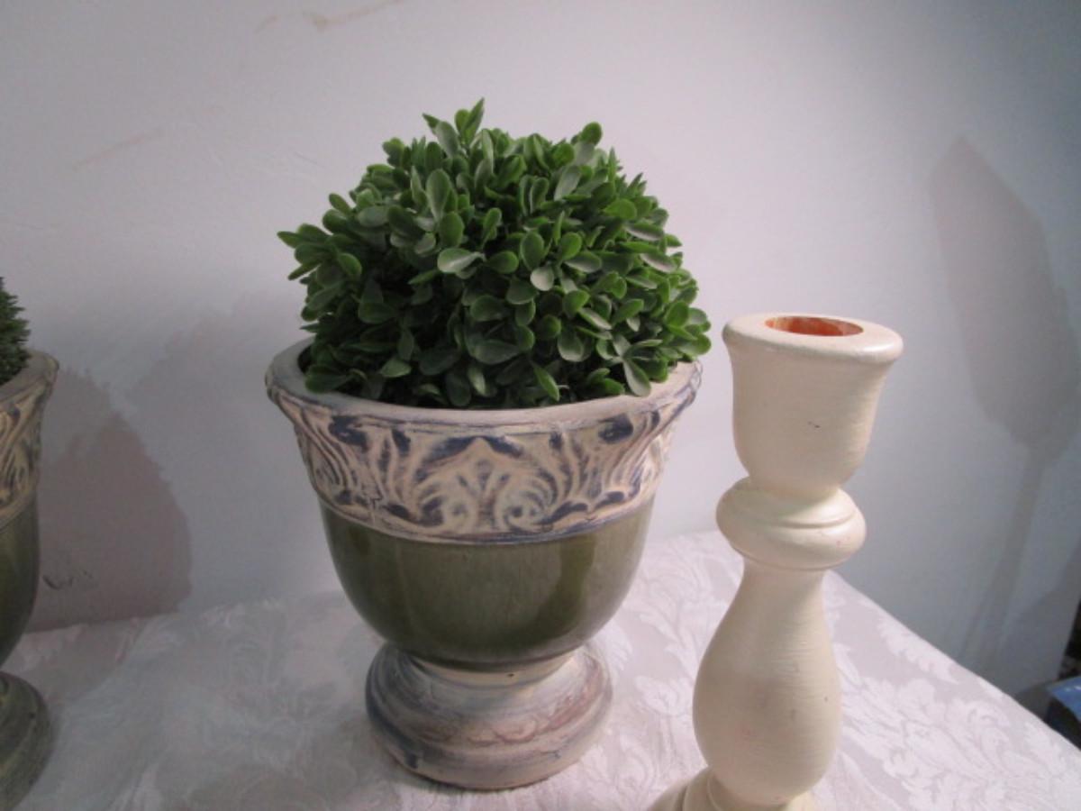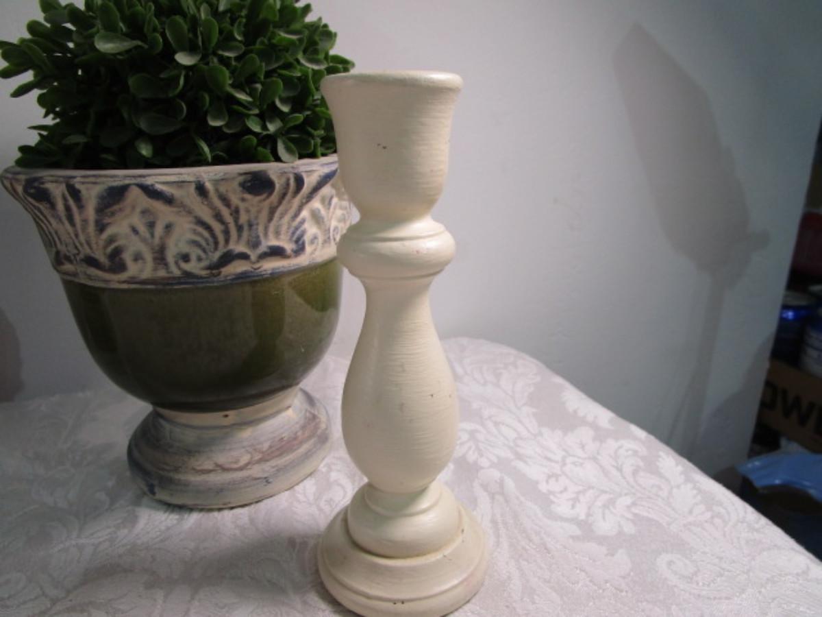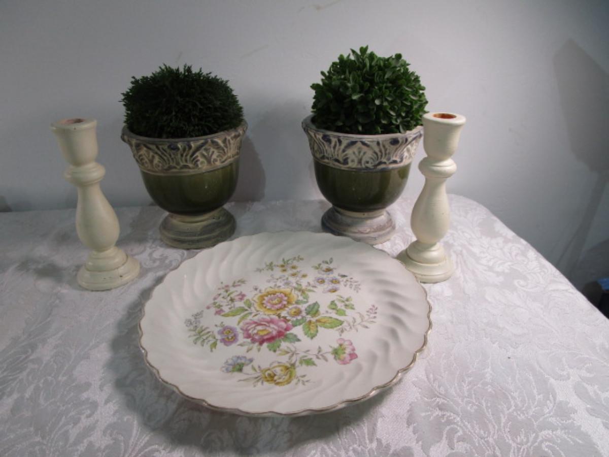 2 faux plants in decorative planters, 2 wood candlesticks, 1 decorative plate