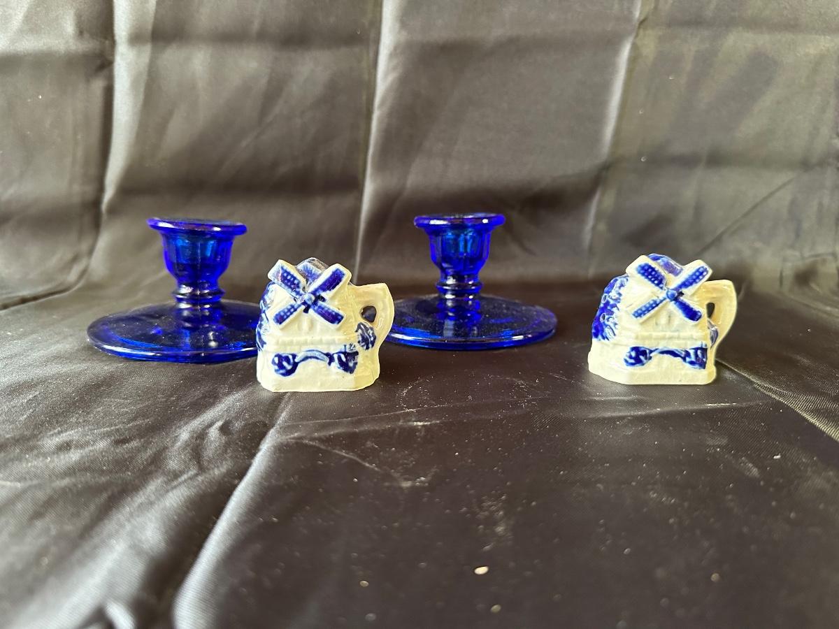 2 FENTON DISHES, COBALT CANDLE HOLDERS AND SHAKERS