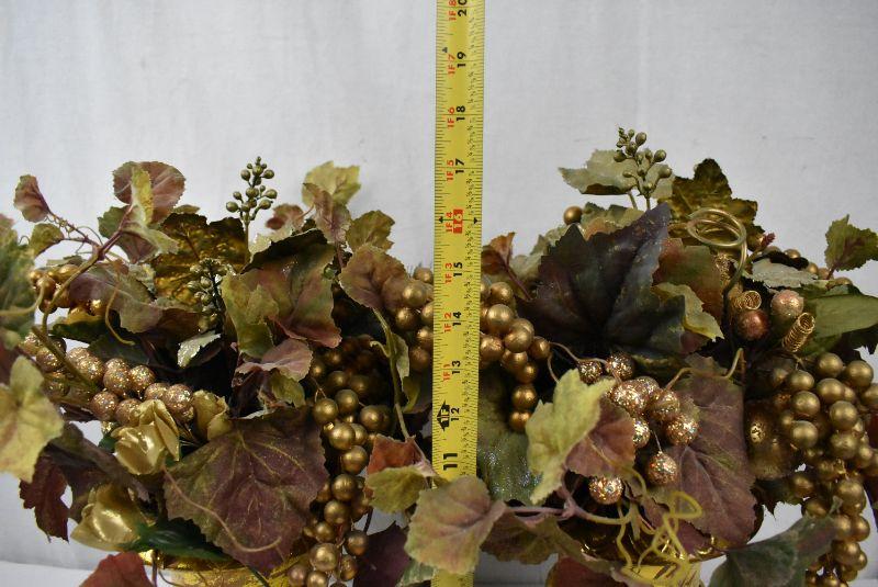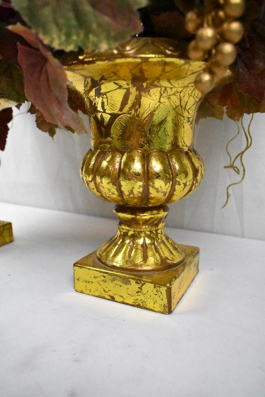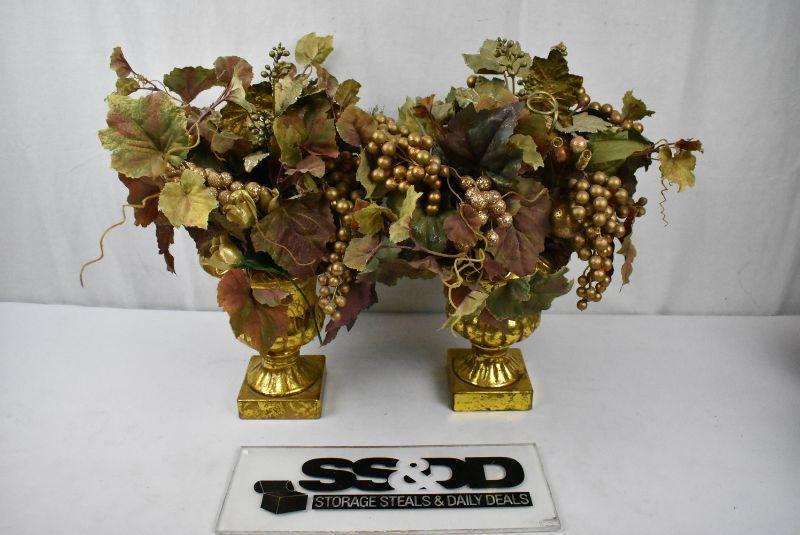 2 Floral Arrangements of Grapes & Leaves. Gold Color Vases
