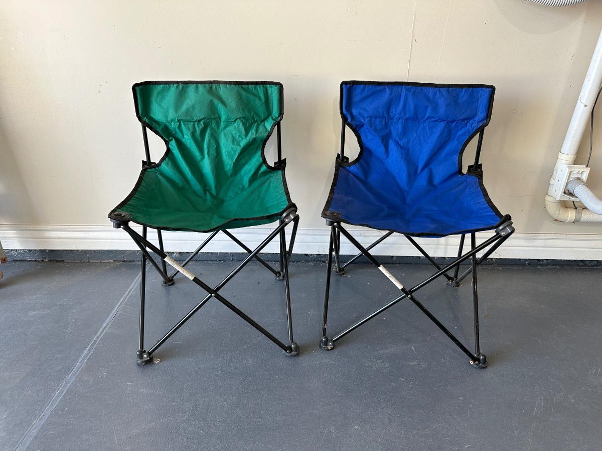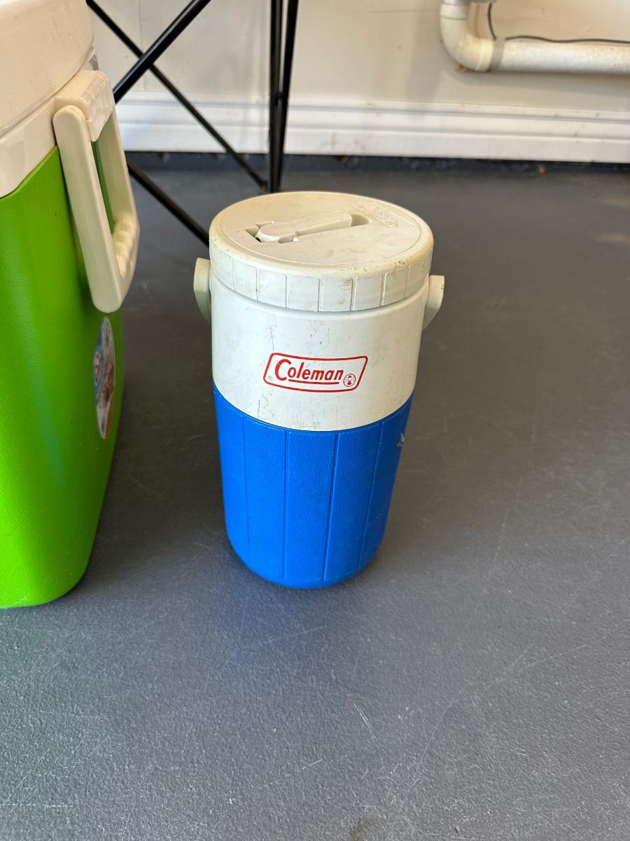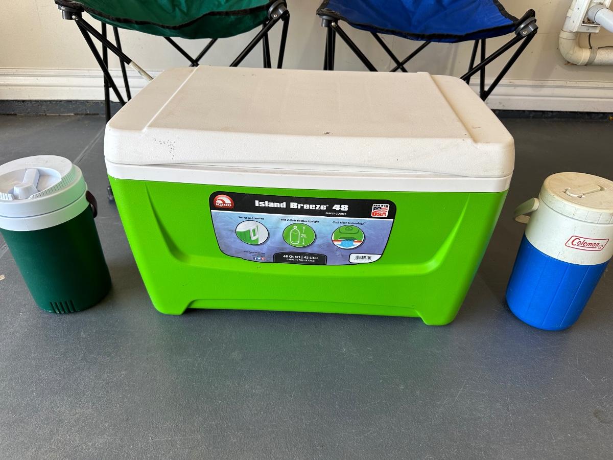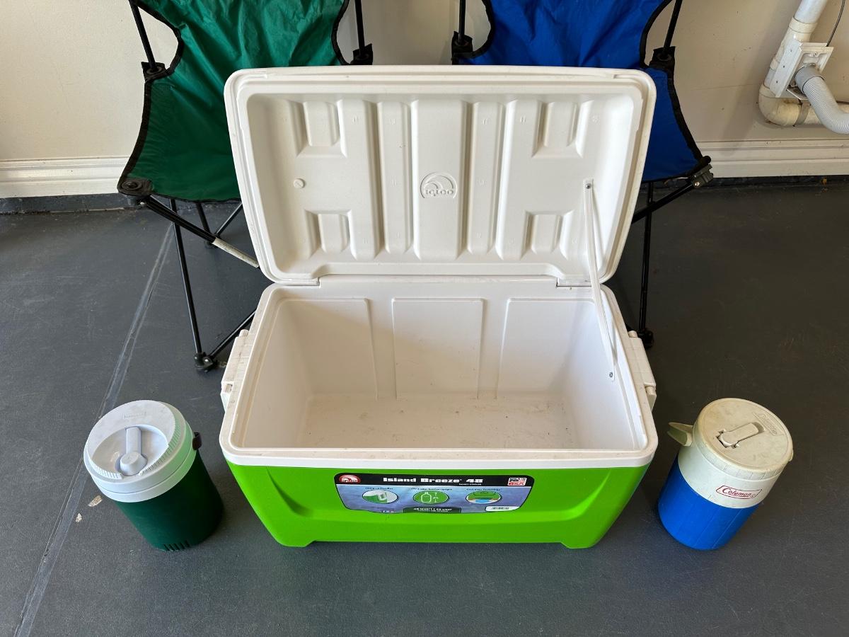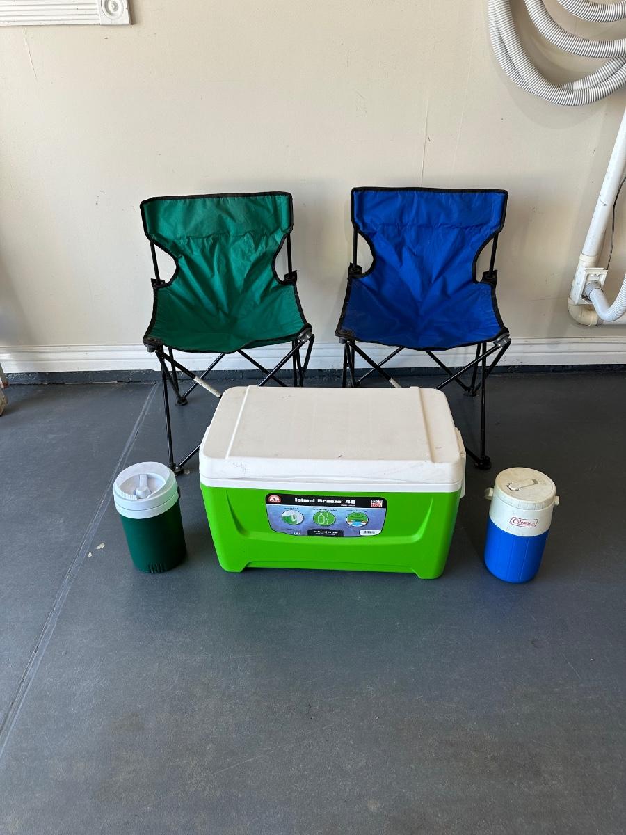 2 FOLDING CHAIRS, 2 BEVERAGE COOLERS AND A FOOD COOLER