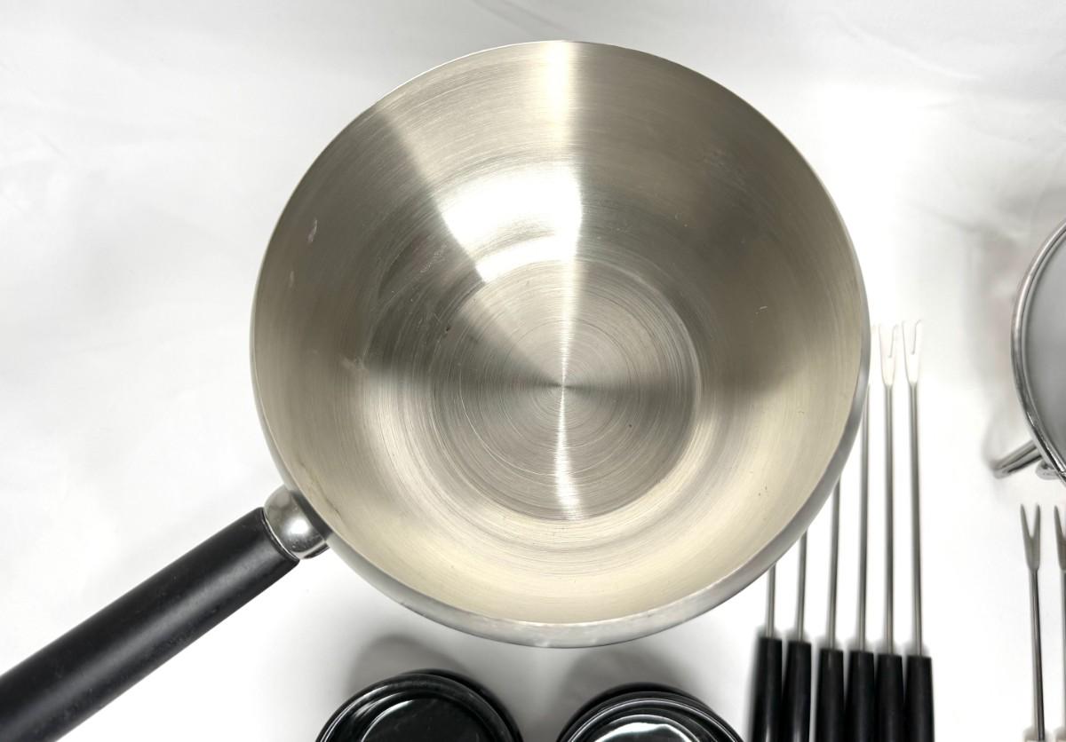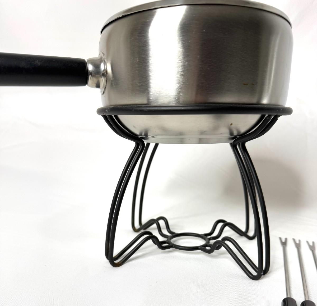 1. Ronco Stainless Steel Fondue Set with 6 Forks and 4 Ramekins. Pot measures 6-1/4" dia x 3-1/2" tall.