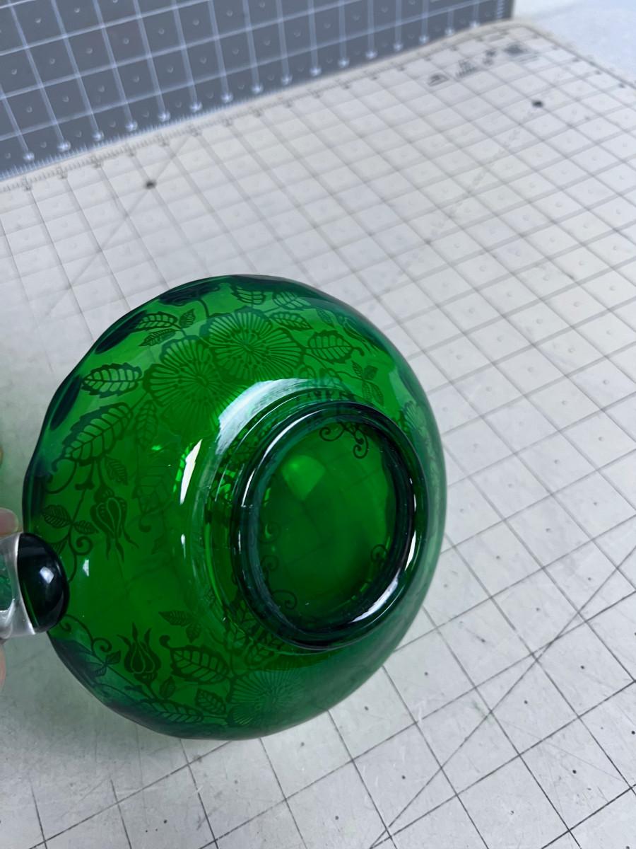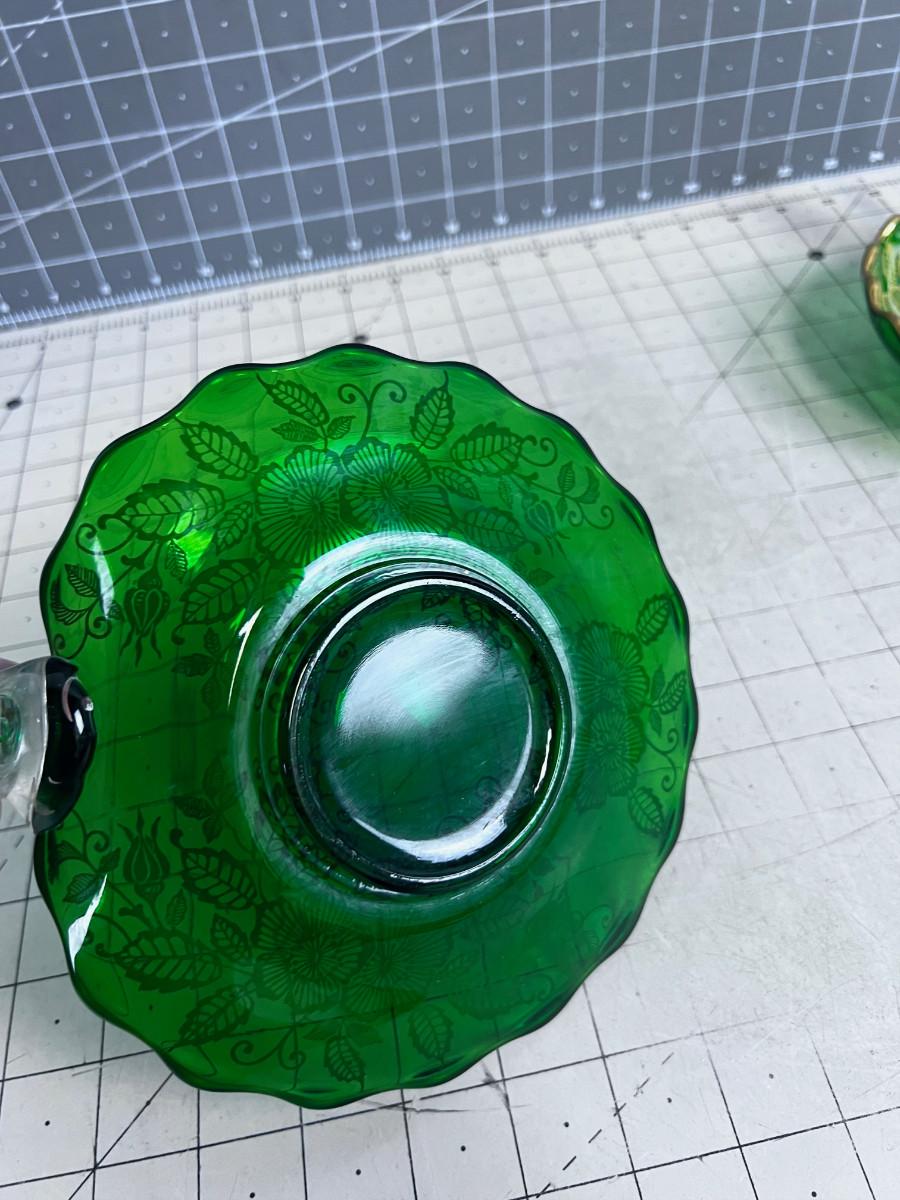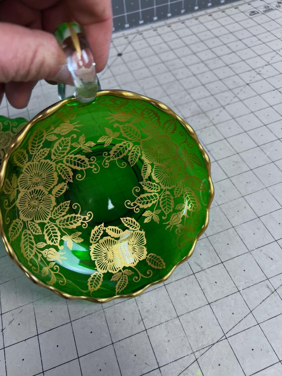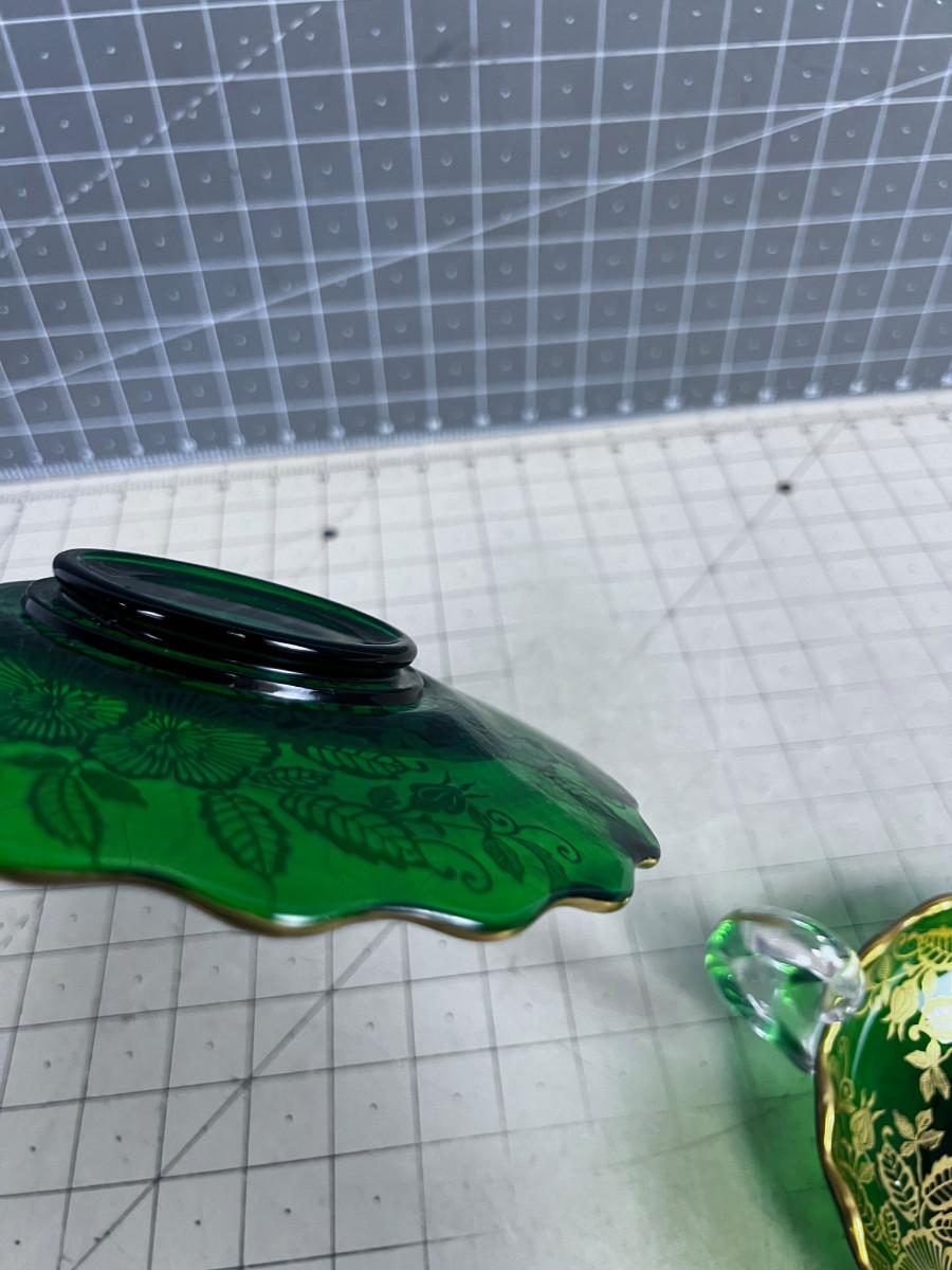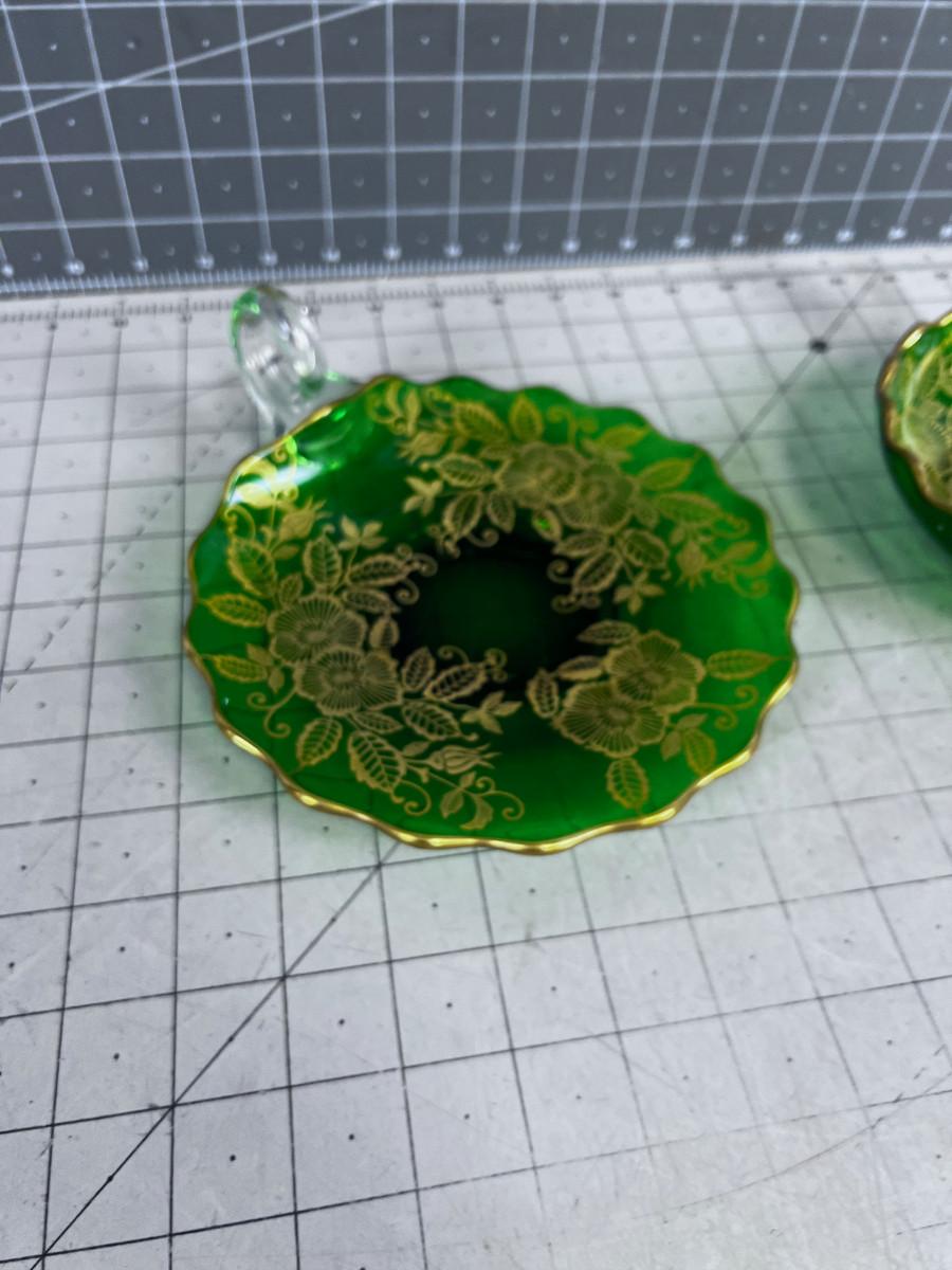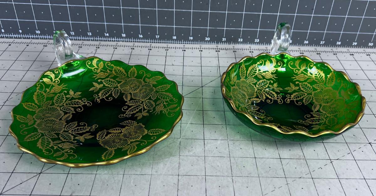 (2) Forest Green Glass Dish with a Handle and Gold Applique