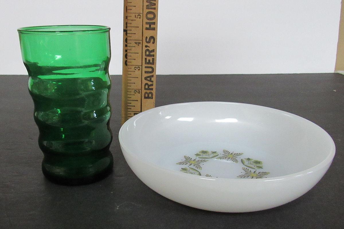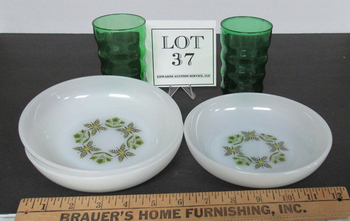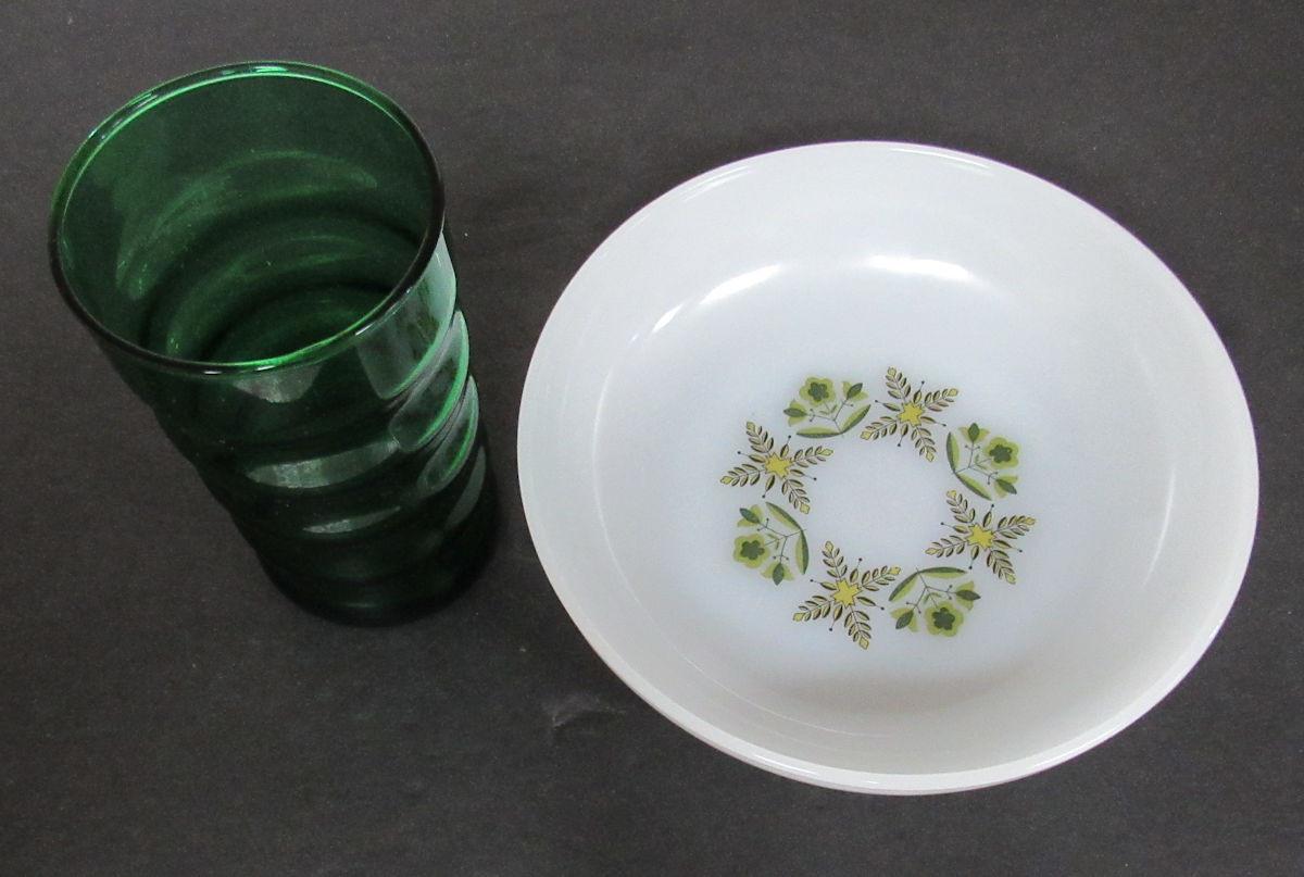 2 Forest Green Tumblers and 3 Anchor Hocking Green Meadow Cereal Bowls