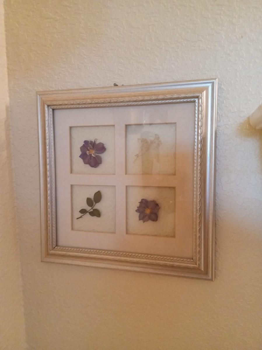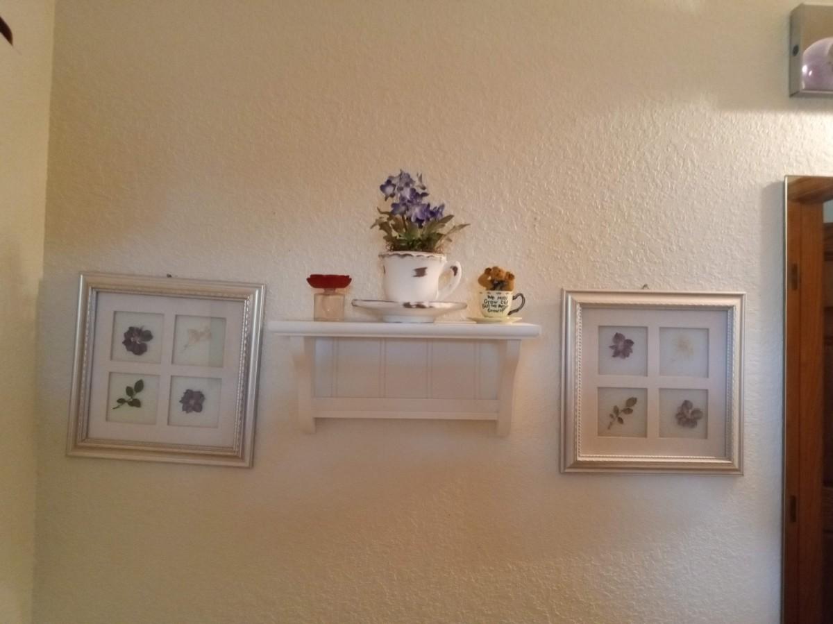 2 FRAMED DRIED FLOWERS, WALL SHELF WITH KNICK KNACKS