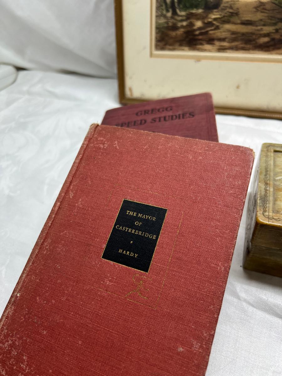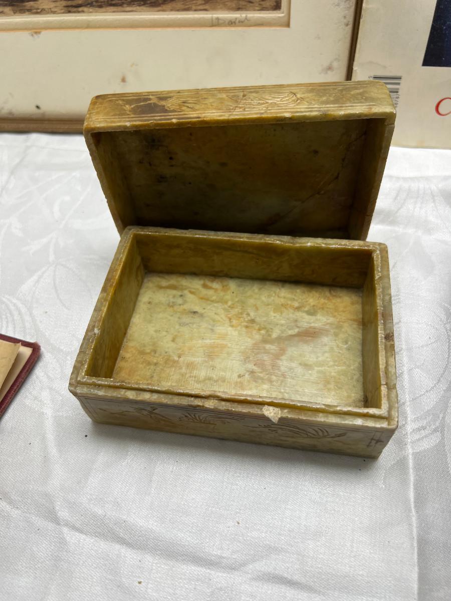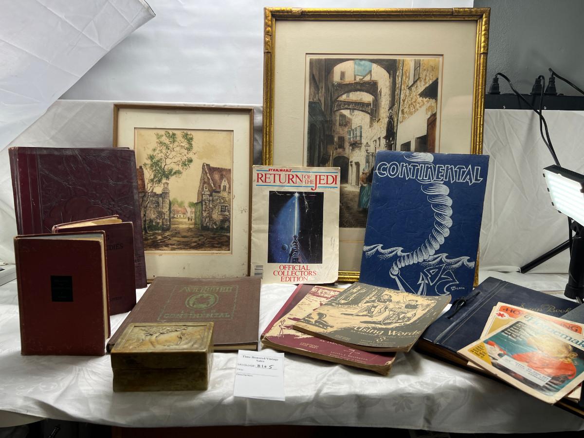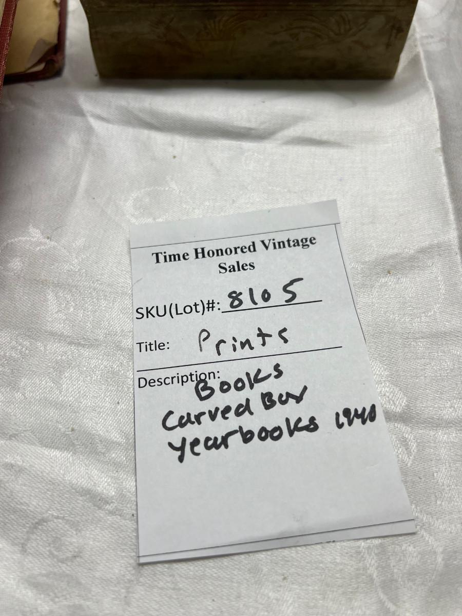 The smaller print is missing glass and the larger has slight damage to the frame. There is a "art cut" book made from Greggs shorthand. The scrapbook is vintage and unused. There is a carved stone Asian box that has been repaired. 3 yearbooks from Continental High in Los Angeles from the 1940s.3 vintage spelling and math books, used. Shipping would be expensive on this one due to the double boxing needed for glass in frame.