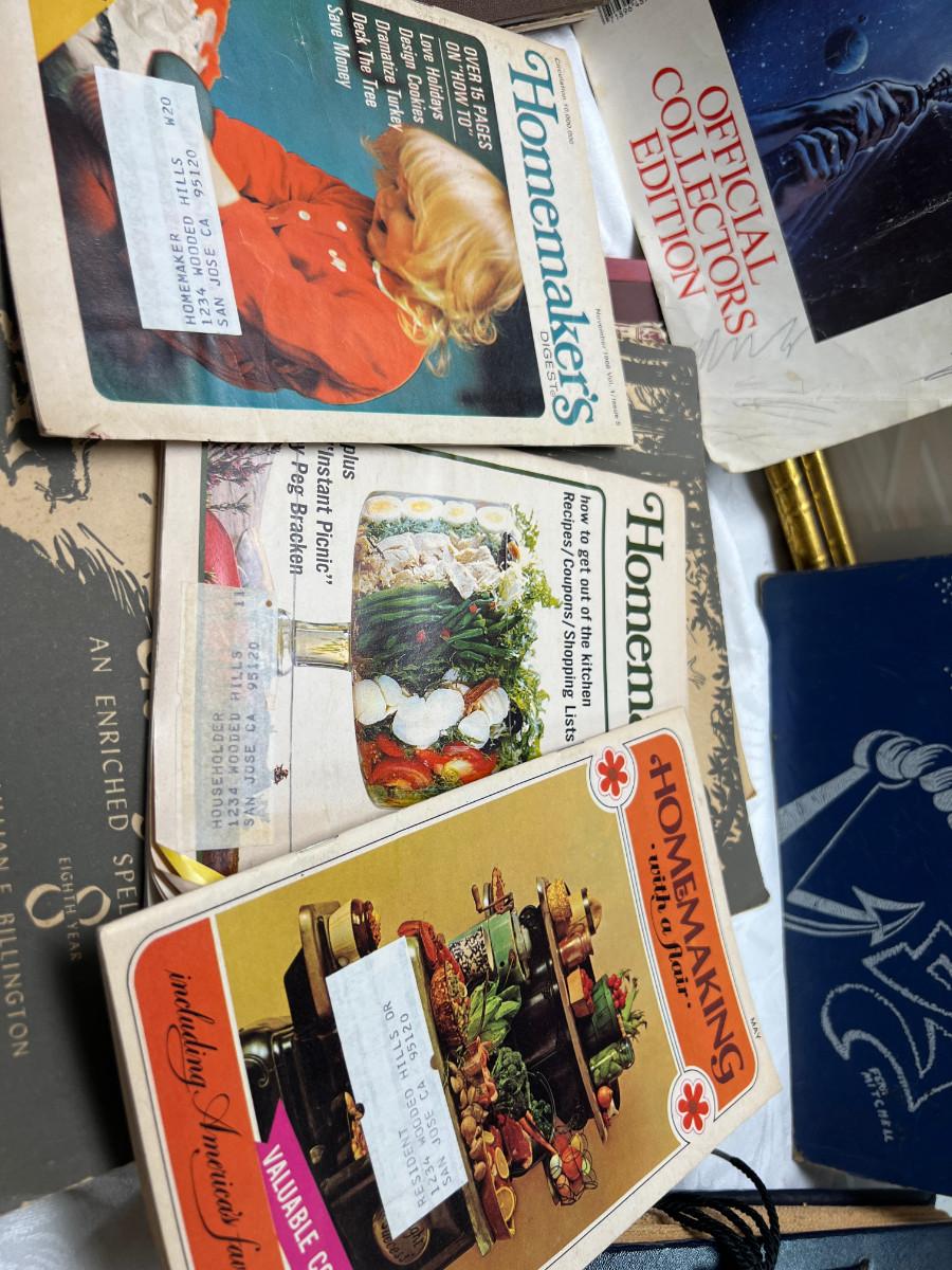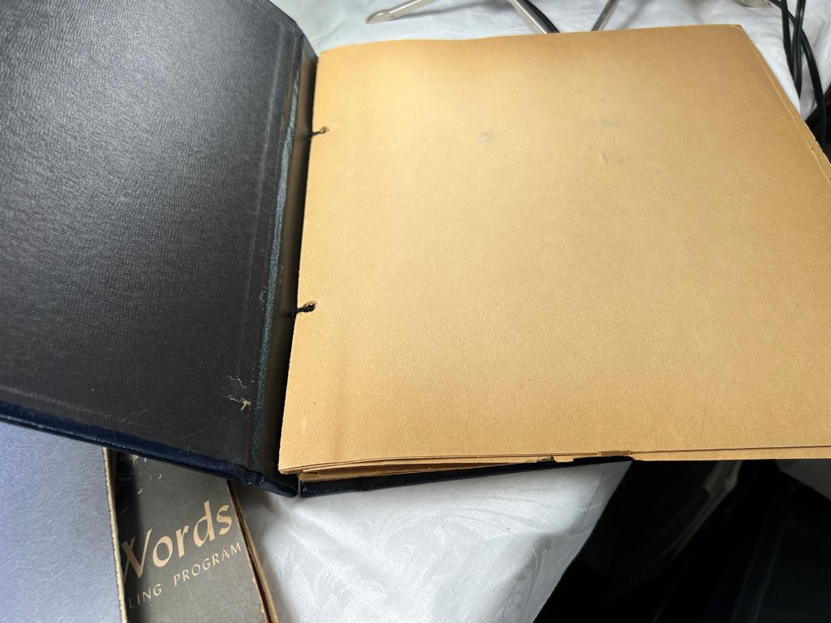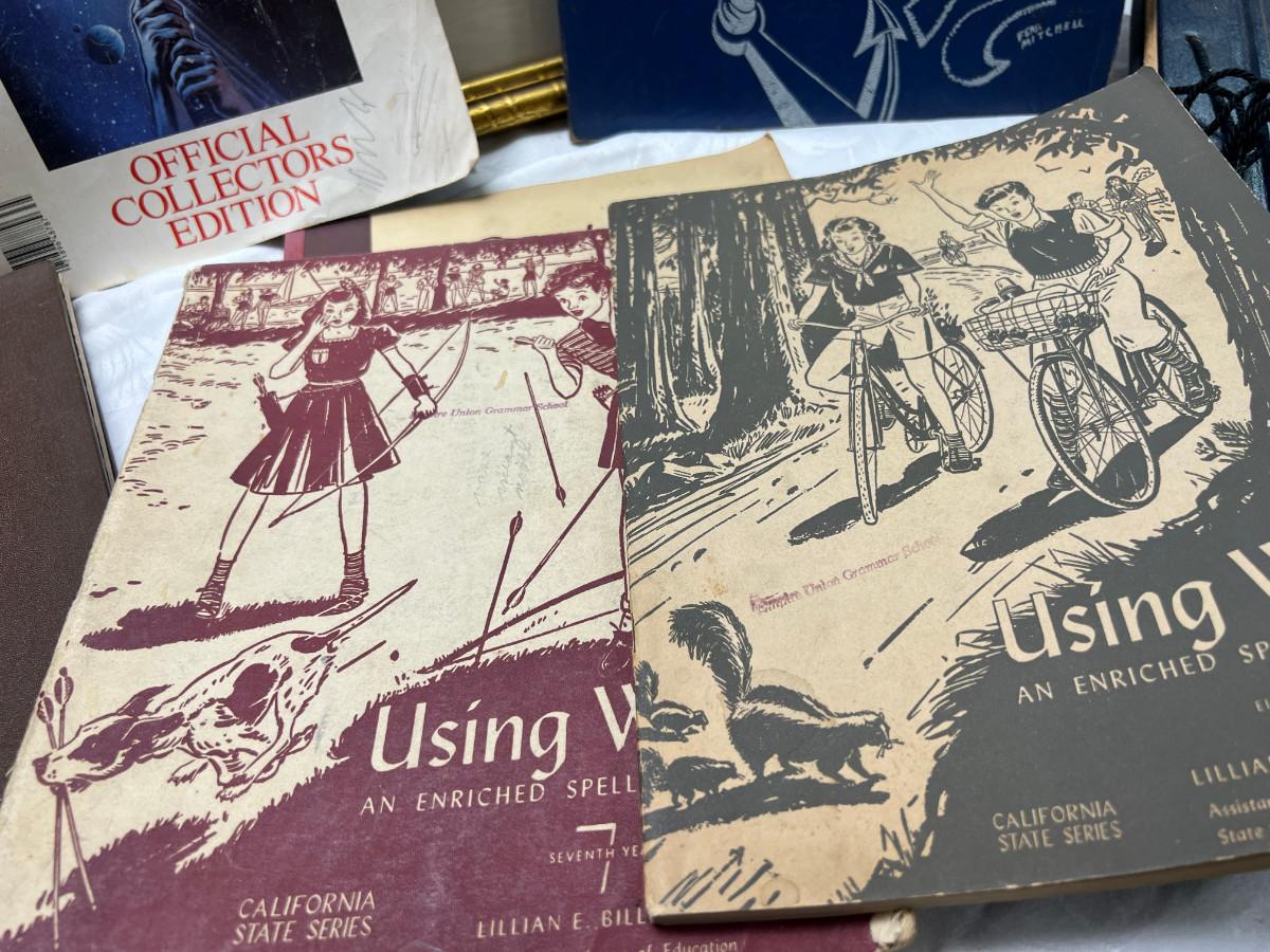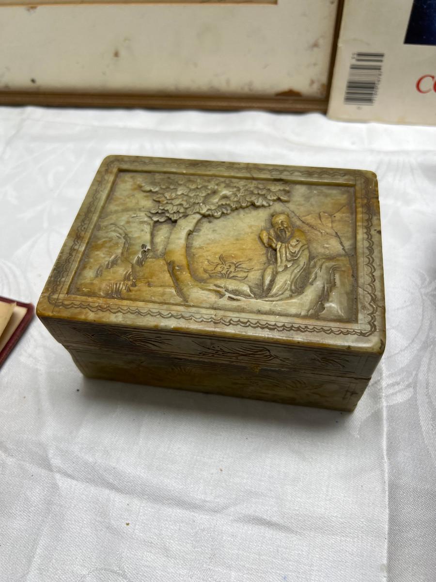 The smaller print is missing glass and the larger has slight damage to the frame. There is a "art cut" book made from Greggs shorthand. The scrapbook is vintage and unused. There is a carved stone Asian box that has been repaired. 3 yearbooks from Continental High in Los Angeles from the 1940s.3 vintage spelling and math books, used. Shipping would be expensive on this one due to the double boxing needed for glass in frame.