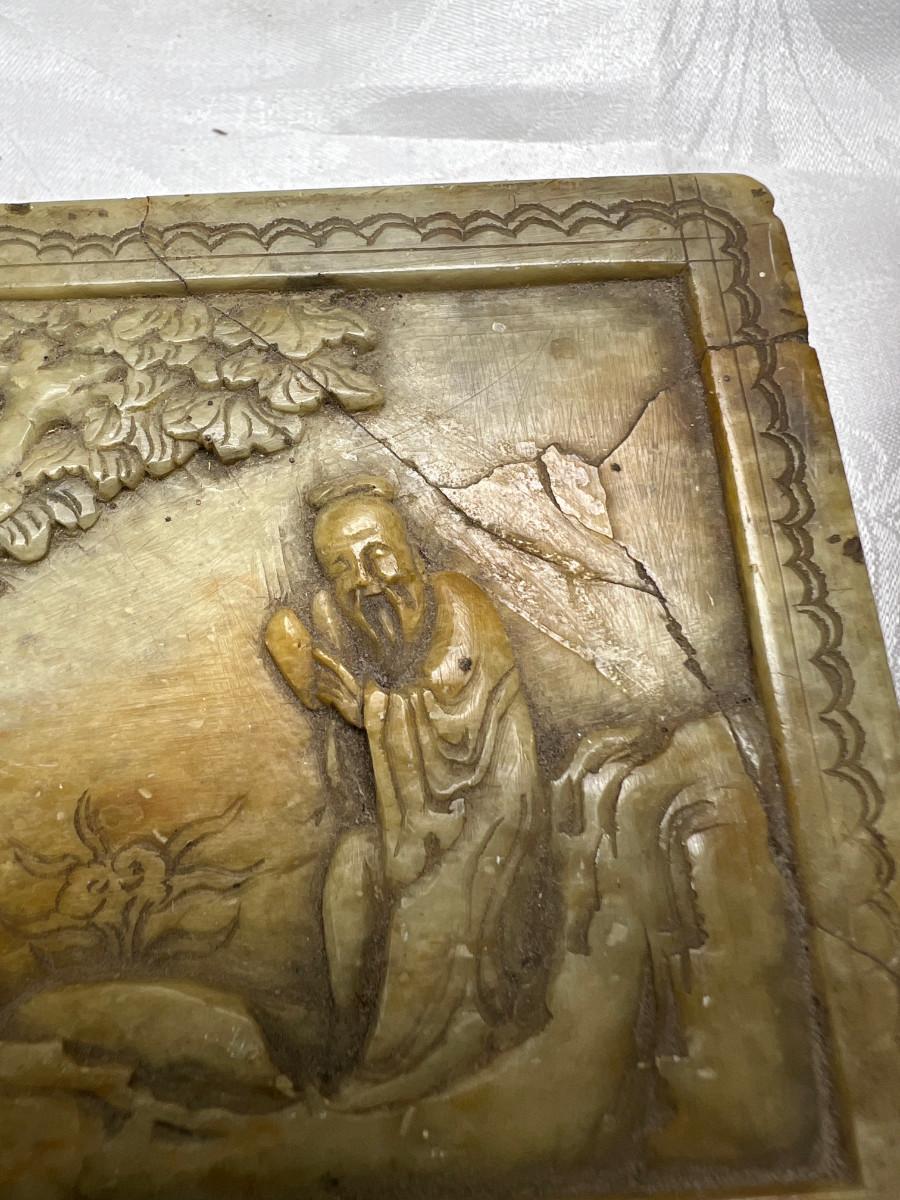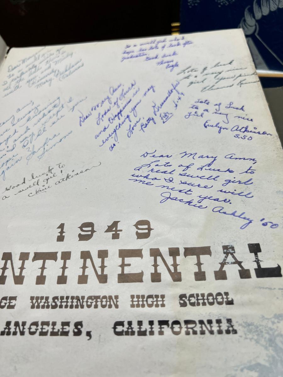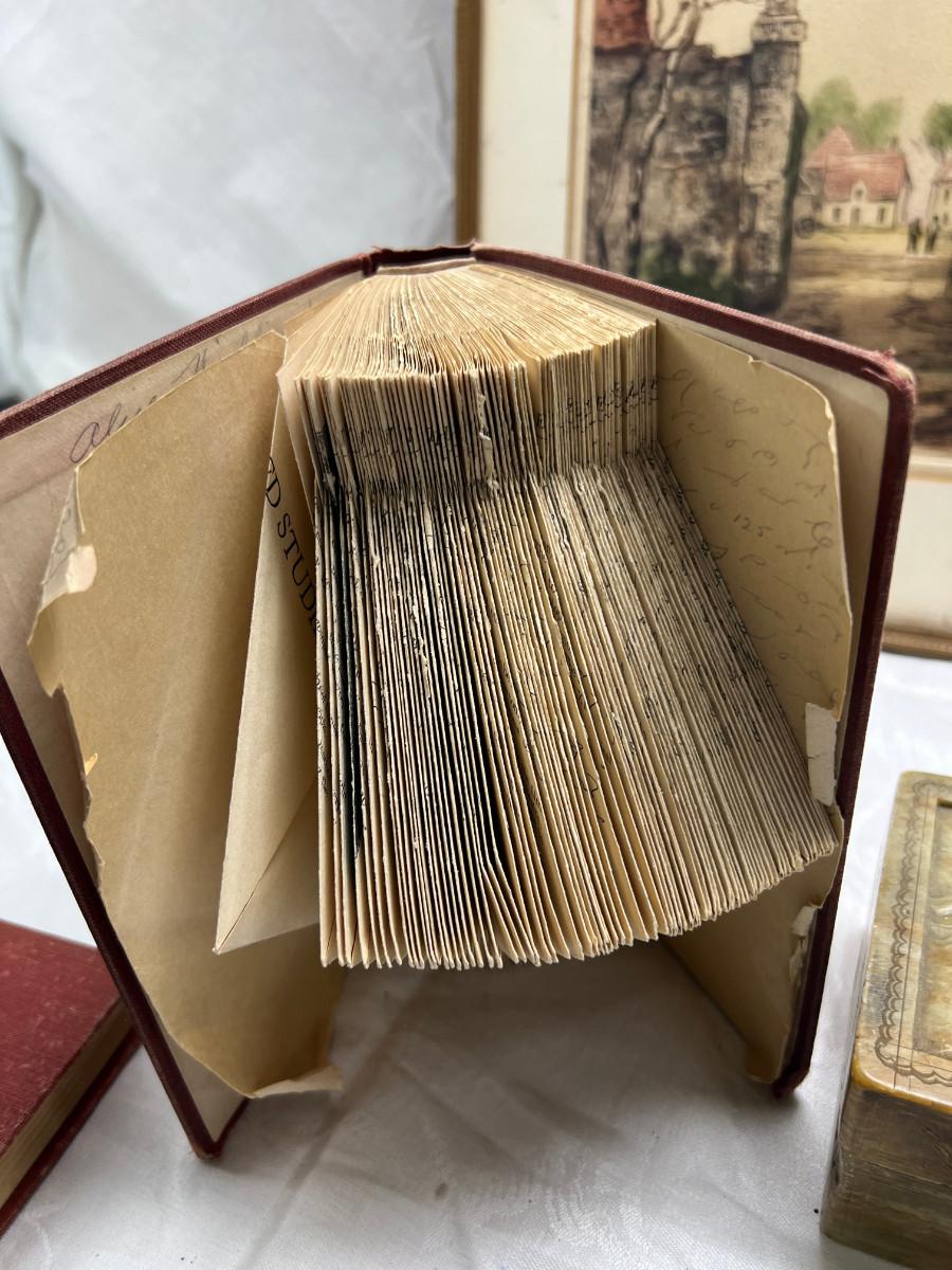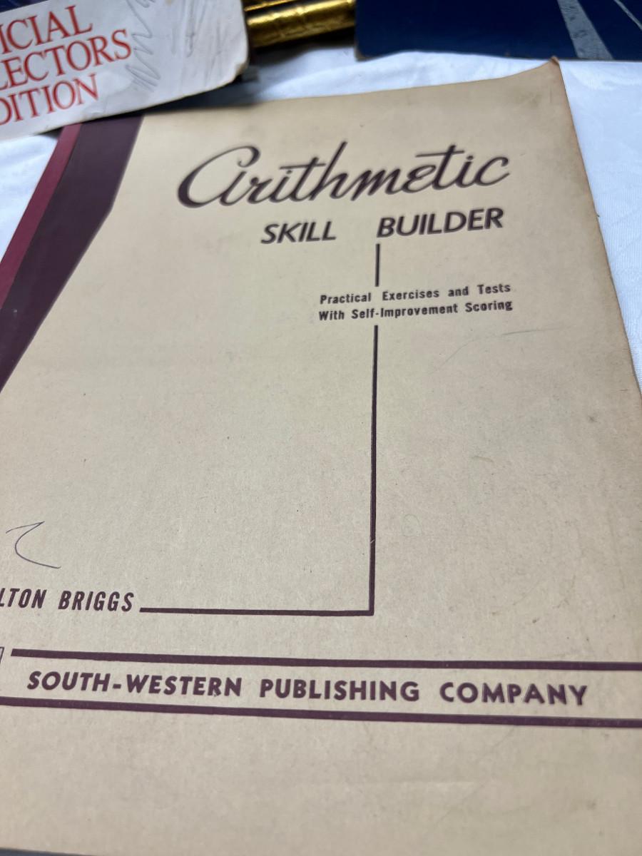 The smaller print is missing glass and the larger has slight damage to the frame. There is a "art cut" book made from Greggs shorthand. The scrapbook is vintage and unused. There is a carved stone Asian box that has been repaired. 3 yearbooks from Continental High in Los Angeles from the 1940s.3 vintage spelling and math books, used. Shipping would be expensive on this one due to the double boxing needed for glass in frame.
