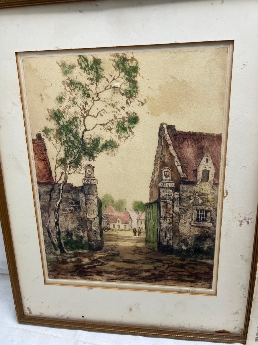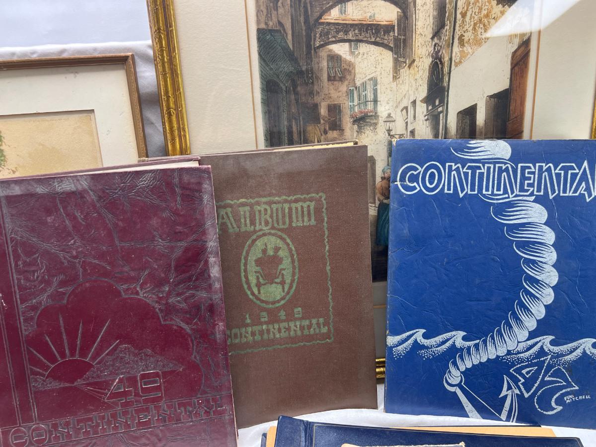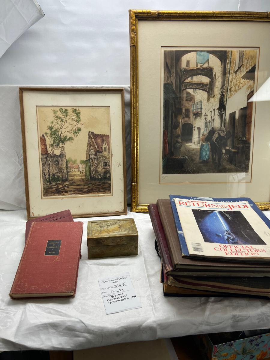2 framed Etchings, vintage books, yearbooks