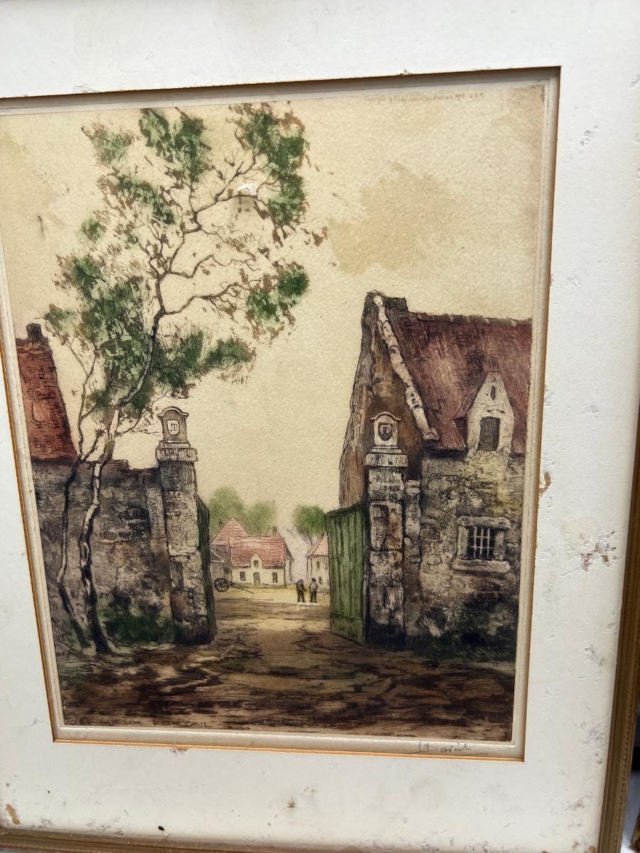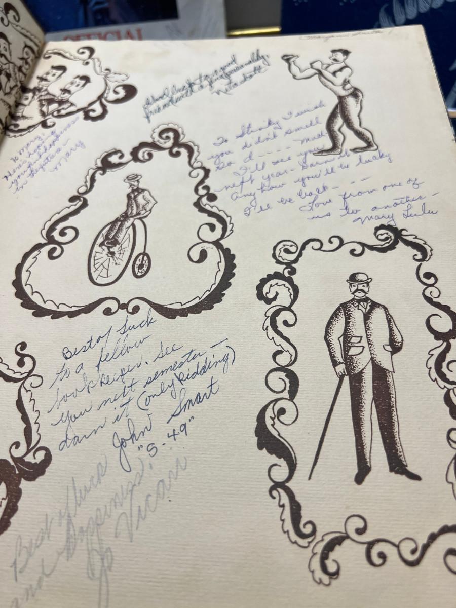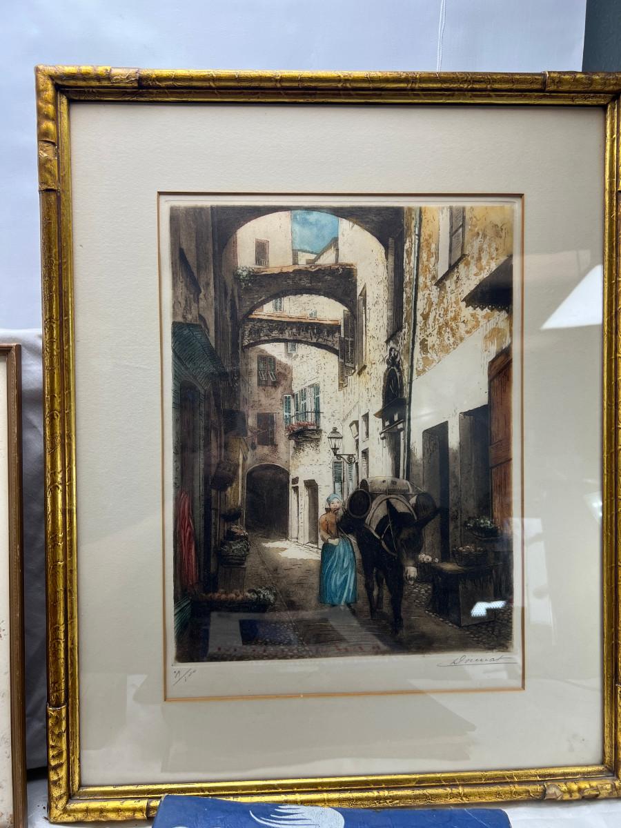 2 framed Etchings, vintage books, yearbooks
