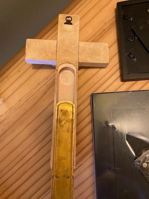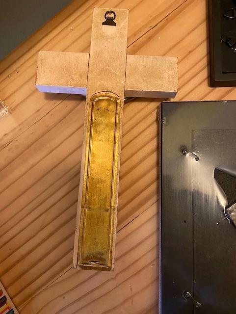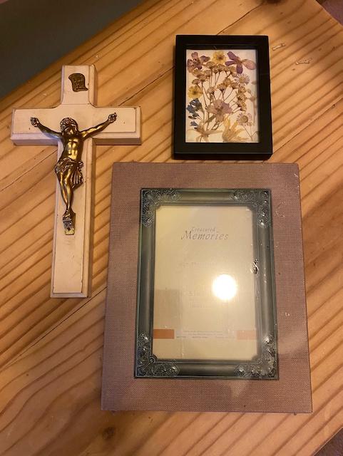 2 frames and a crucifix - the crucifix is a 'sick call' crucifix. This type of crucifix was hung on the wall of a person’s home (usually above the bed). Within the compartment were two candles, a small bottle of holy water and sometimes a white cloth. The purpose of the sick-call crucifix is to facilitate the ritual connected to the Anointing of the Sick.