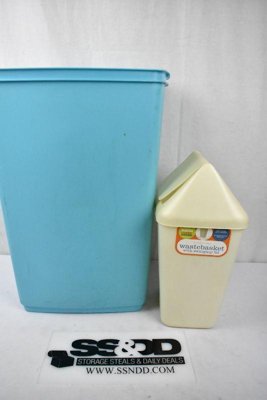 2 Garbage Cans. Light Blue no lid. Light yellow with lid