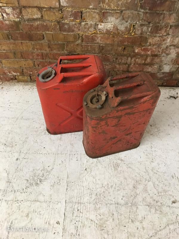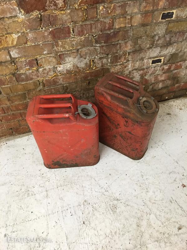 Two used metal 5 gallon gas cans or Jerry cans.