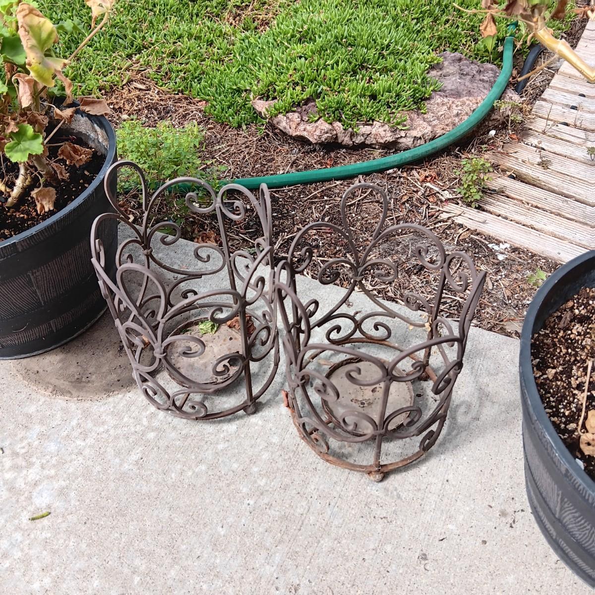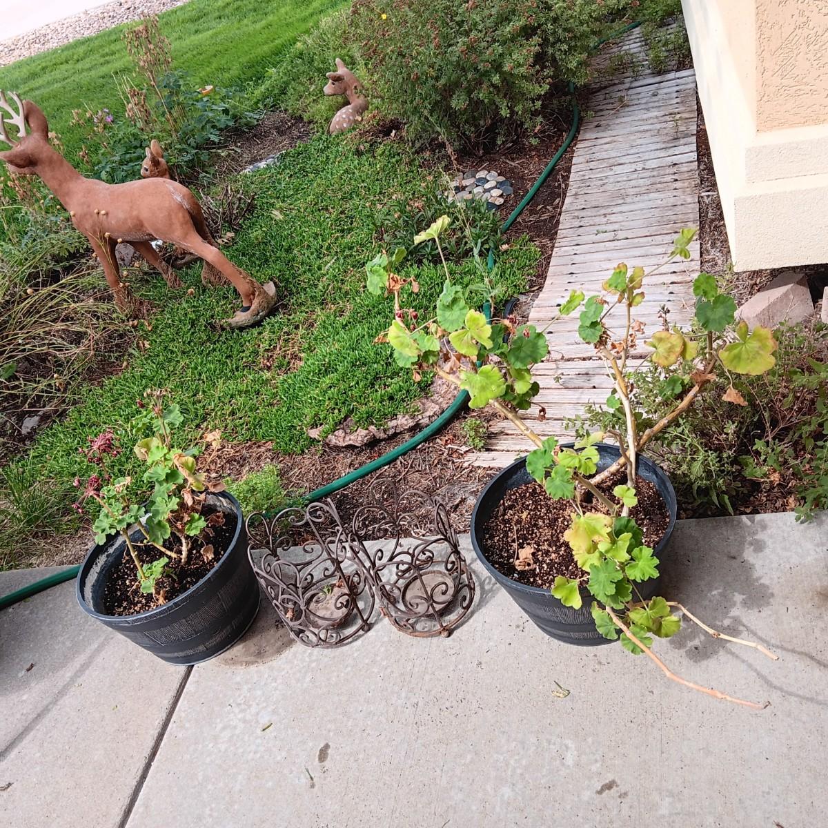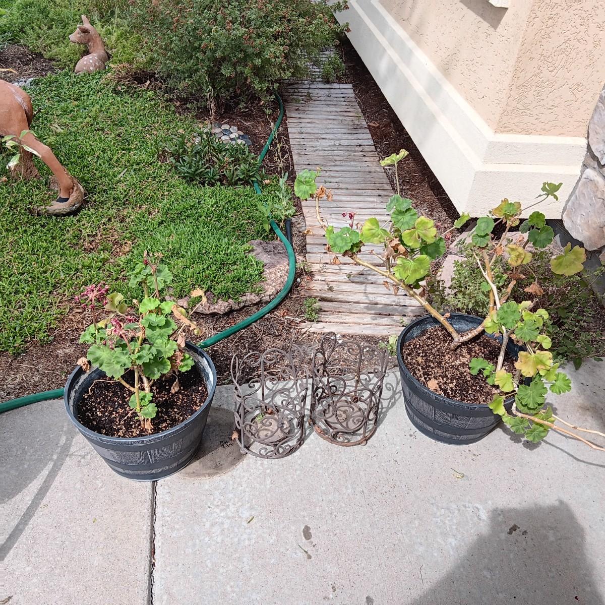 2 GERANIUM PLANTS IN NEED OF TLC AND 2 METAL CANDLE LANTERNS