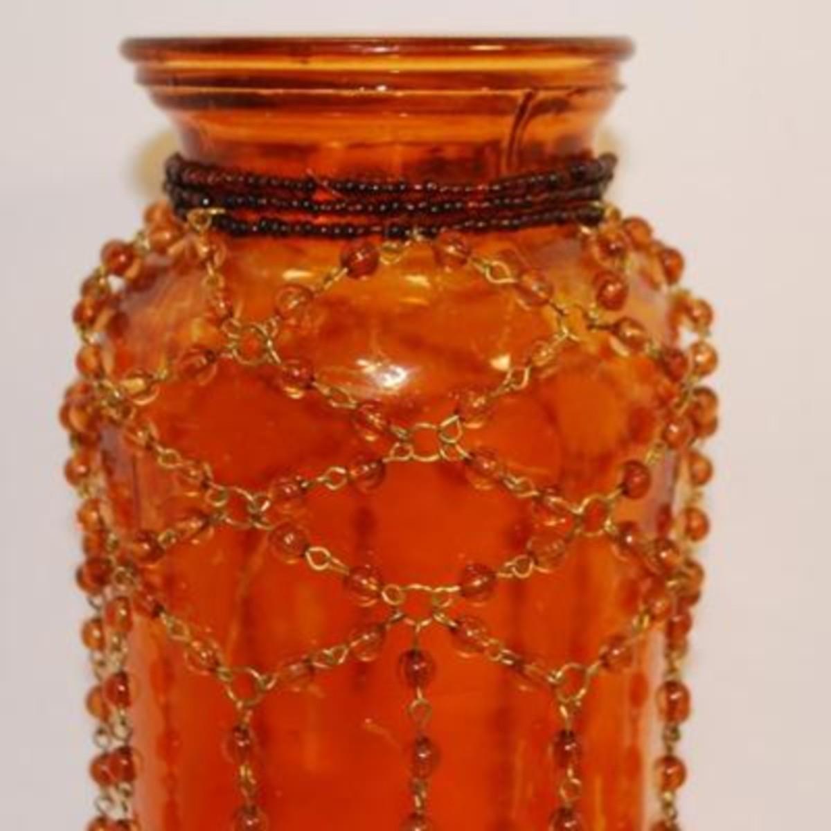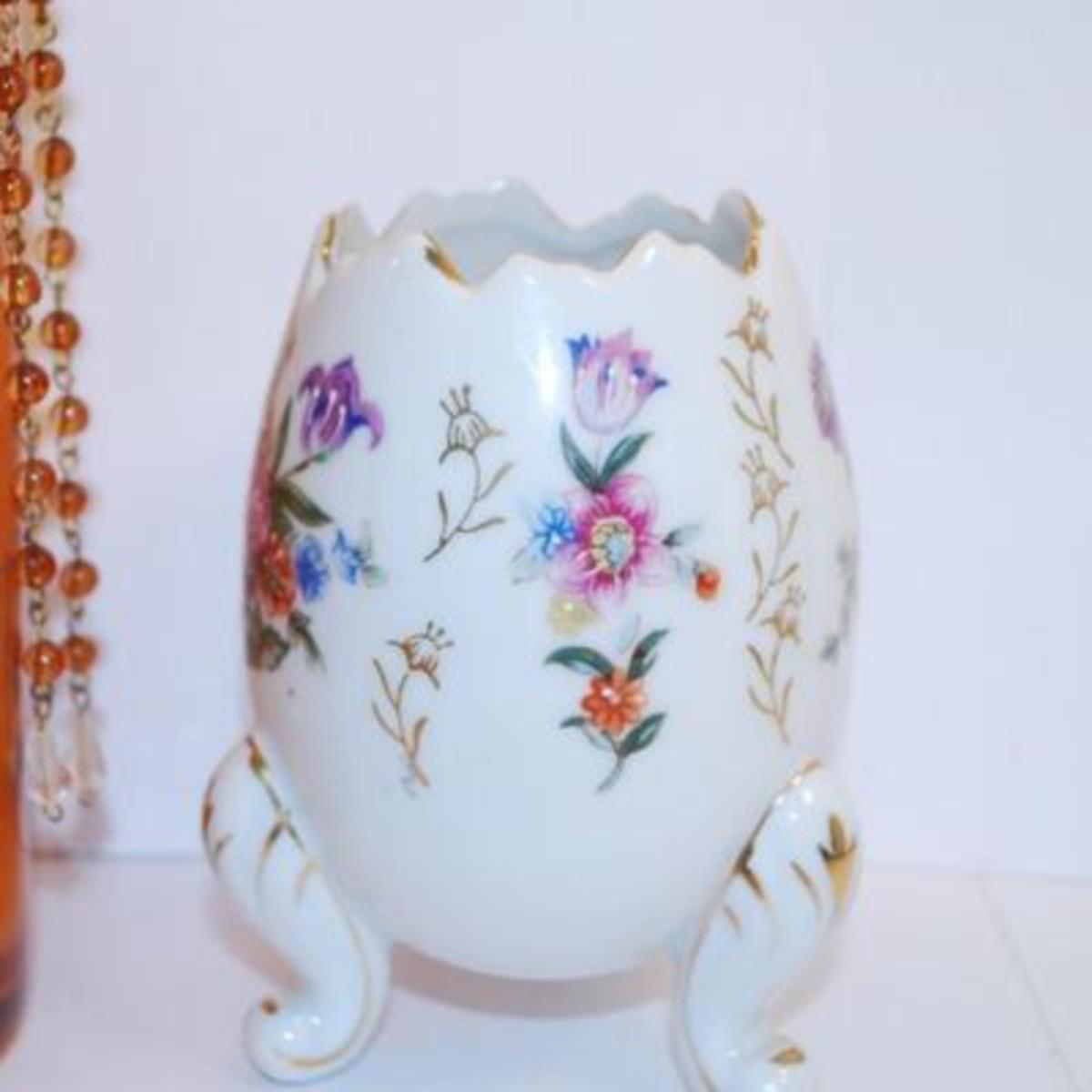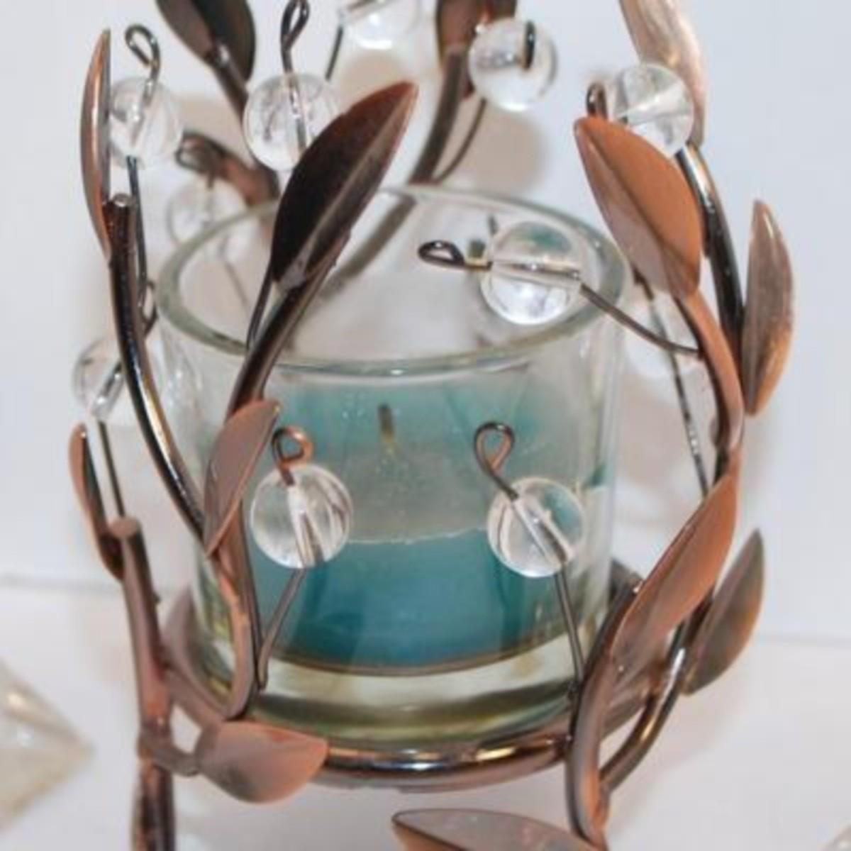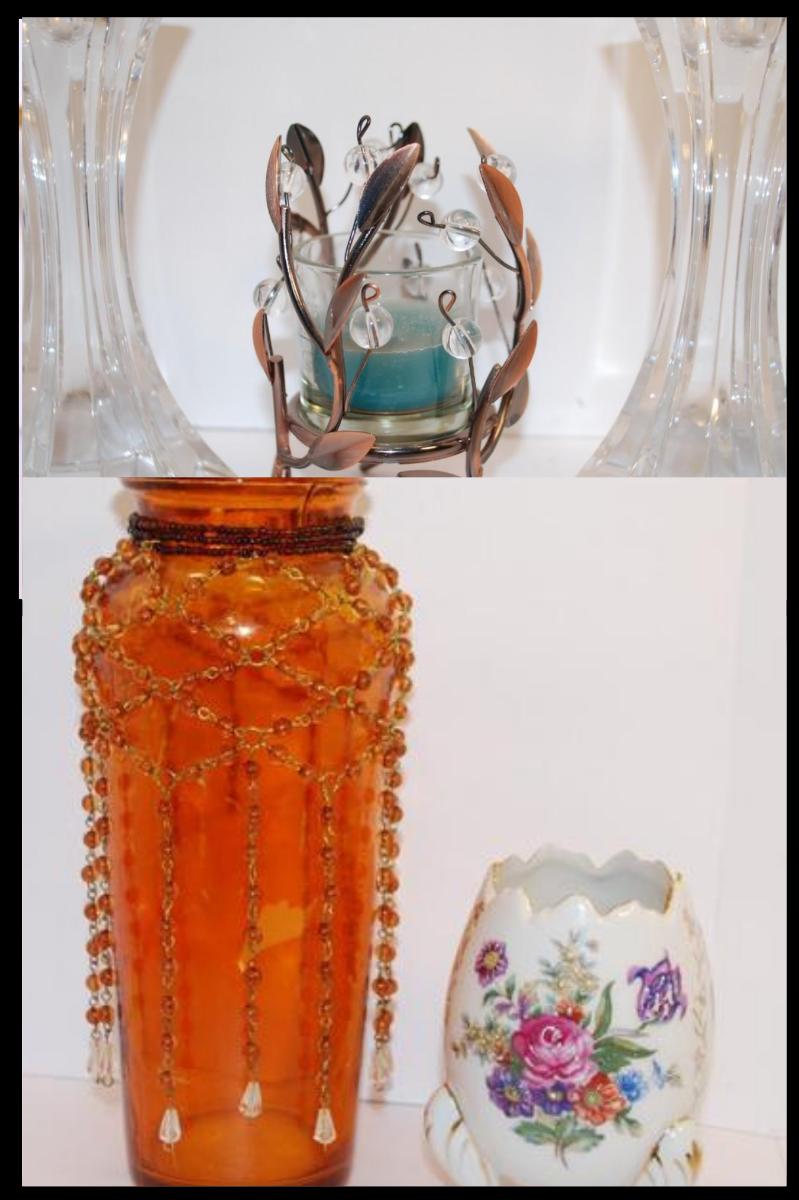 2 Glass Candlesticks ( 6" H) & Metal Votive Cup & Dangle Orange Vase (10"H) with Egg Shaped Planter (5"H)
