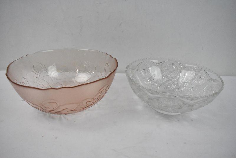 2 Glass Decorative Bowls: Smoky Pink & Clear Cut Glass