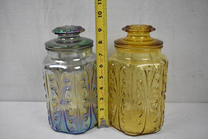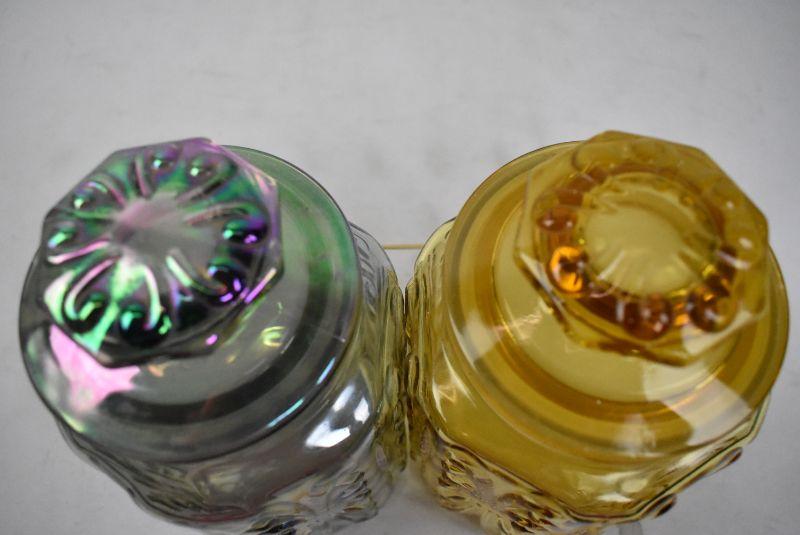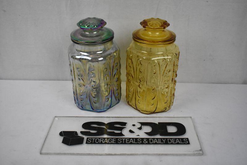 2 Glass Jars. Same Shape, 1 iridescent/festival color, 1 yellow/brown/amber