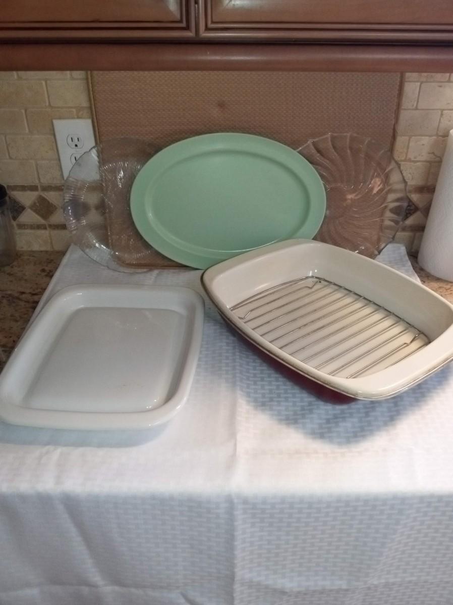 2 GLASS PLATTERS, MALLO WARE PLATTER AND 2 BAKING DISHES