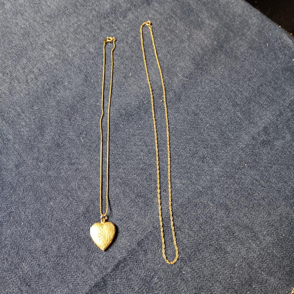 2 GOLD TONE CHAINS AND A HEART LOCKET