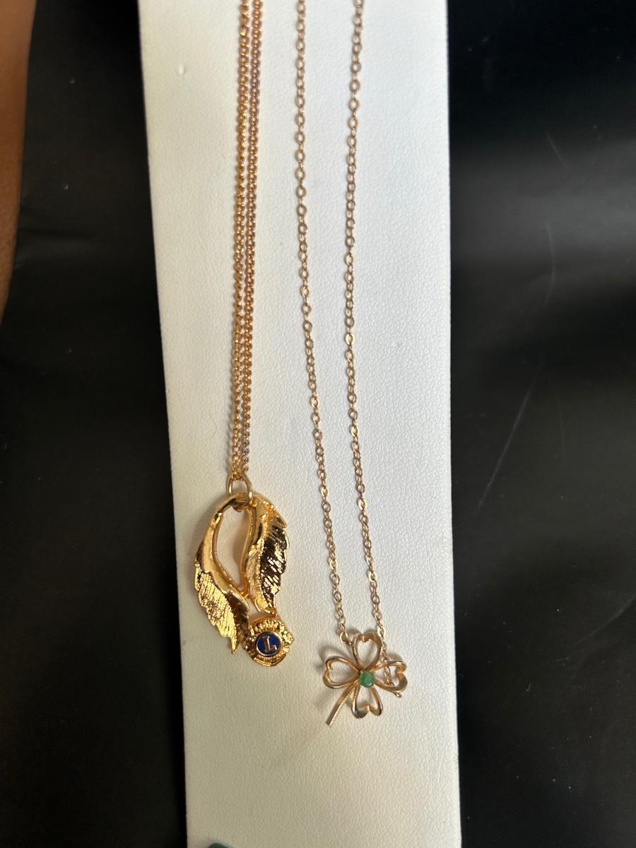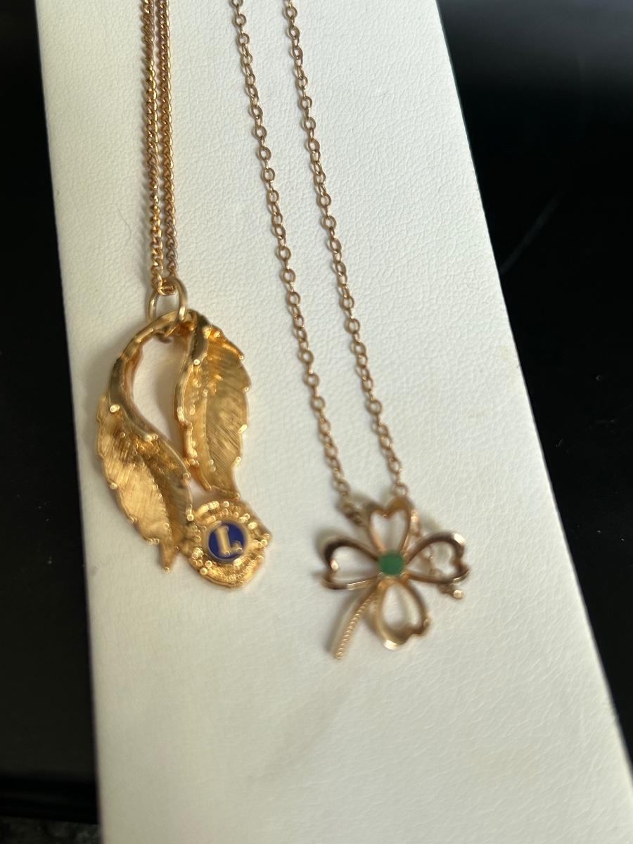 The 4 leaf clover is 14k gold filled & the green stone may be an emerald. The other necklace w/ an “L” on it has no markings.