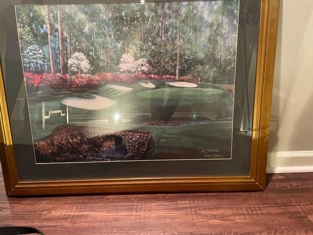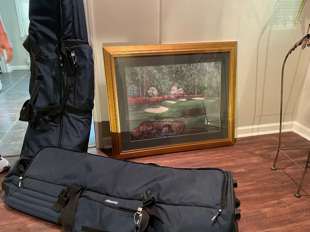 2 Golf Travel Bags and Framed Augusta Golf Course Print