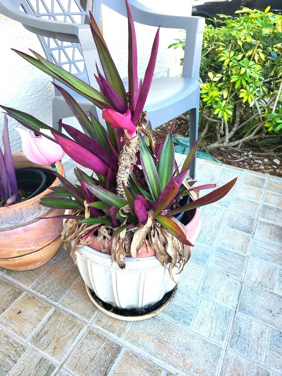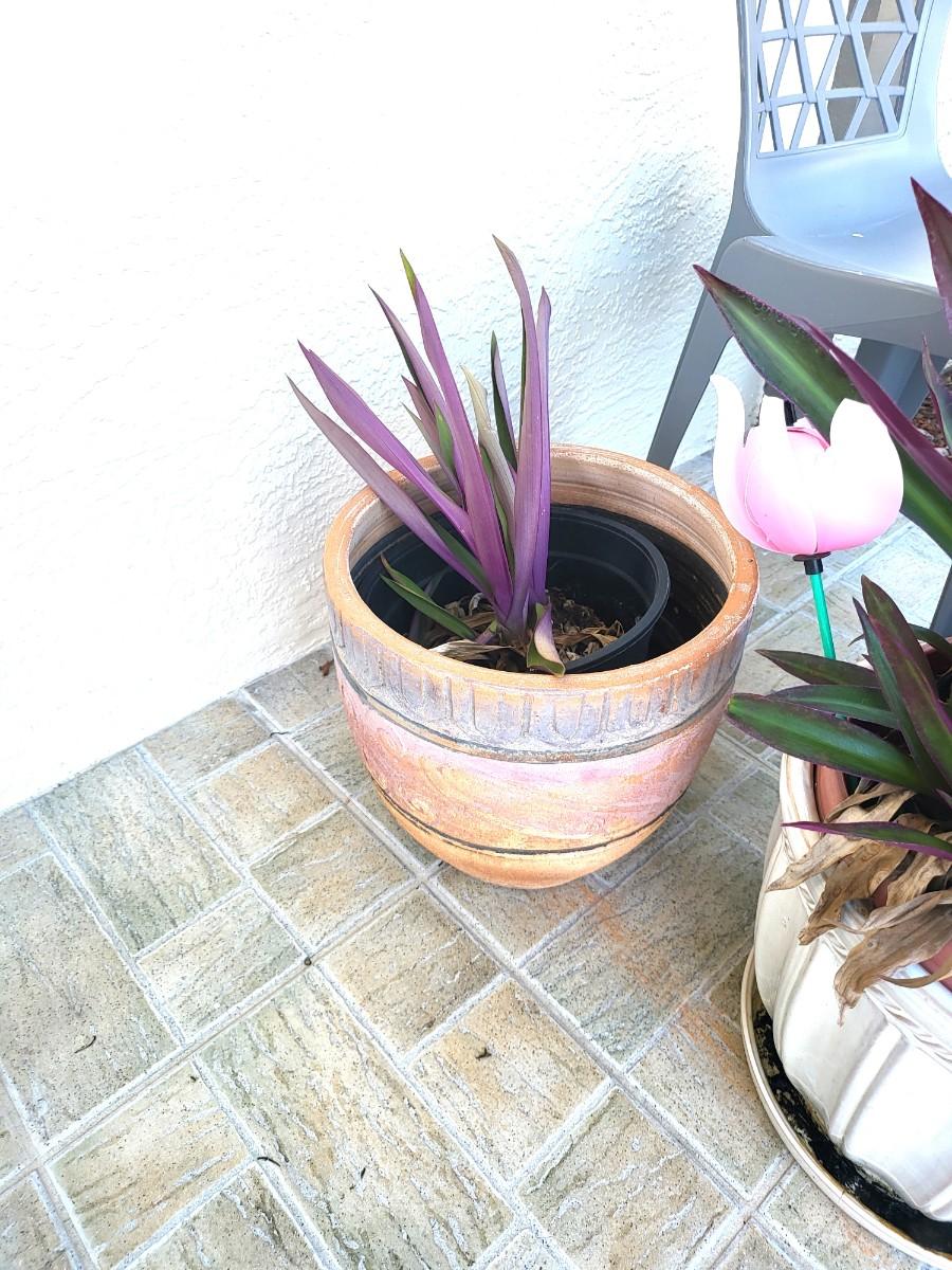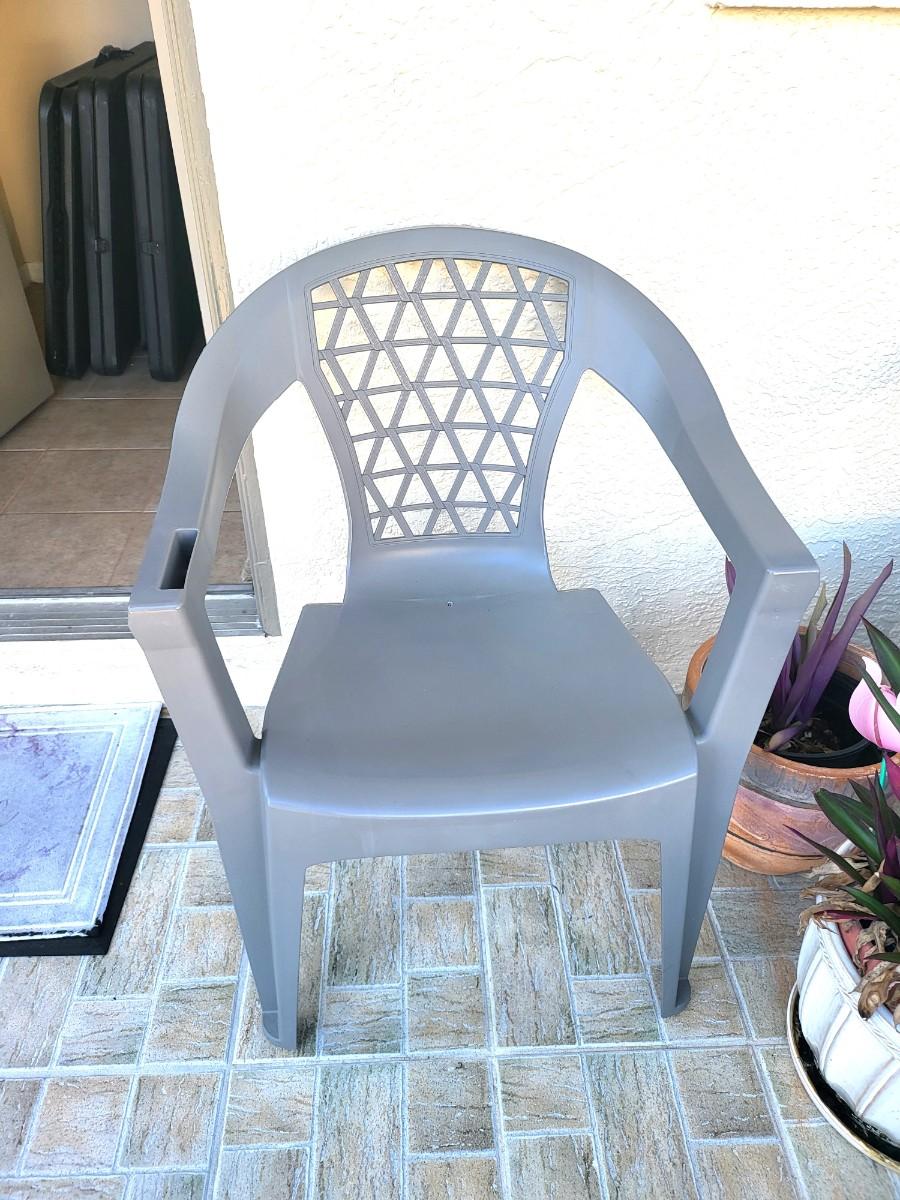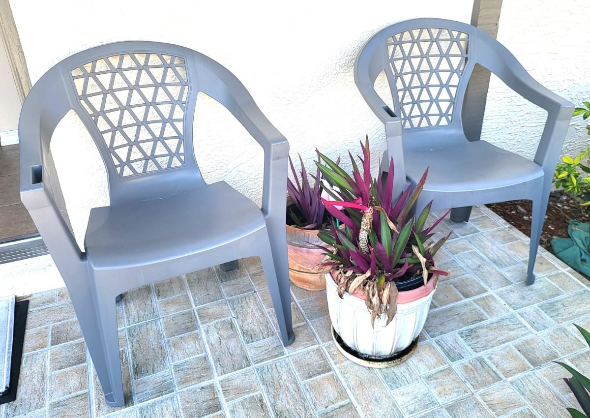 2 Gray Outdoor Chairs with 2 Potted Plants