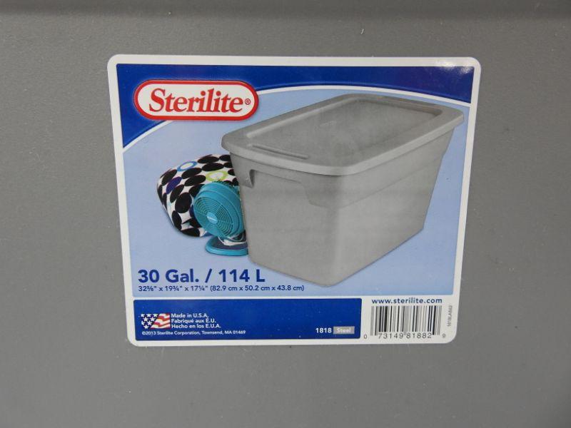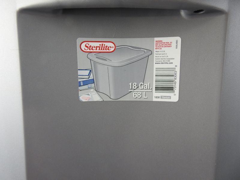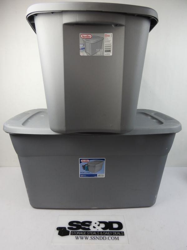 2 Gray Sterilite Bins: 18 Gallons and 30 Gallons