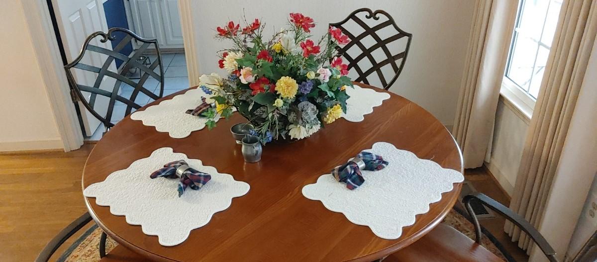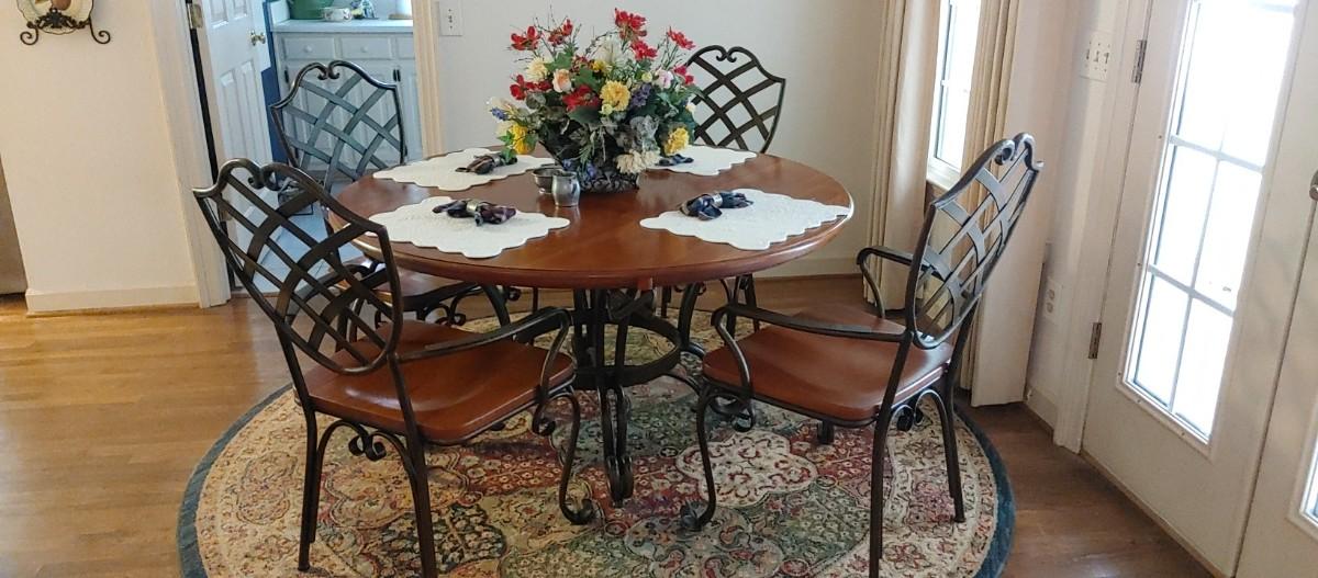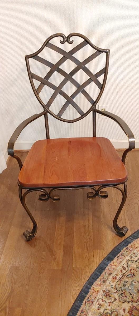 Beautiful ornate wood and wrought iron round table and 4 chairs excellent condition by Keller furniture. Keller is known for fine quality made furniture.