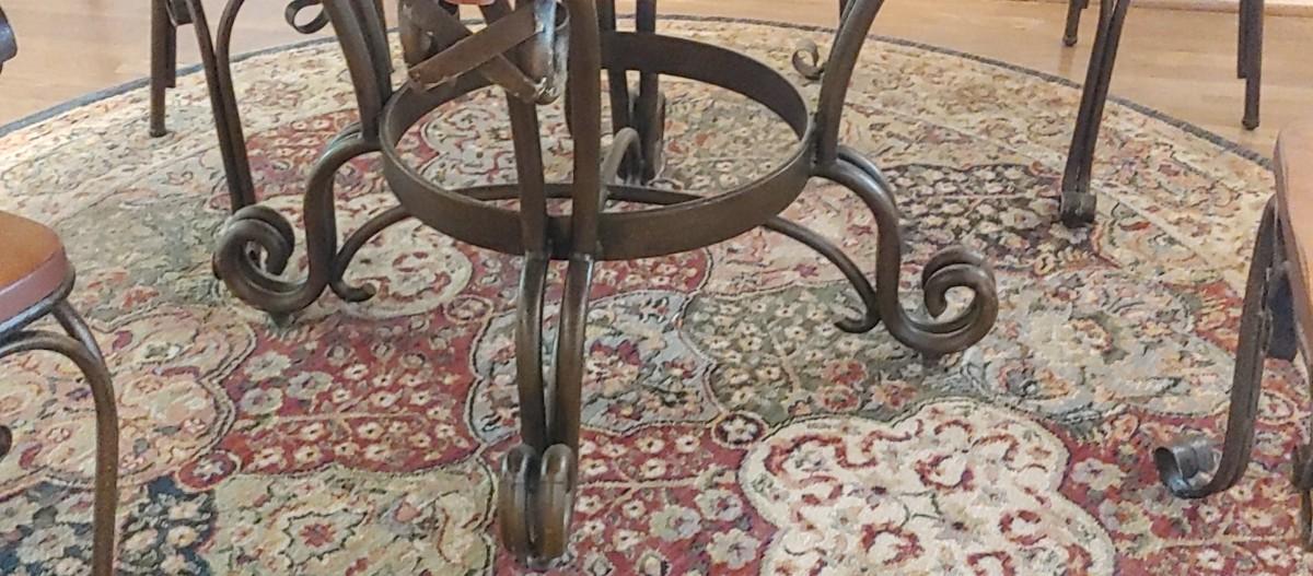Ornate wrought iron accents on the table & chairs. Chairs & table super heavy high quality. Other items in the pictures to list separately.