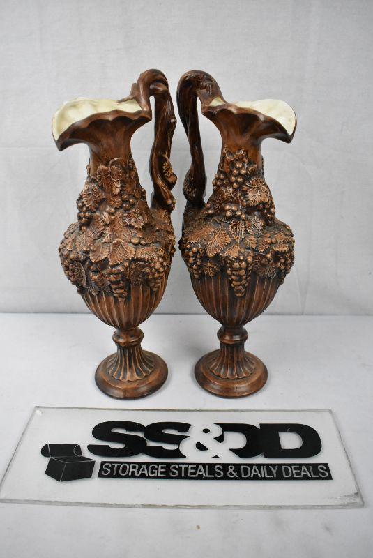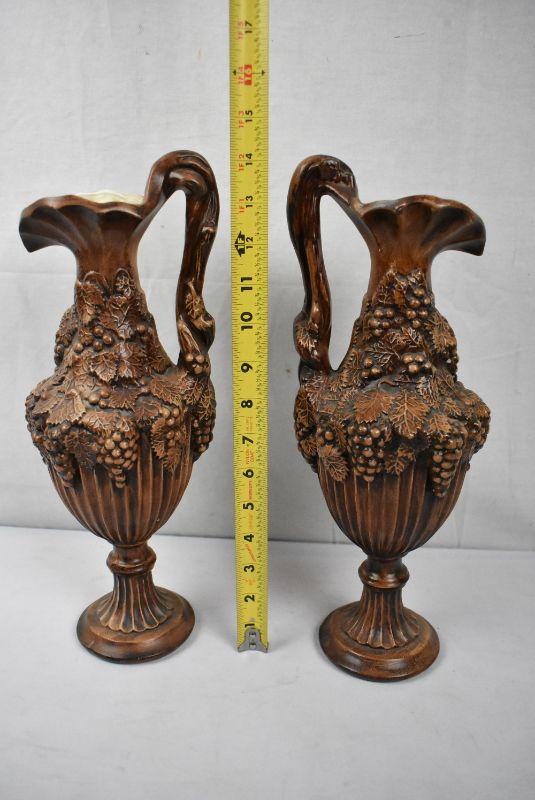 2 Greek Vases/Pitchers, Bronze/Cream Painted Ceramic, Grapes & Leaves - Vintage
