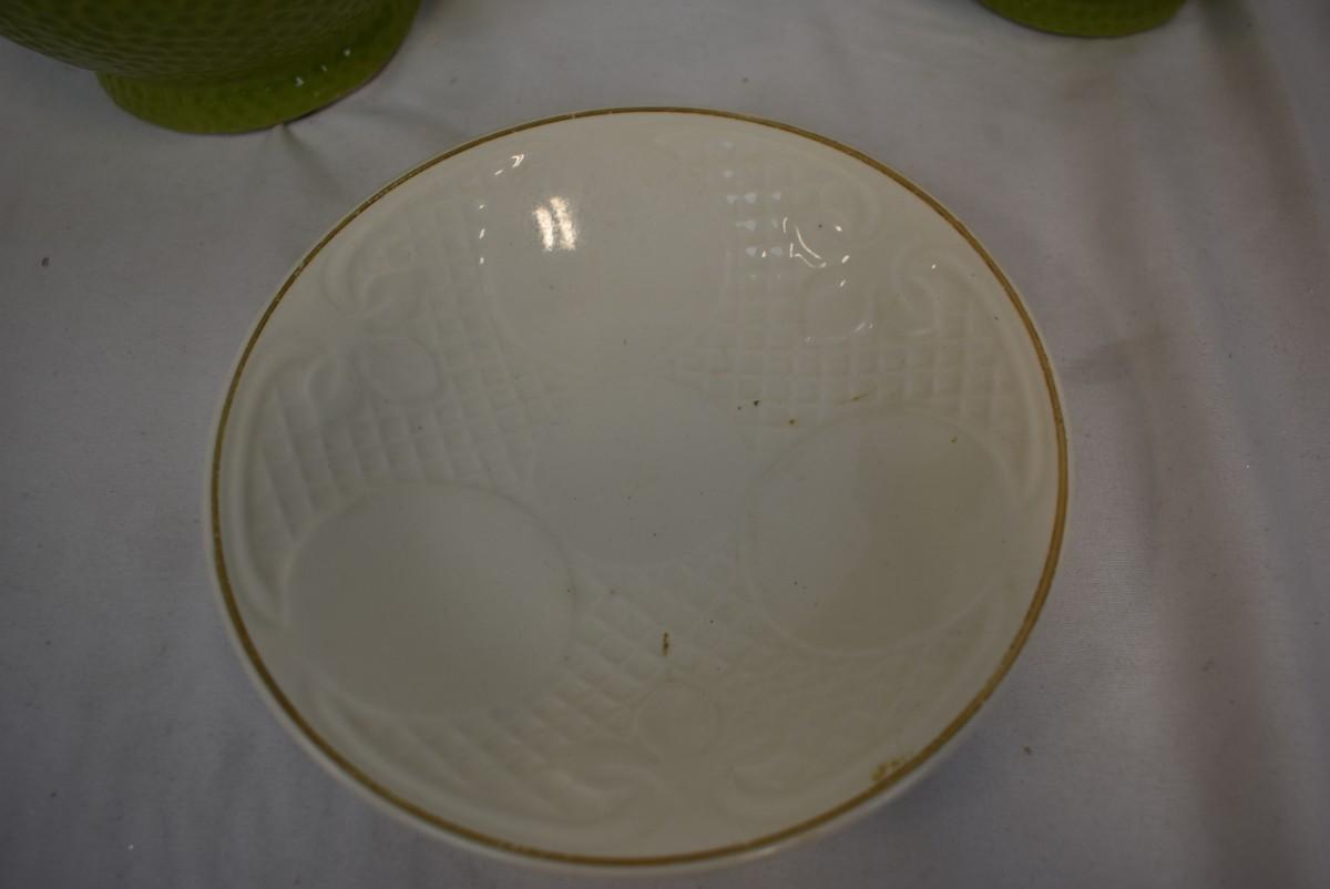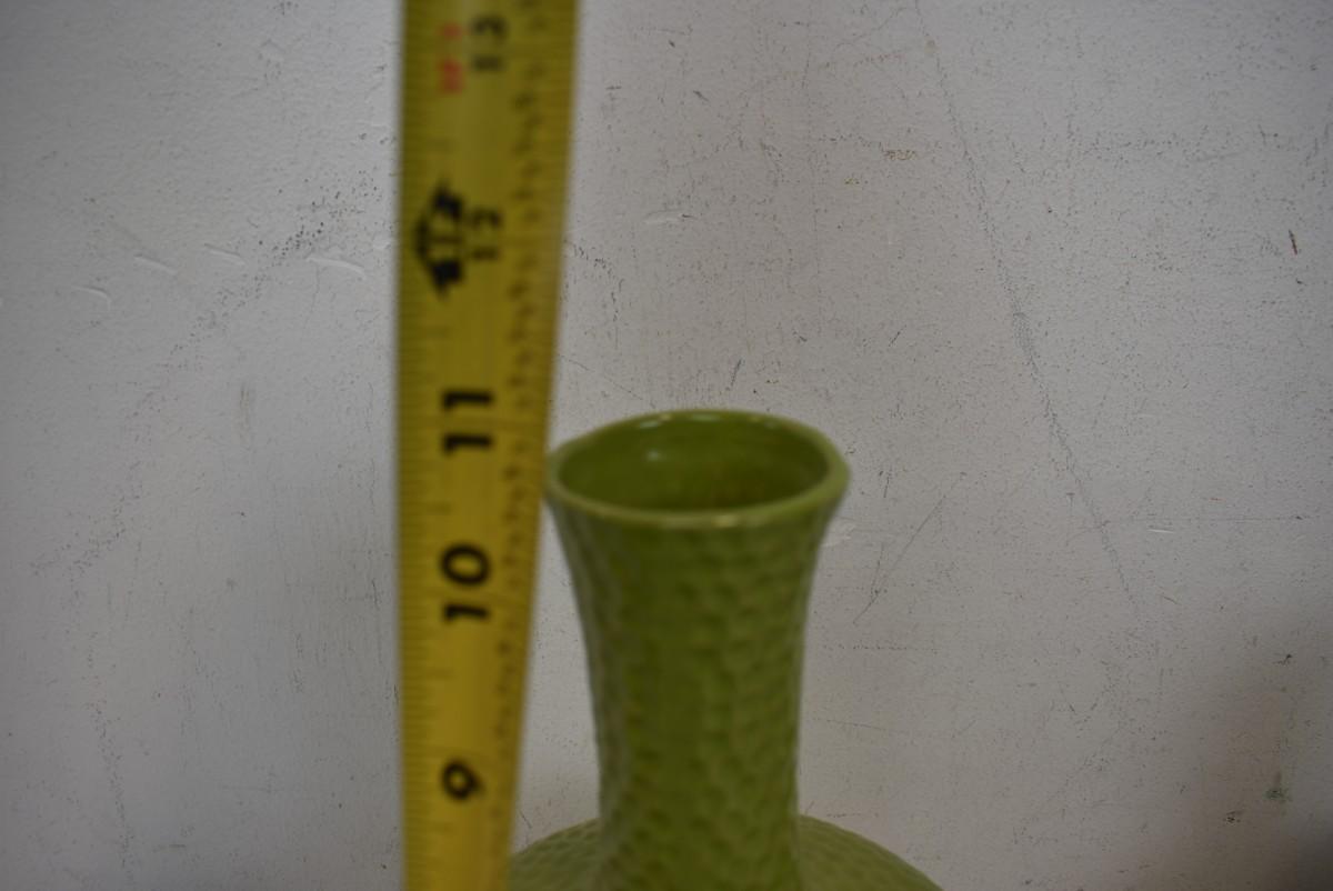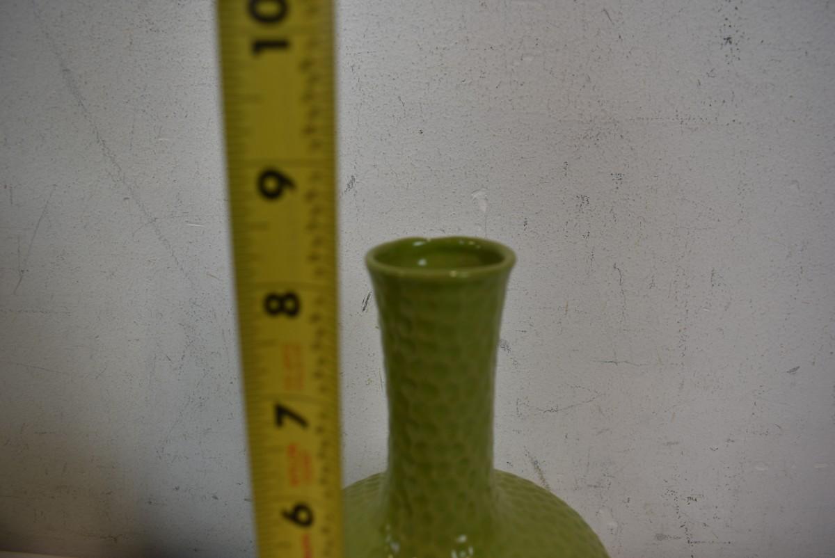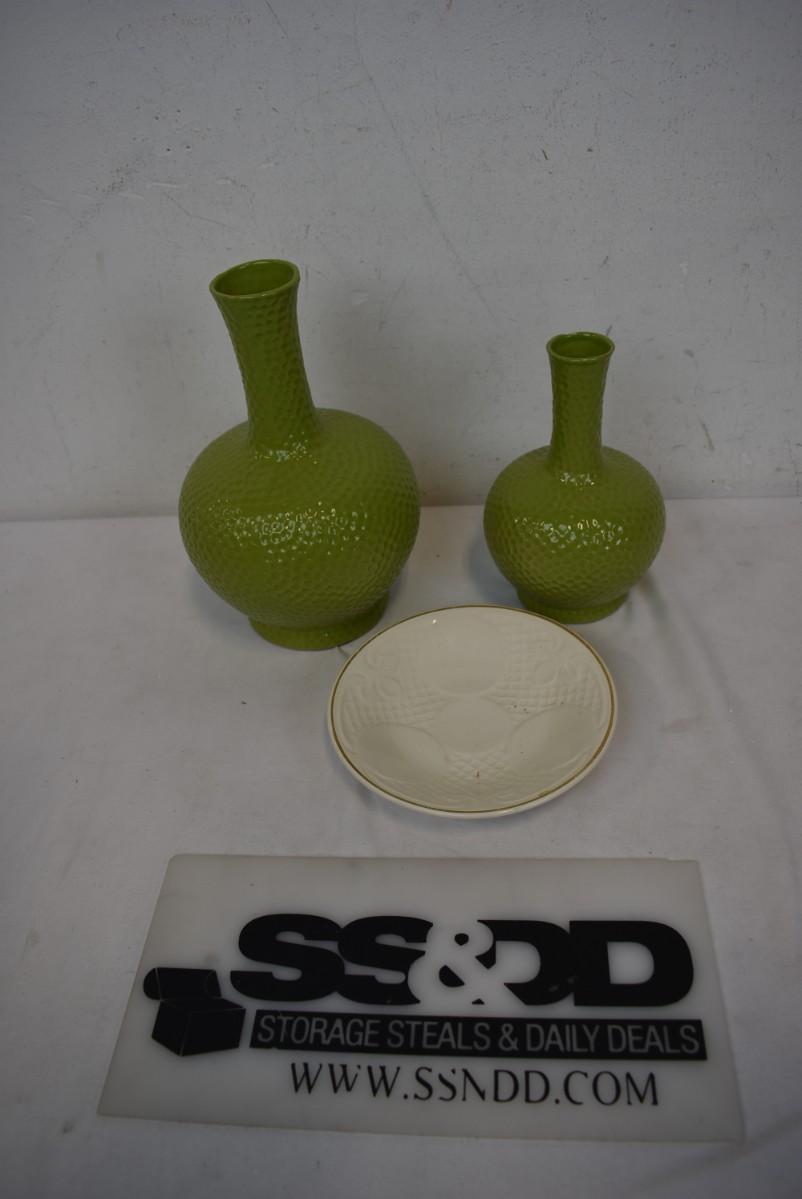 2 Green Flower Vases, Different Sizes, 1 Small Cream Plate