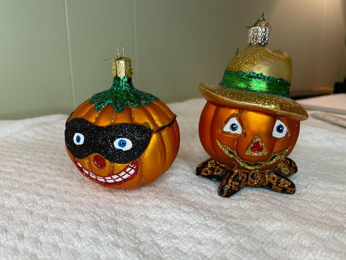 Mercury glass Old World Christmas scarecrow pumpkin and masked pumpkin ornament set. About 3.5-4" tall.