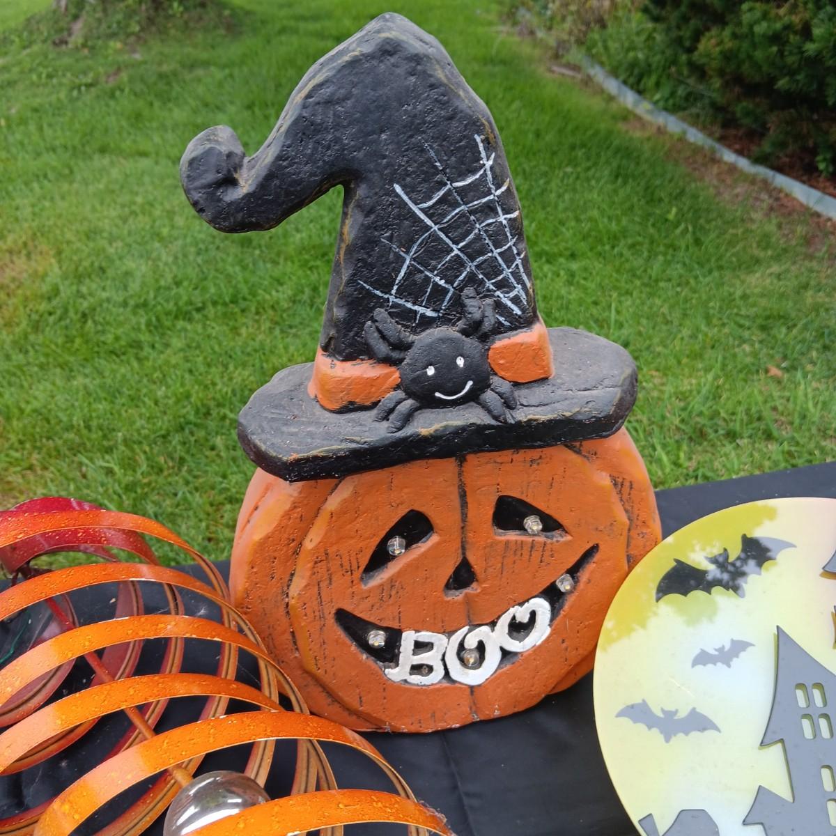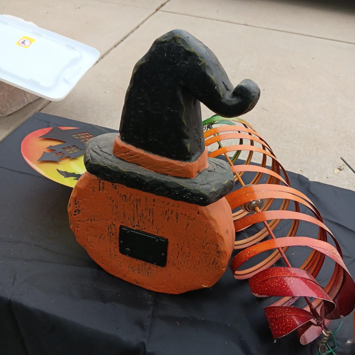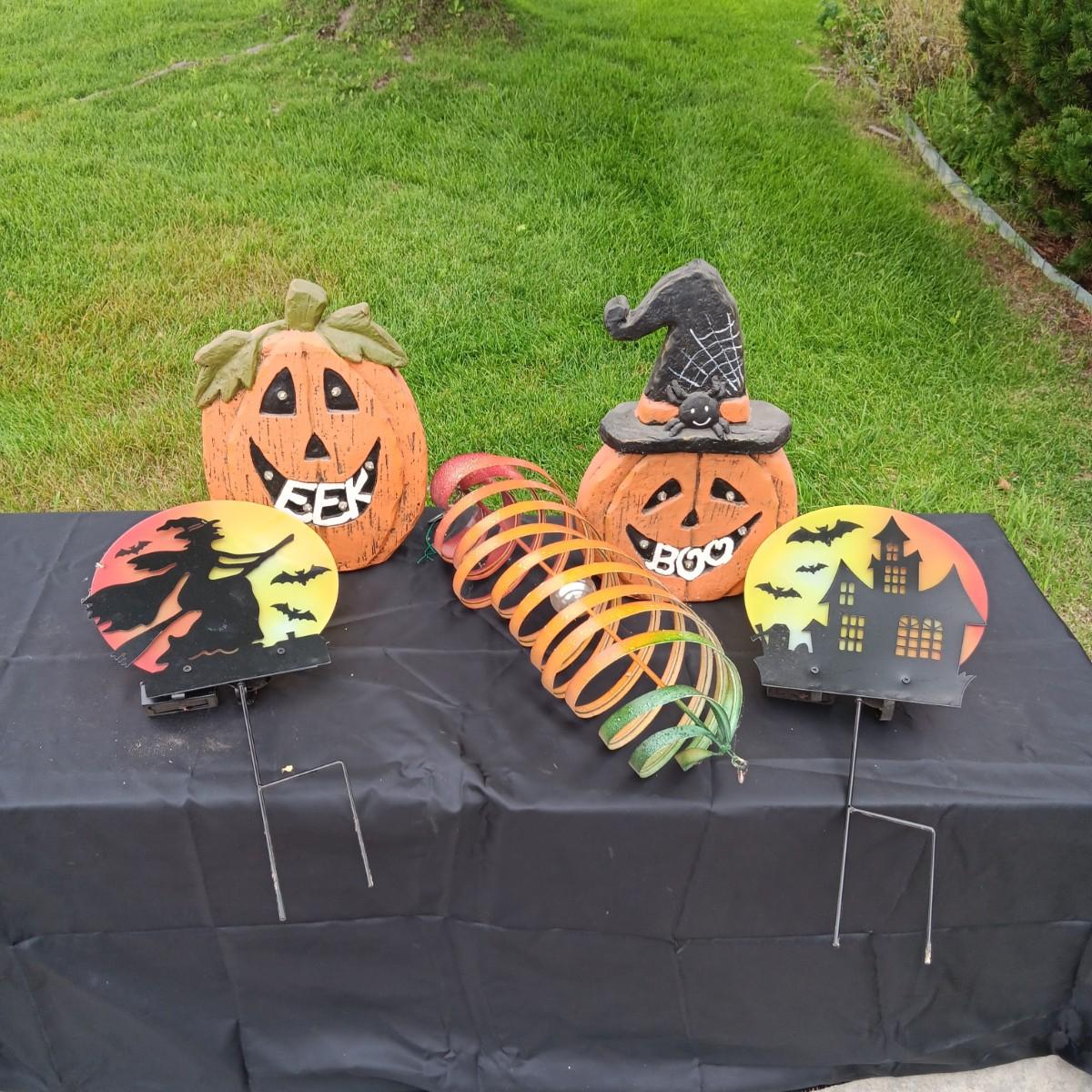 2 HALLOWEEN STAKED LIGHTS, 2 LIT PUMPKINS AND A METAL SPIRAL DECORATION