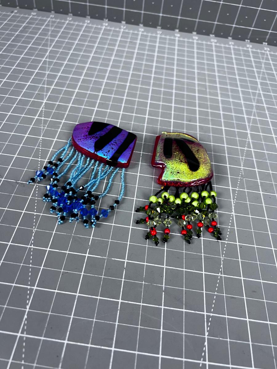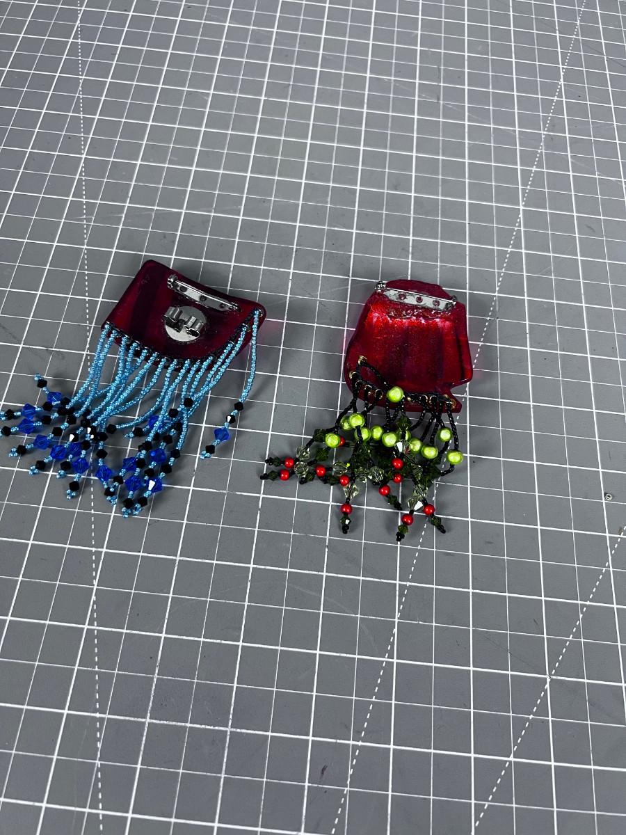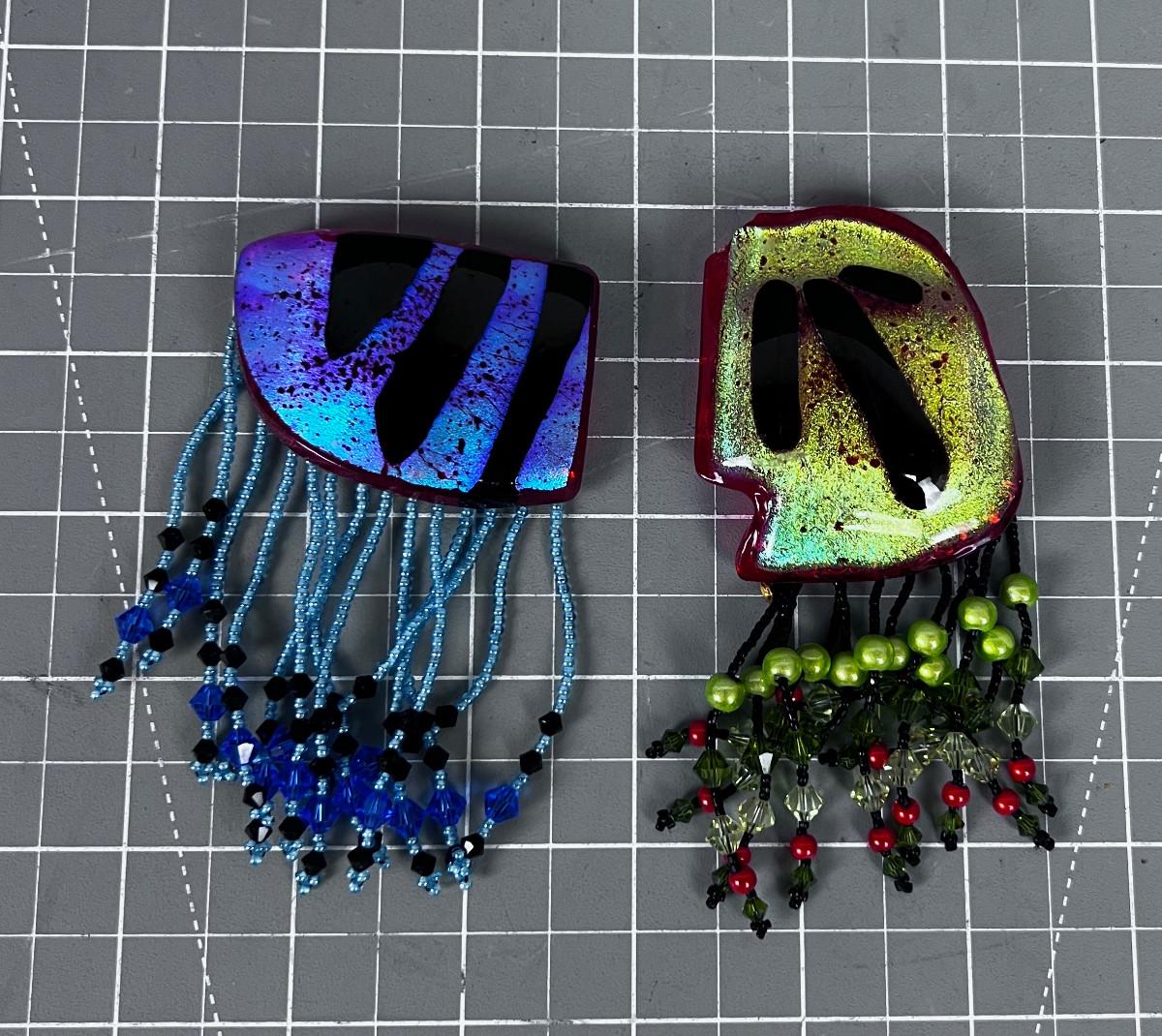 2 Hand Blown Glass and Beaded Exotic Pins