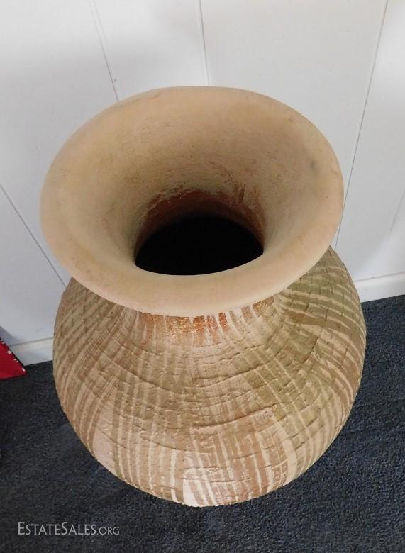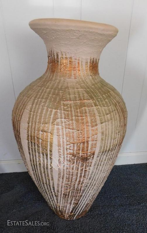 Nice condition terra cotta floor vase. 2' + tall. Painted. Very heavy.