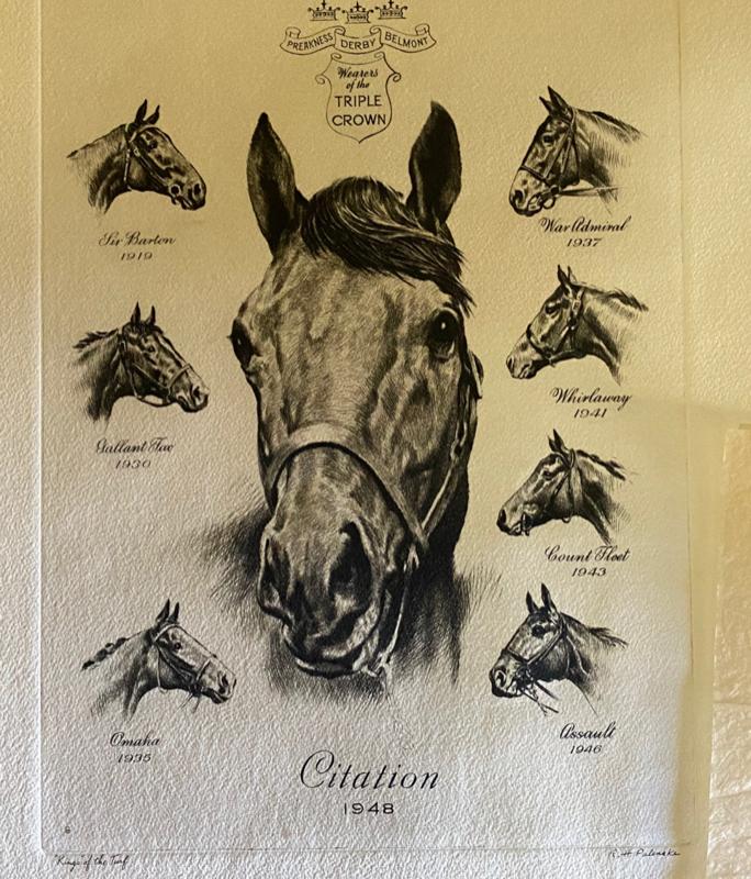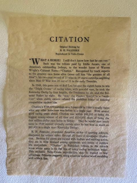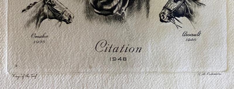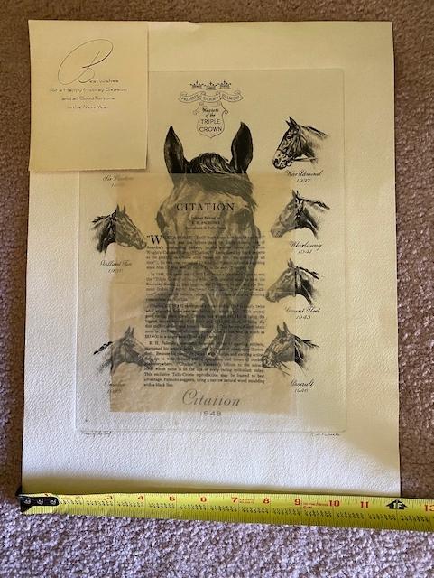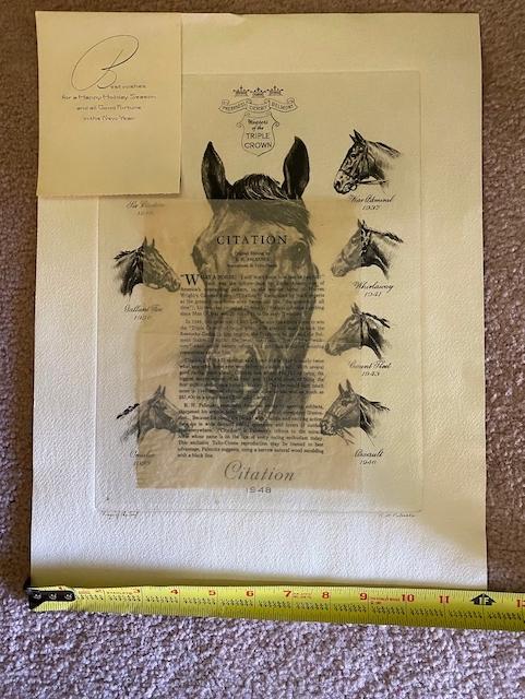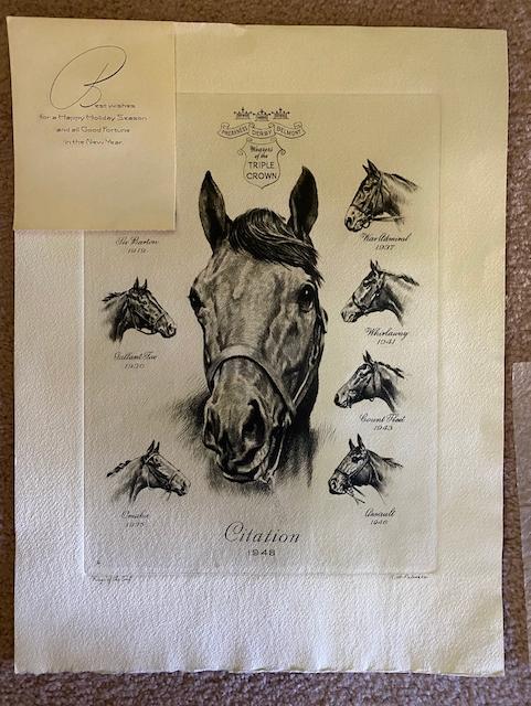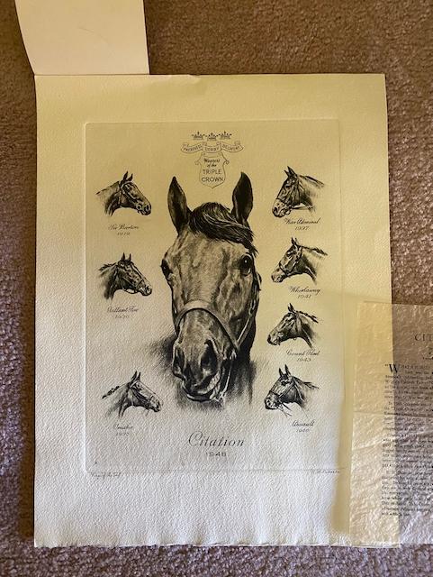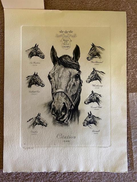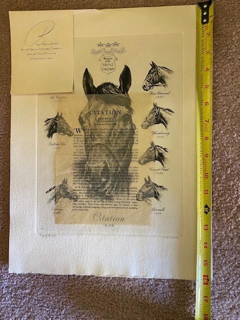 2 Horse prints - The Citation etching was drawn by R. H. Palenske it is 12 3/4" x 16 3/4". Included is a Biography of Citation. The other print is "Closing the Gate" limited edition print by Rochelle Niederman
