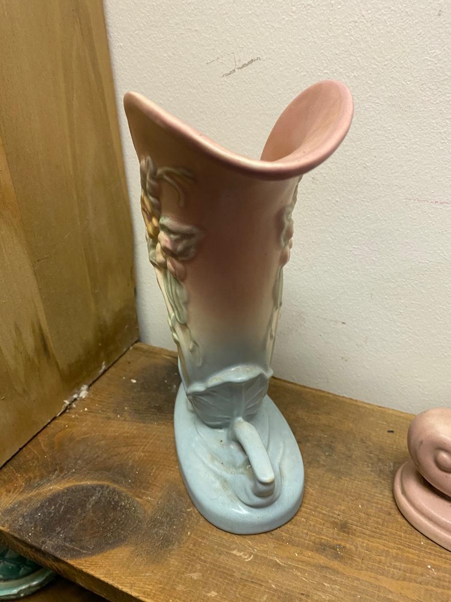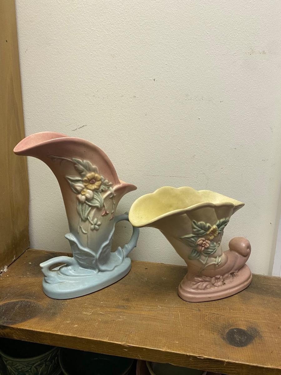 Hull USA Art Pottery Vintage Wildflower Cornucopia Vase Pink & Yellow W-7-7 1/2 USA Made in 1930s with original sticker.Taller one app 9", smaller one app 6"