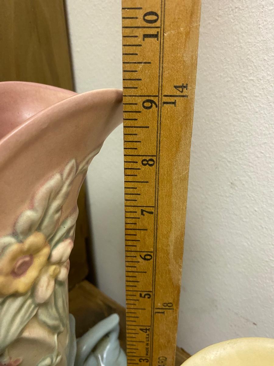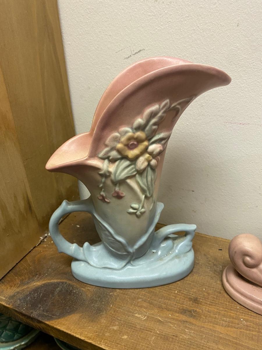 Hull USA Art Pottery Vintage Wildflower Cornucopia Vase Pink & Yellow W-7-7 1/2 USA Made in 1930s with original sticker.Taller one app 9", smaller one app 6"
