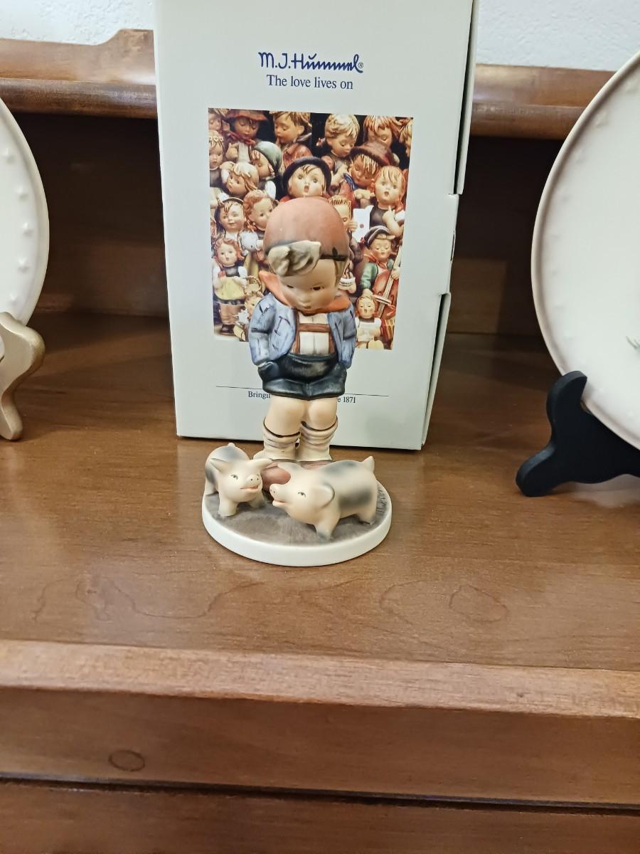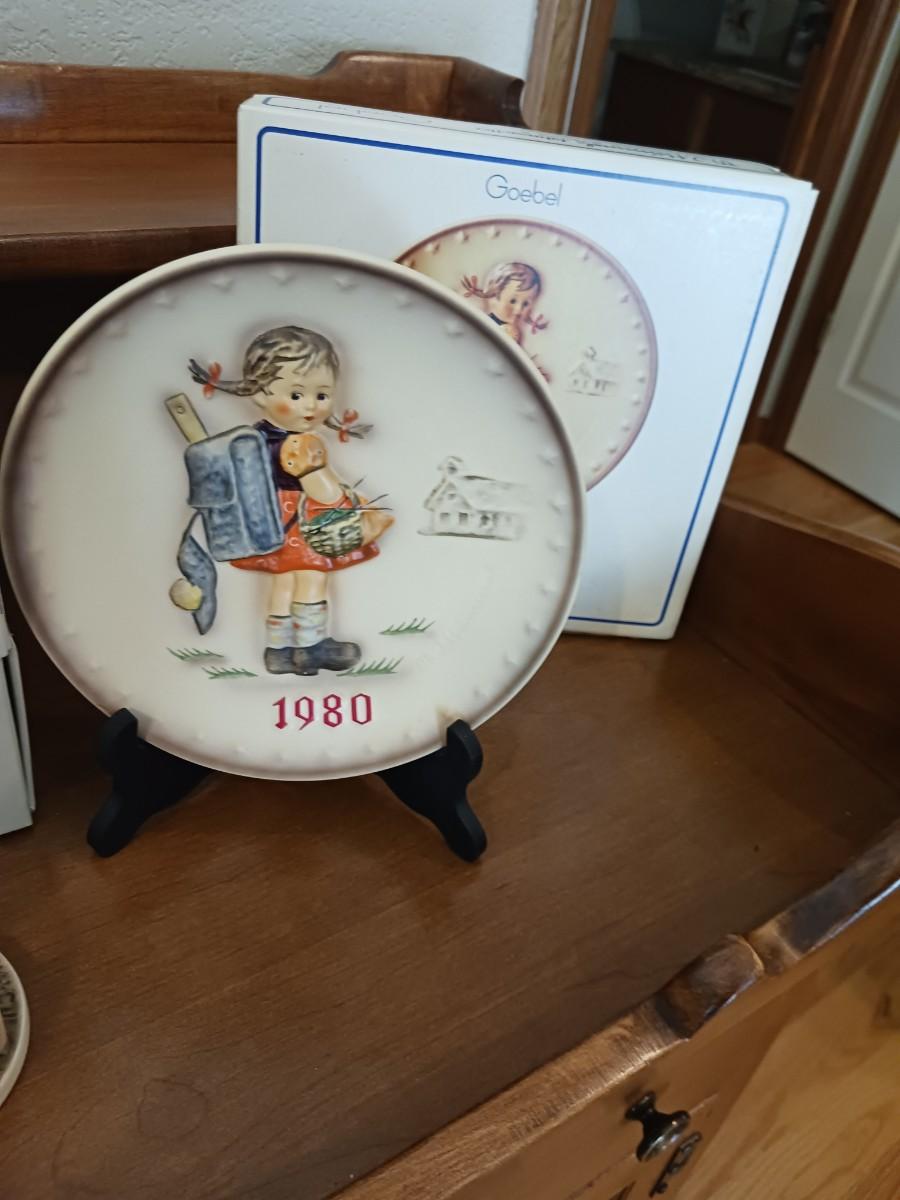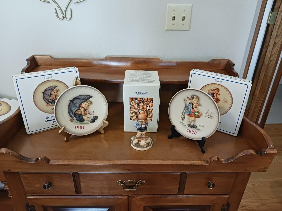 2 HUMMEL PLATES AND A HUMMEL FIGURINE "THE LOVE LIVES ON" WITH BOXES