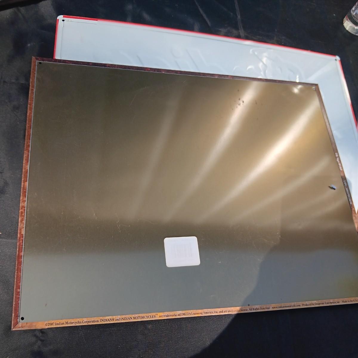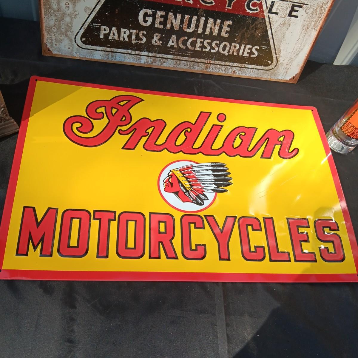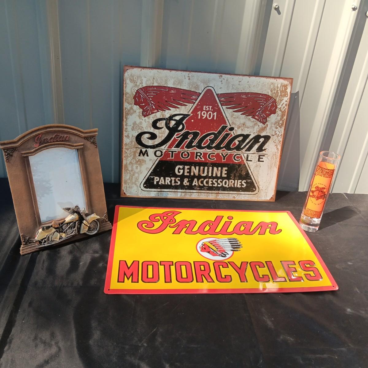 2 INDIAN MOTORCYCLE TIN SIGNS, PICTURE FRAME AND GLASS