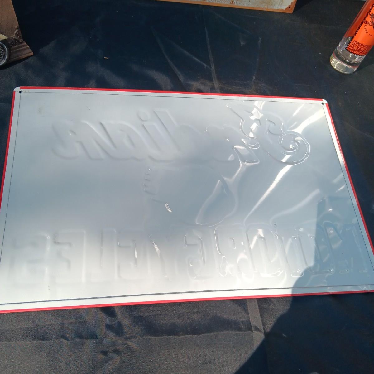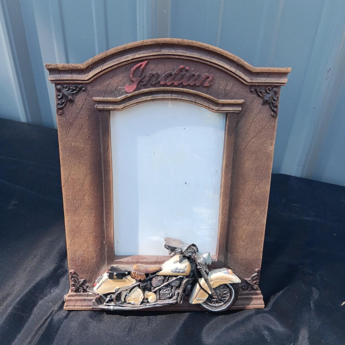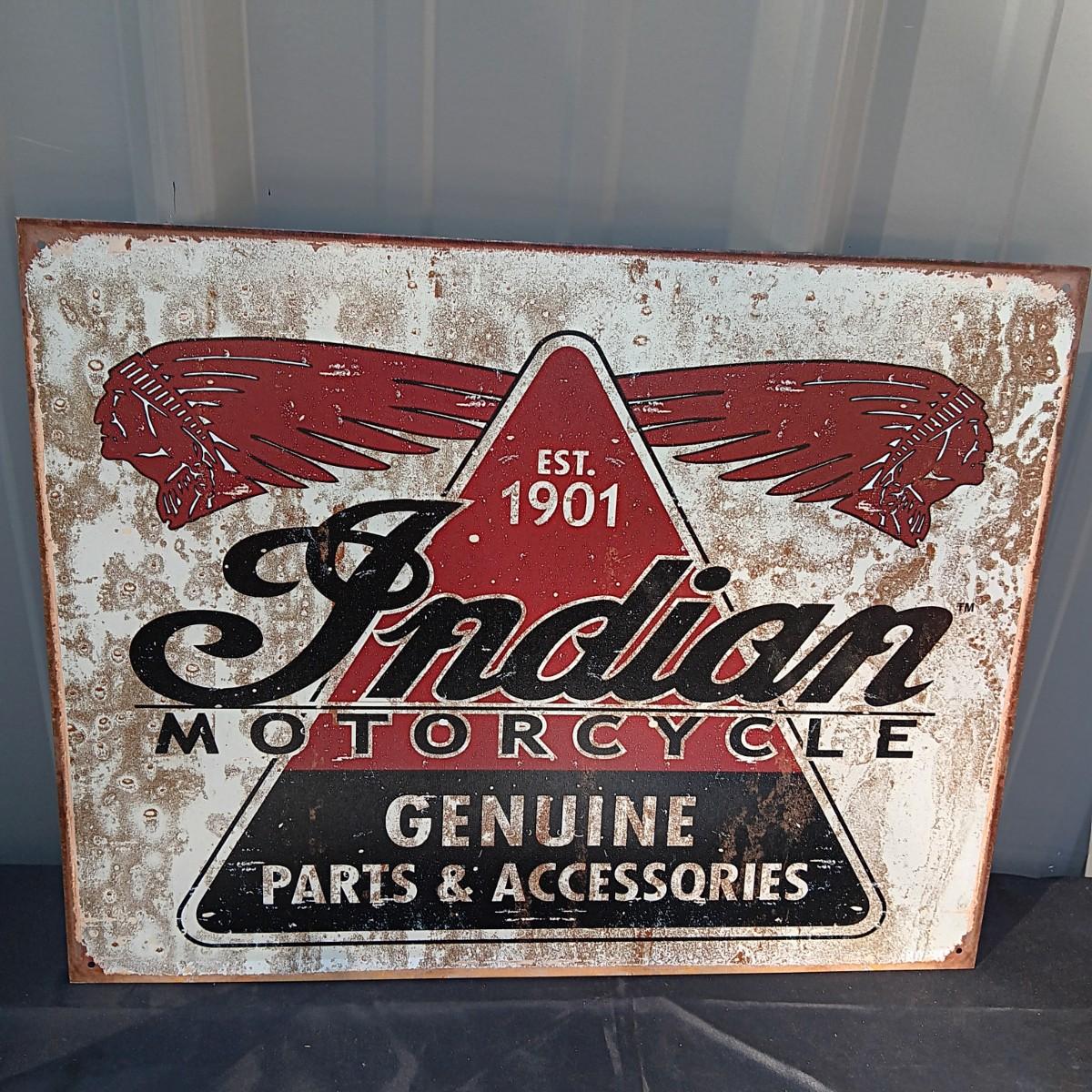 2 INDIAN MOTORCYCLE TIN SIGNS, PICTURE FRAME AND GLASS