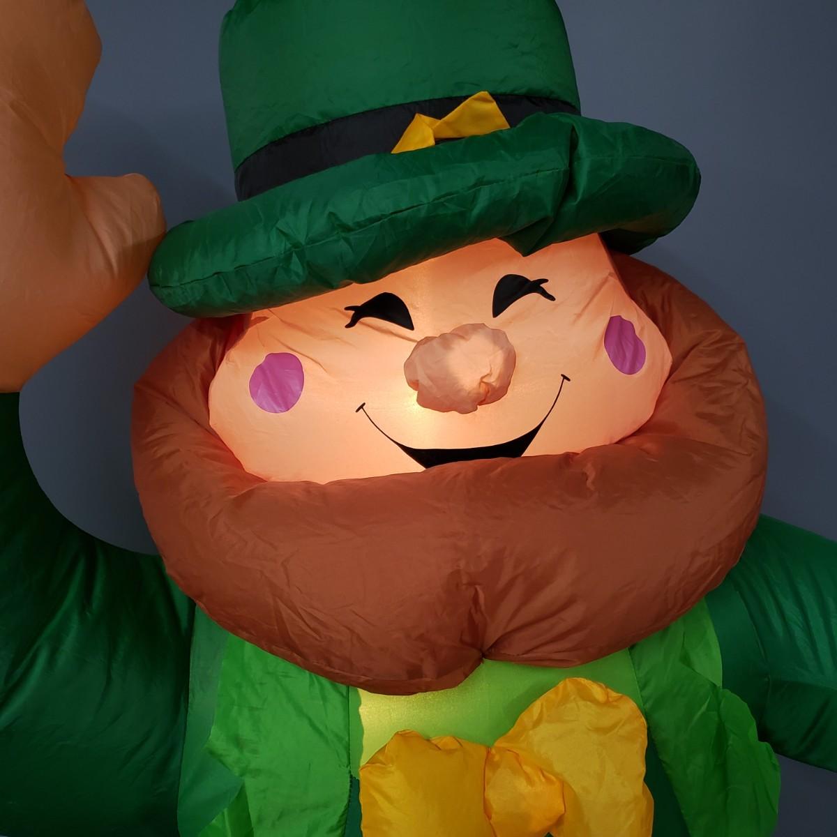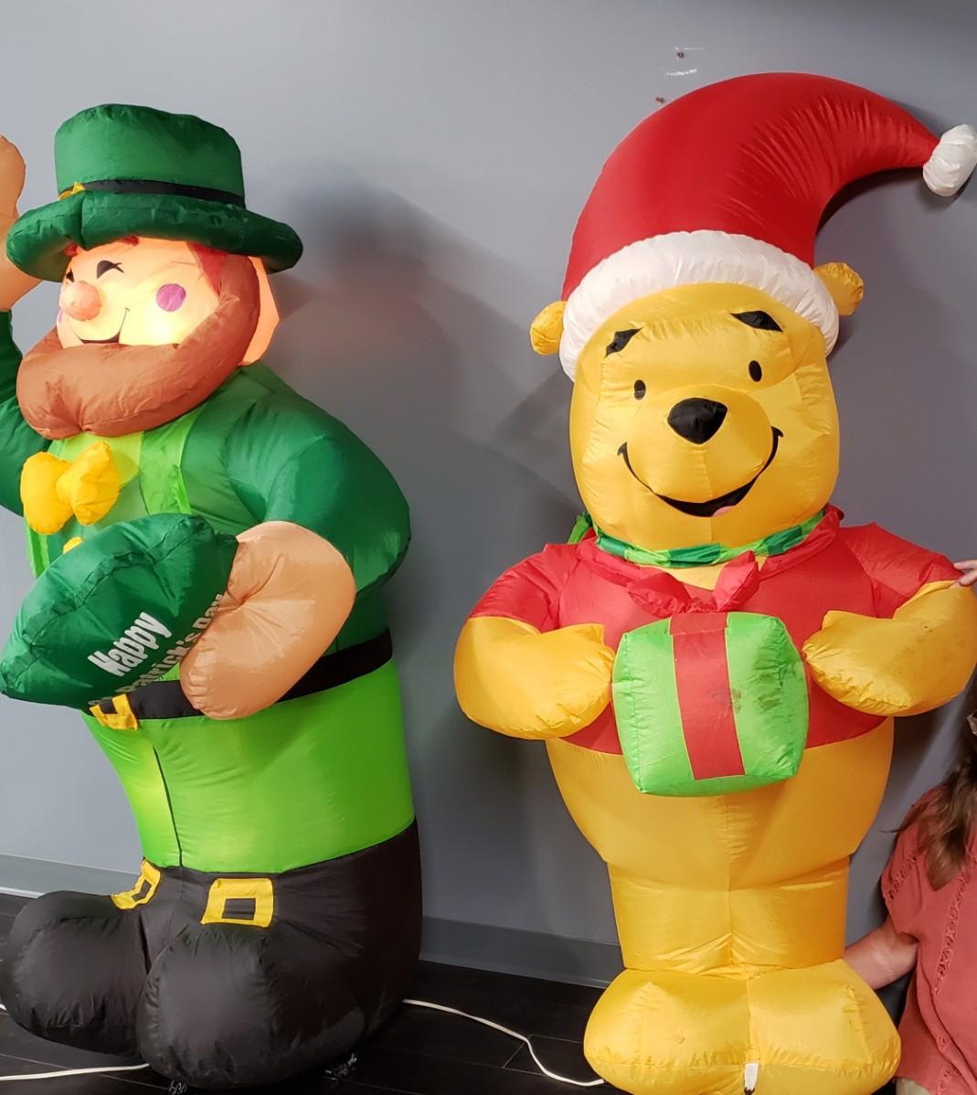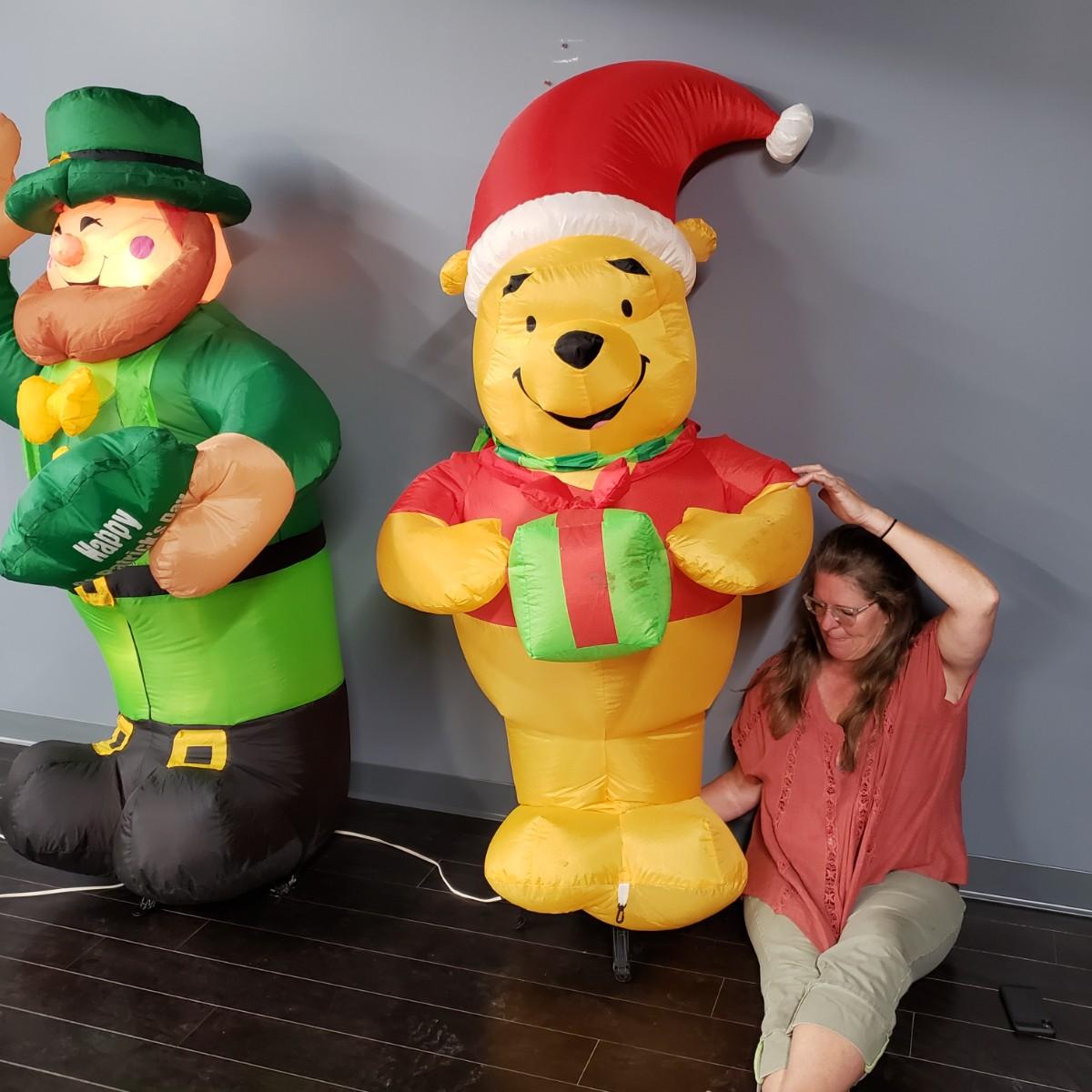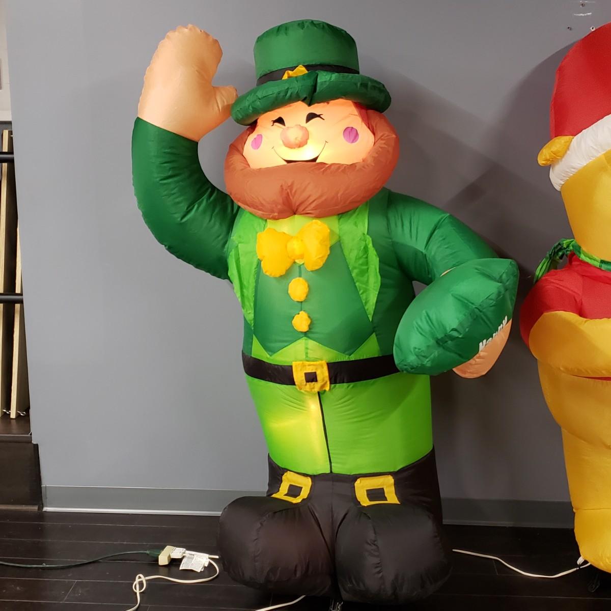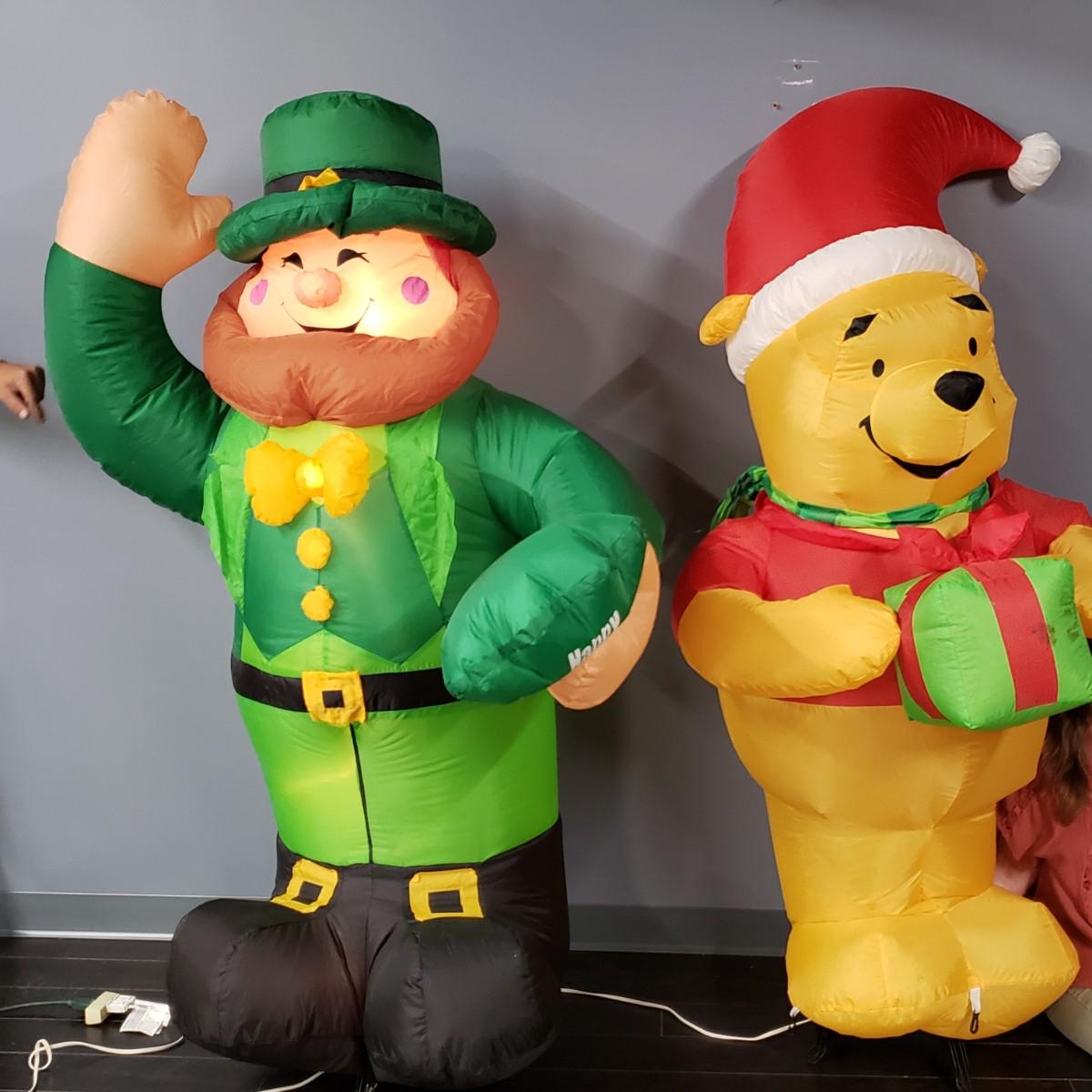An inflatable Leprechaun perfect for St. Patrick's Day! Inflated he stands approximately 68 inches tall and is approximately 33 inches wide. They both inflate by being plugged in. They both have 2 metal hooks to anchor them down to the ground. The Christmas Winnie-the-Pooh also stands approximately 68 inches tall and approximately 33 inches wide. The zipper on the bottom of Pooh is broken as seen in the pictures. A quick sewing job or duck tape would help hold the air in. Shipping available.