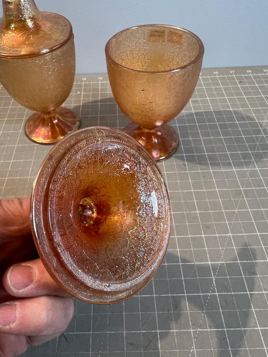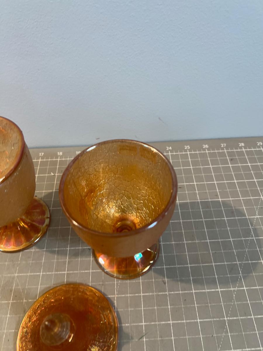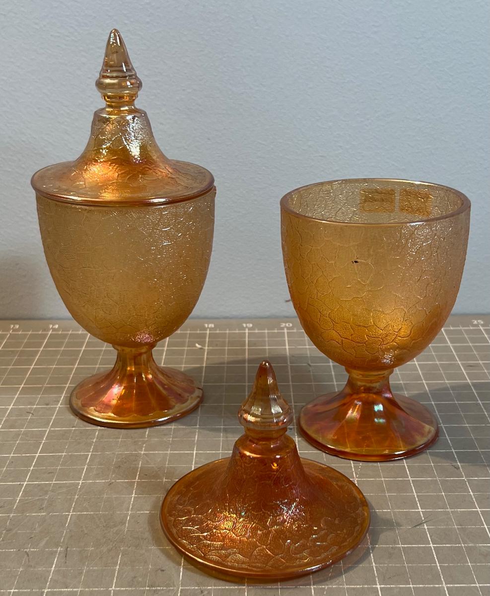 2 Jeanette Carnival Glass Crackel Lidded Candy Jars