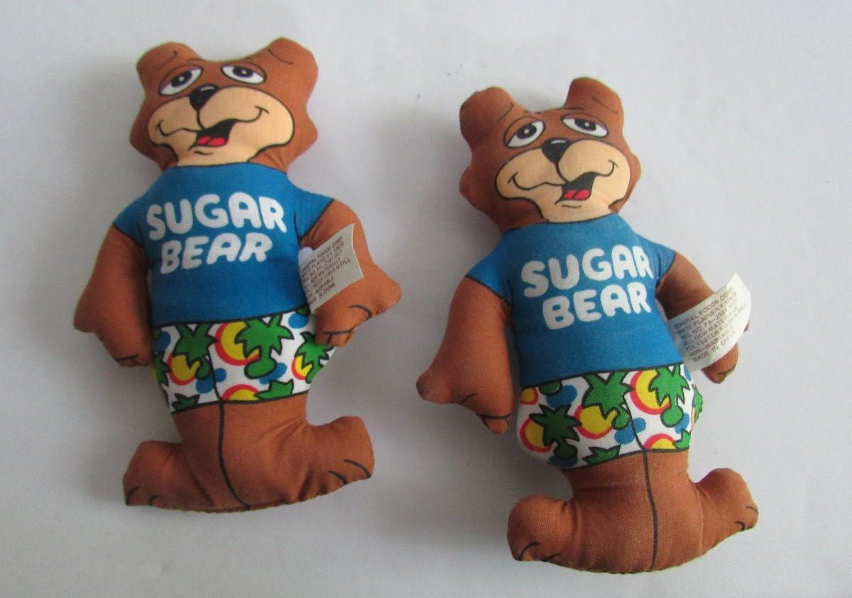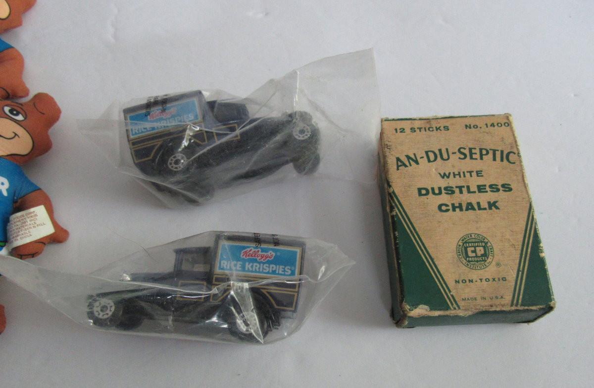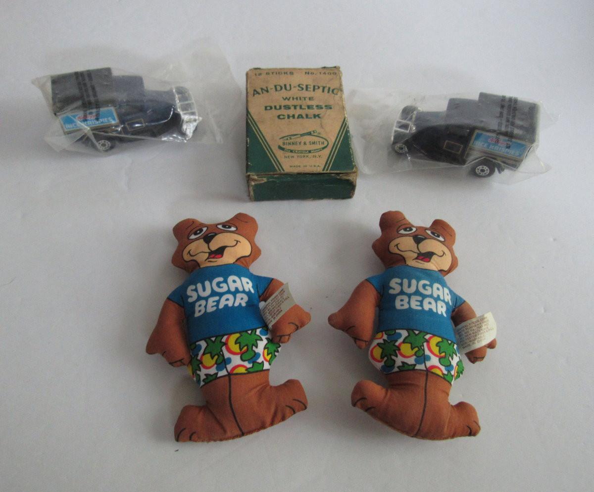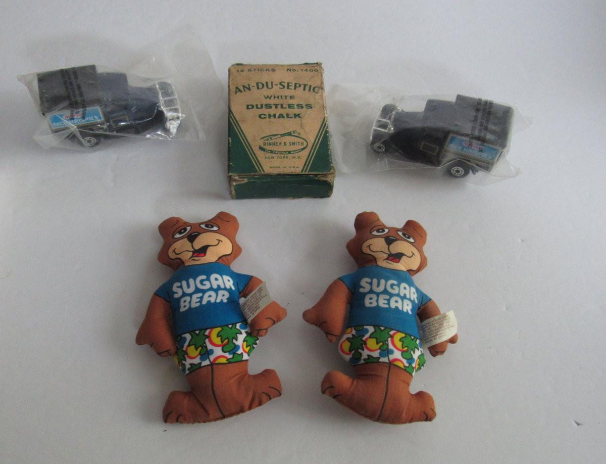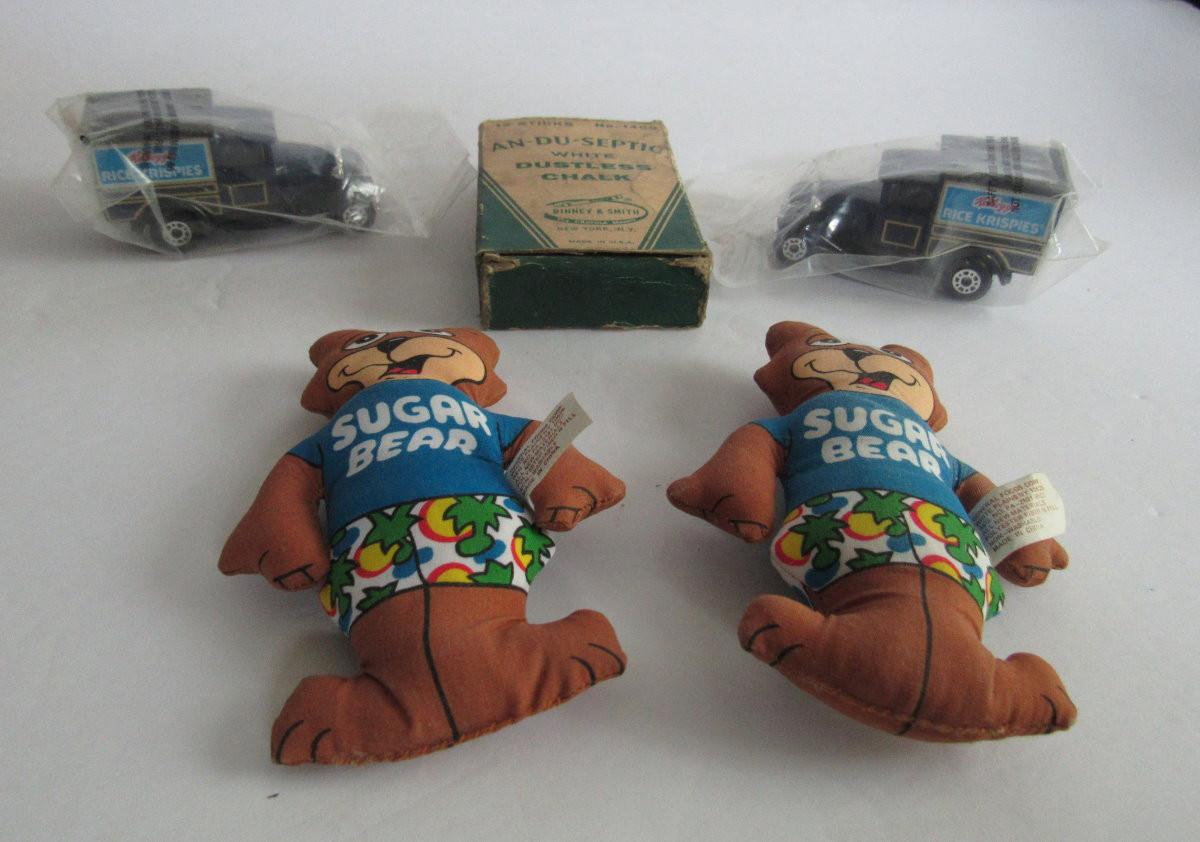 2 Kelloggs Toy Trucks, 2 Sugar Bear Dolls, Old Chalk Box With Small Chalk Pieces