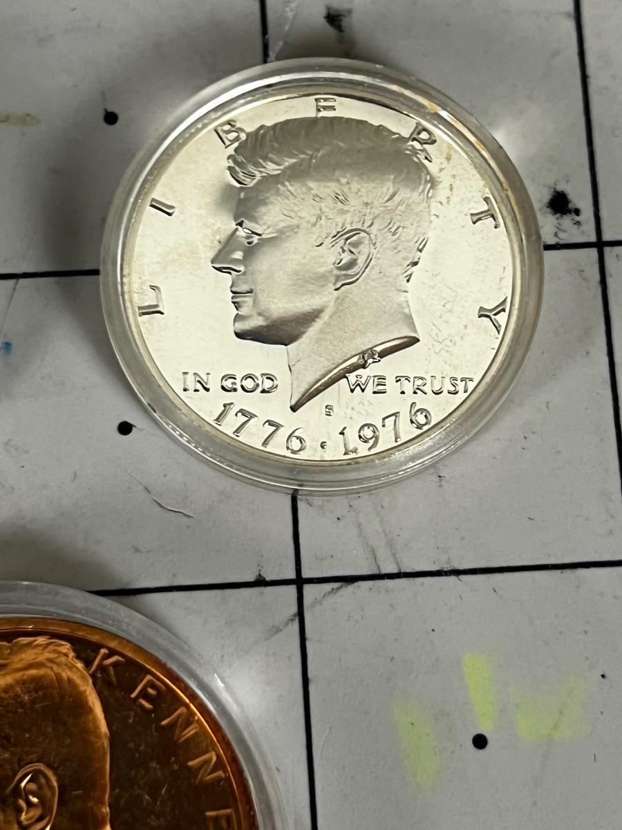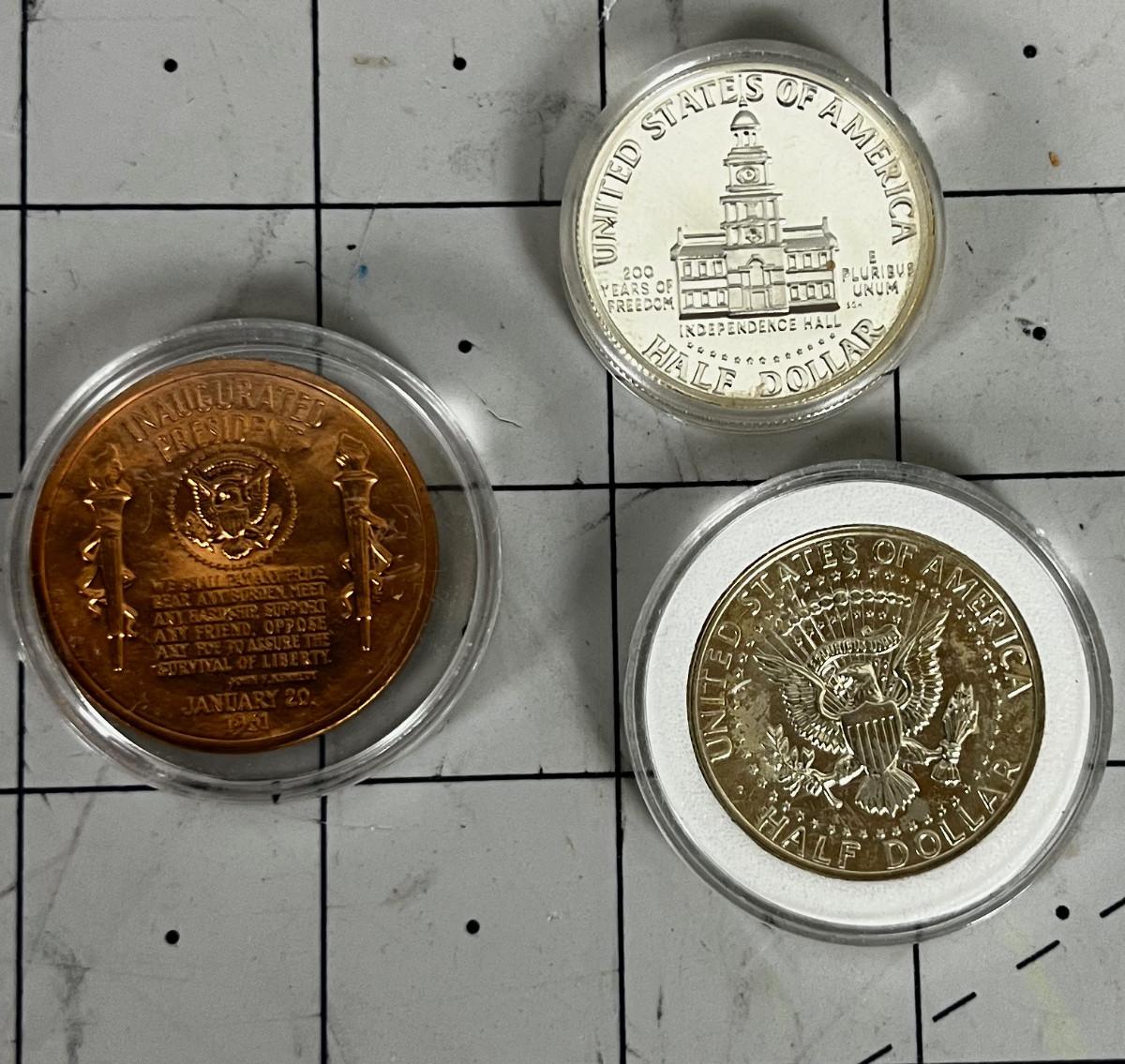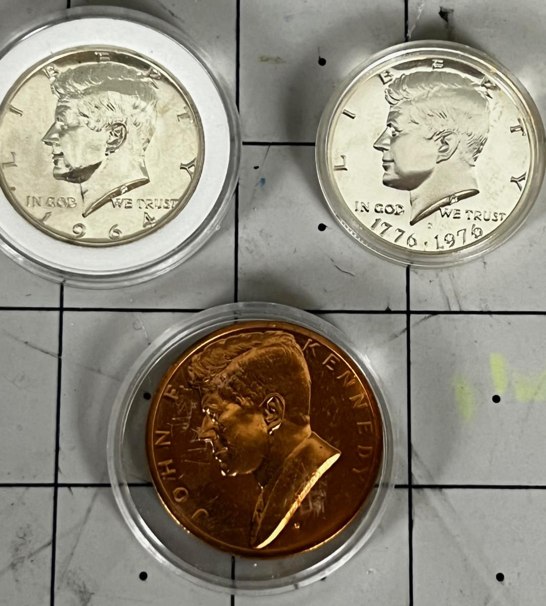2 Kennedy Half Dollars and A Commemorative Copper Kennedy Coin