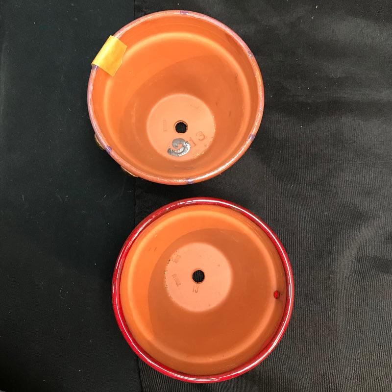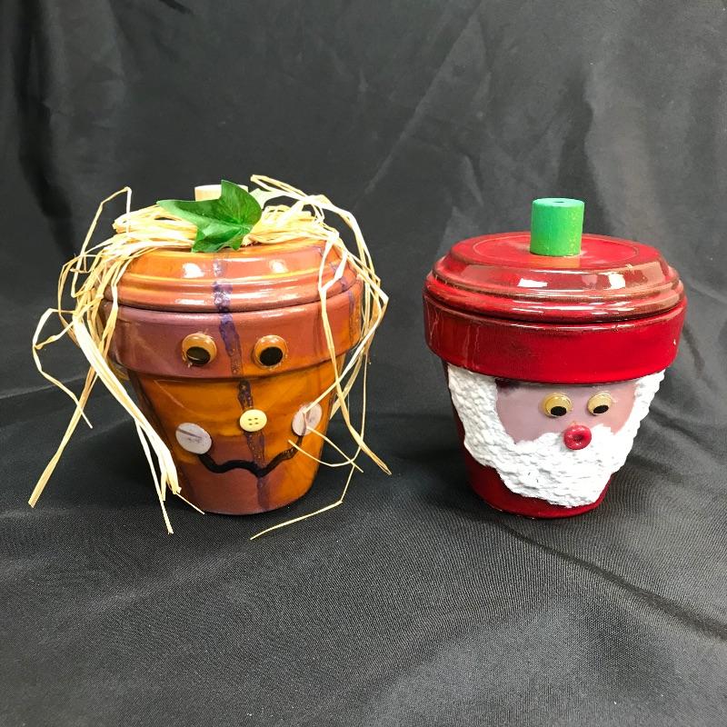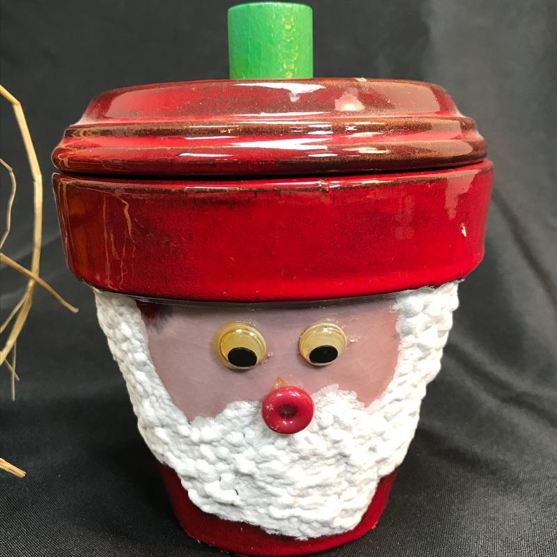 Auction is for two kitschy flower pots. One appears to be painted-up like a jack-o’-lantern, the other is Santa Claus. Both are in excellent shape with no cracks or chips.