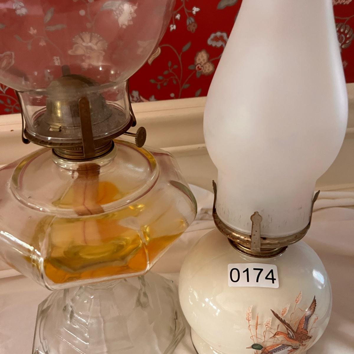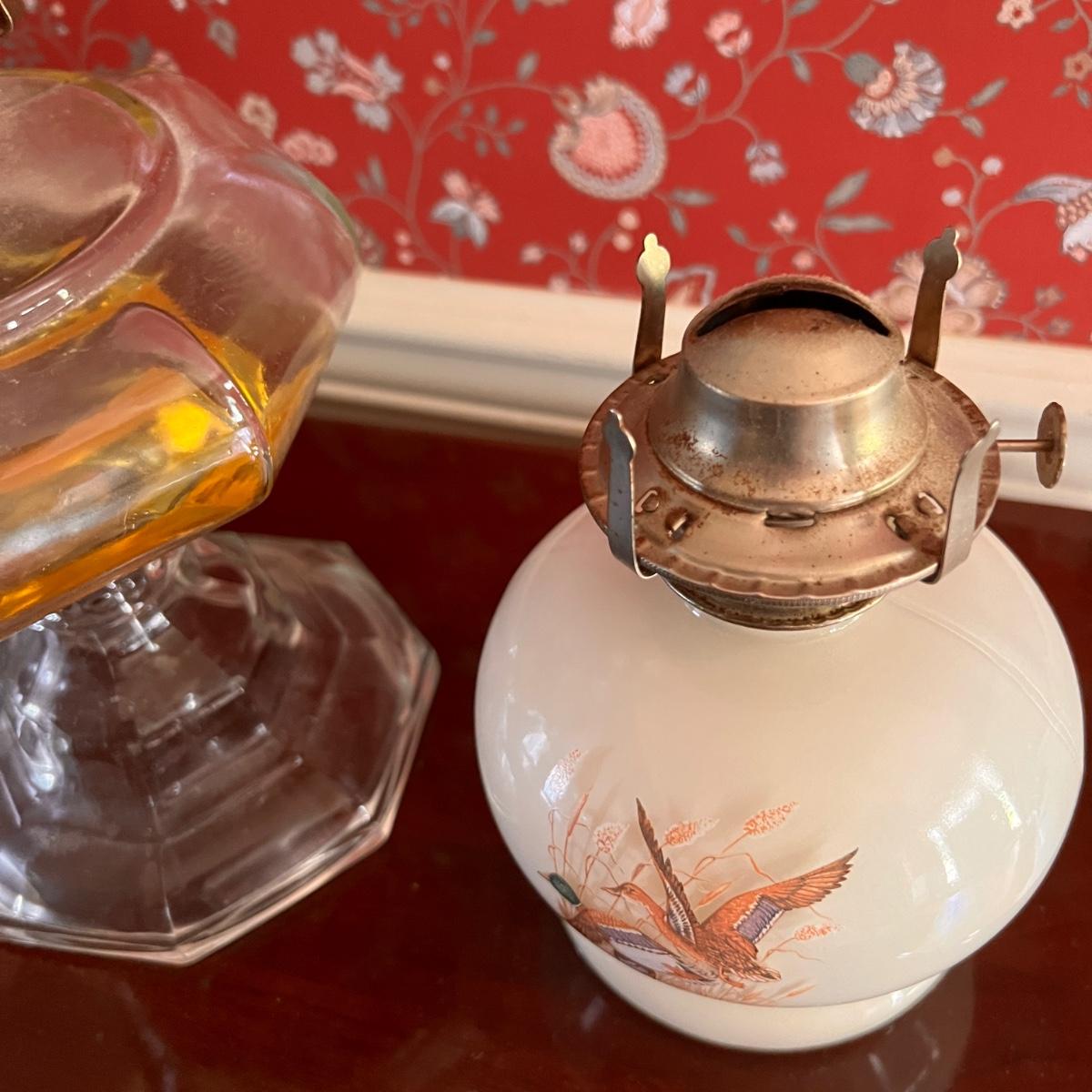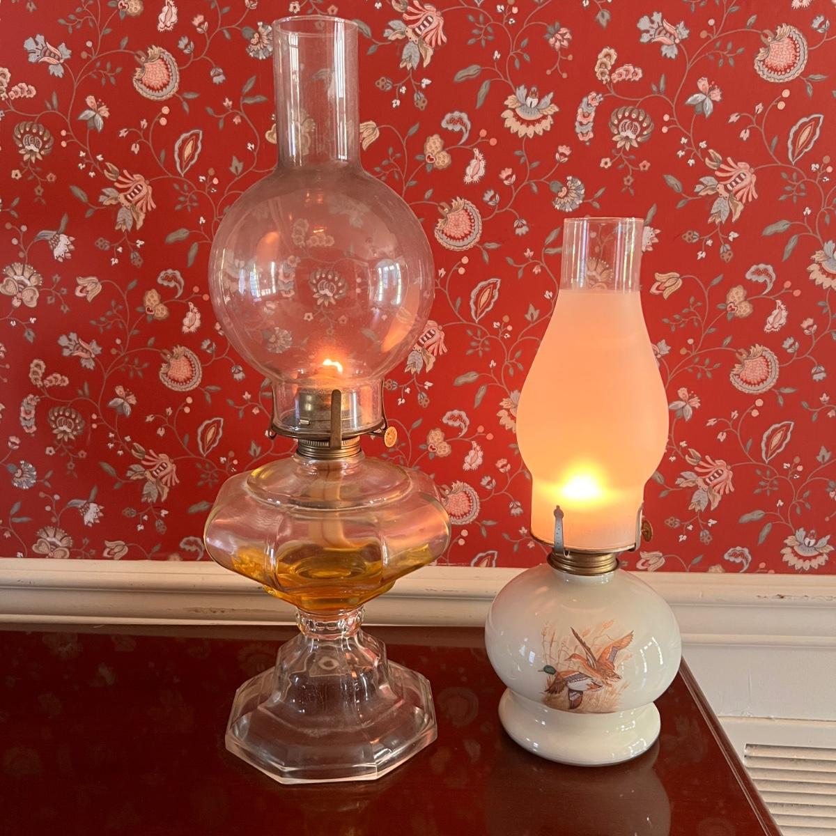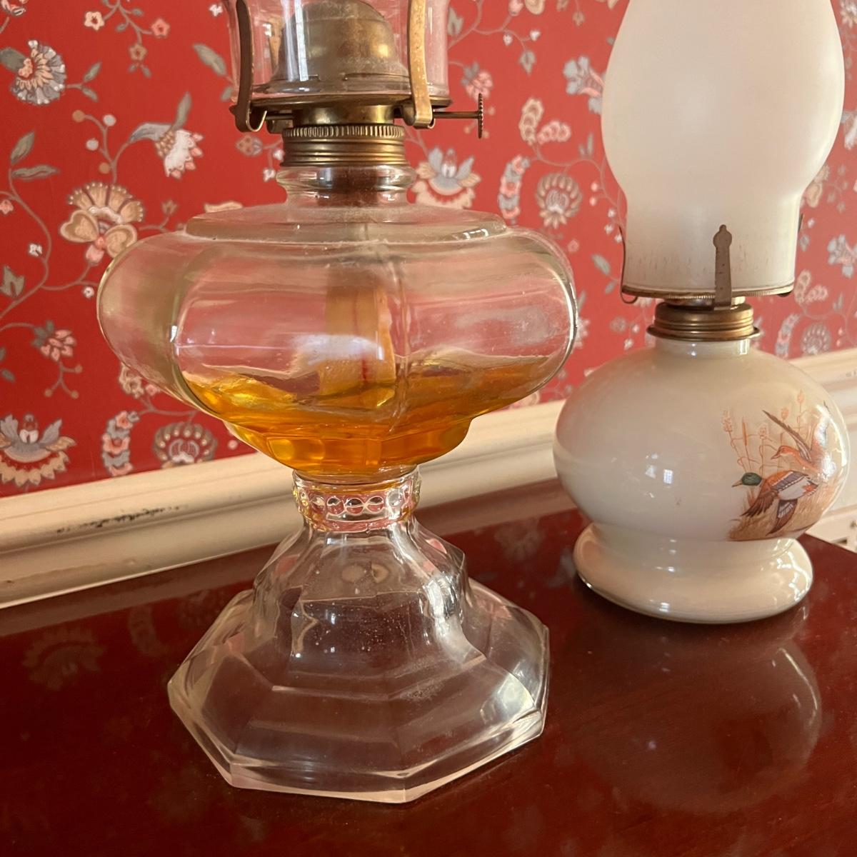 Antique vintage clear glass hurricane oil pedestal lamp with clear chimney. Mallard duck oil lamp with frosted glass chimney. Both work as you can see in the pics!