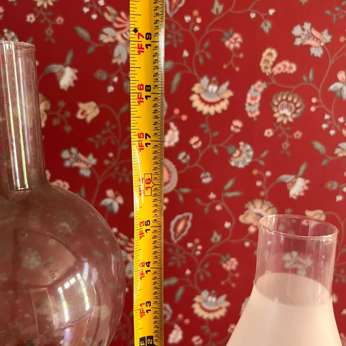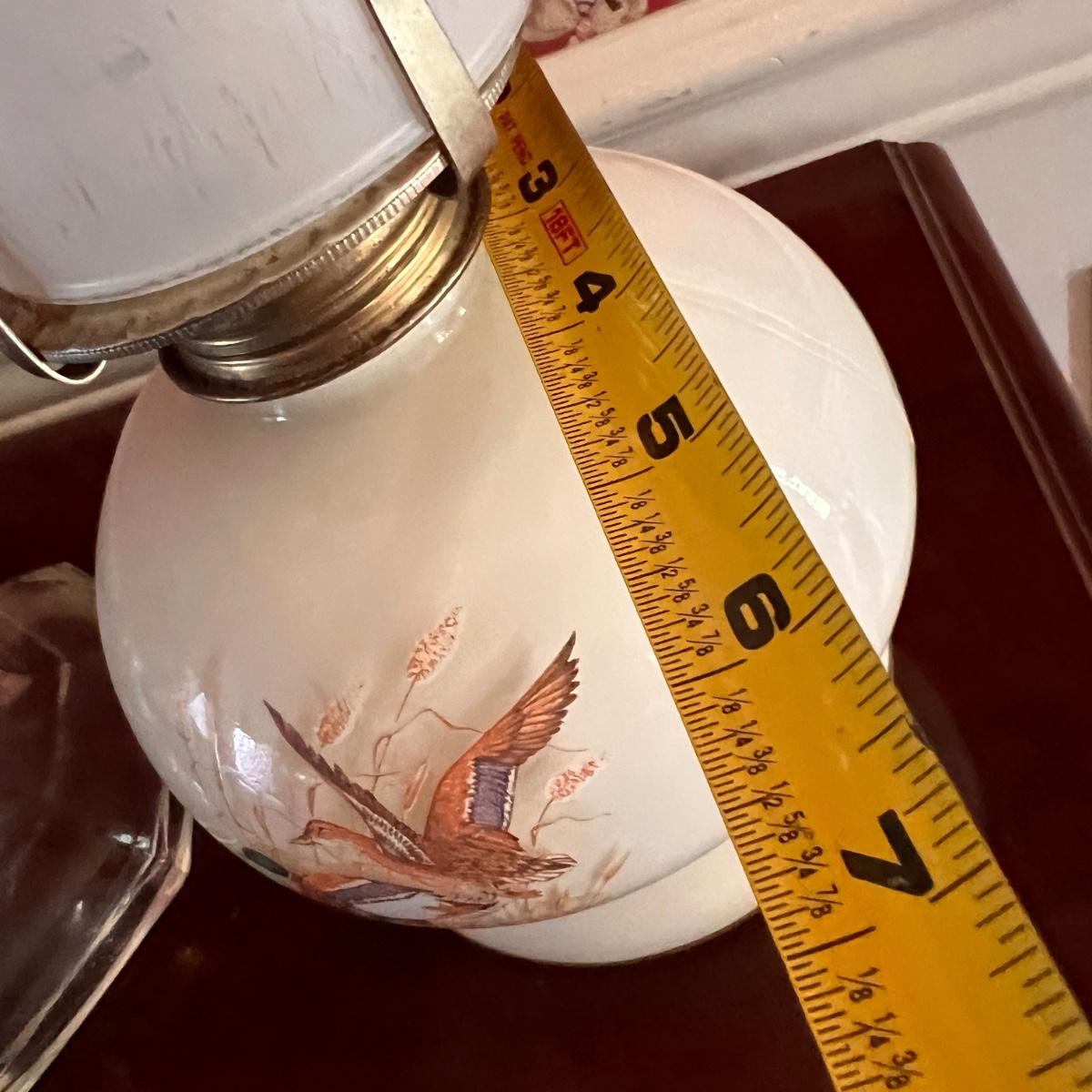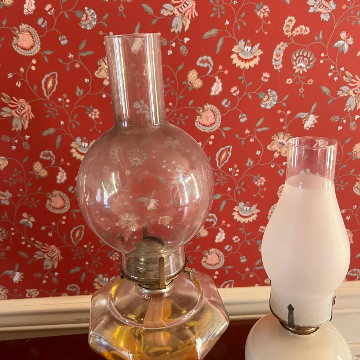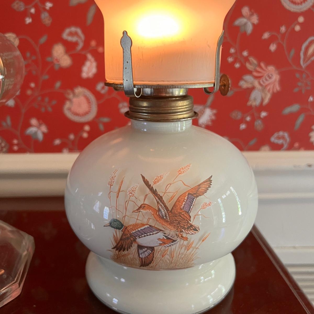 Antique vintage clear glass hurricane oil pedestal lamp with clear chimney. Mallard duck oil lamp with frosted glass chimney. Both work as you can see in the pics!