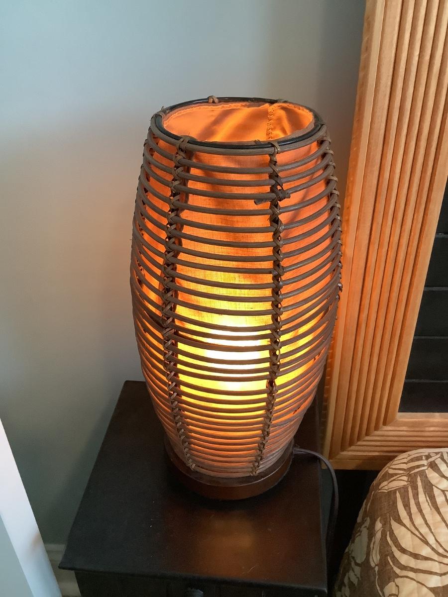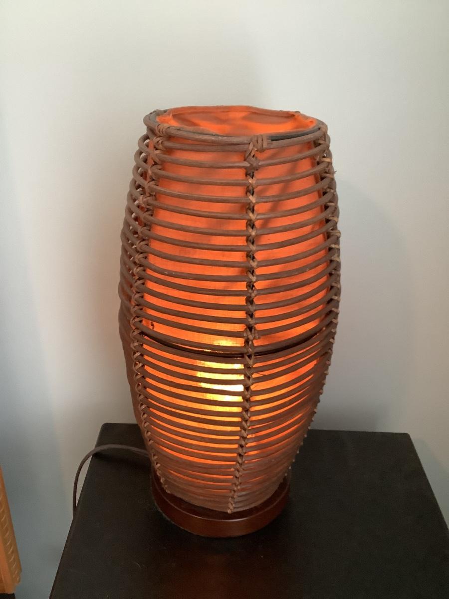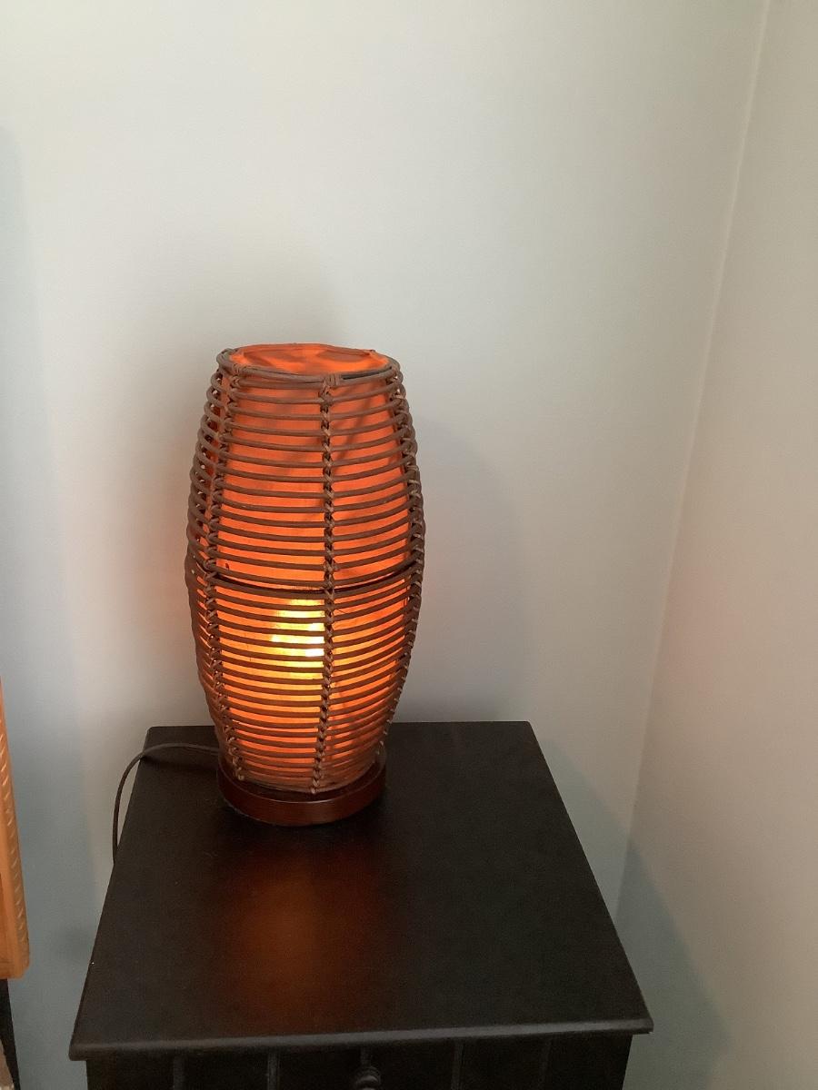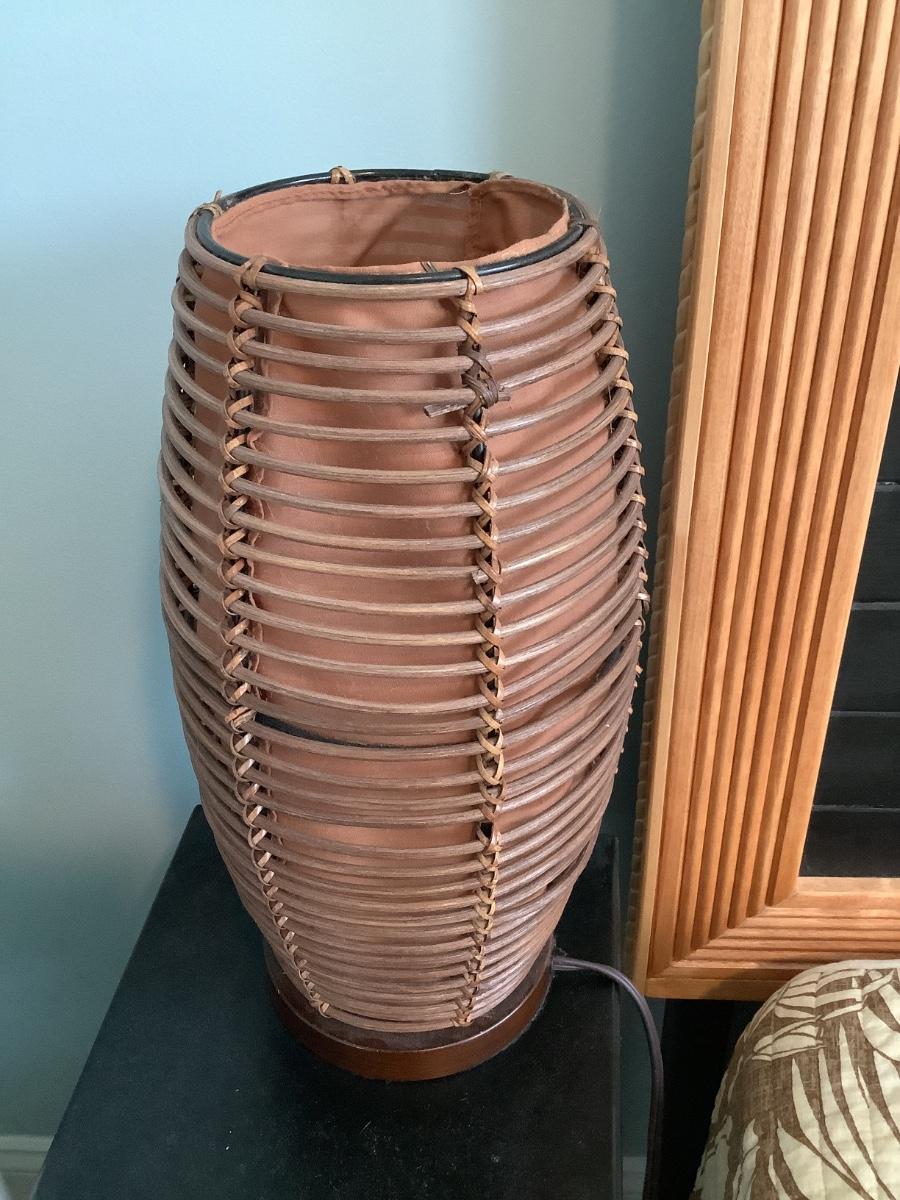 2 lamps, wicker & fabric inline switch 15”H 6”diameter