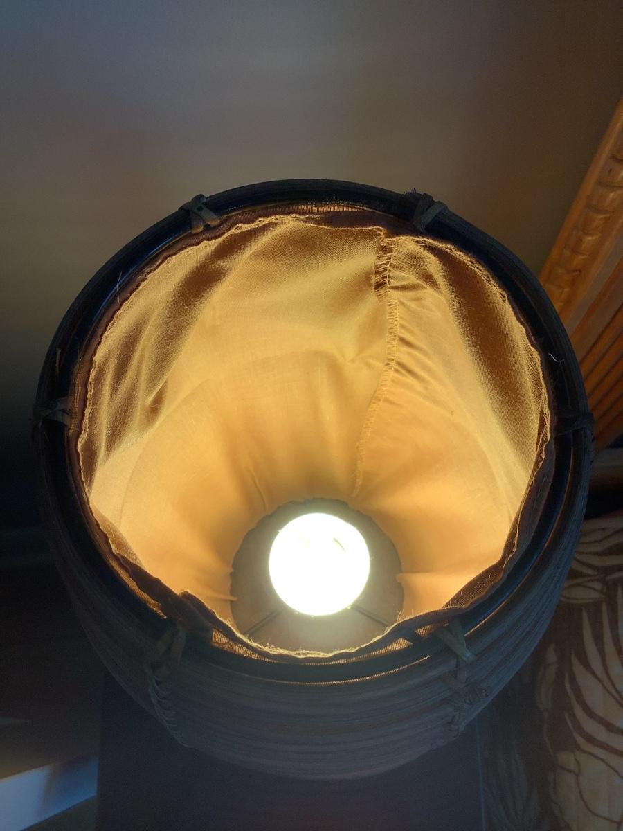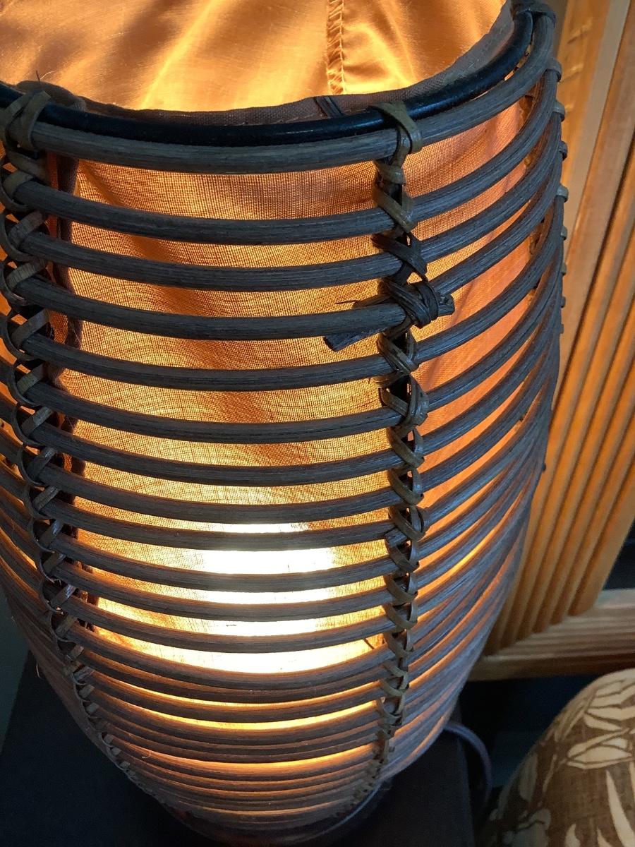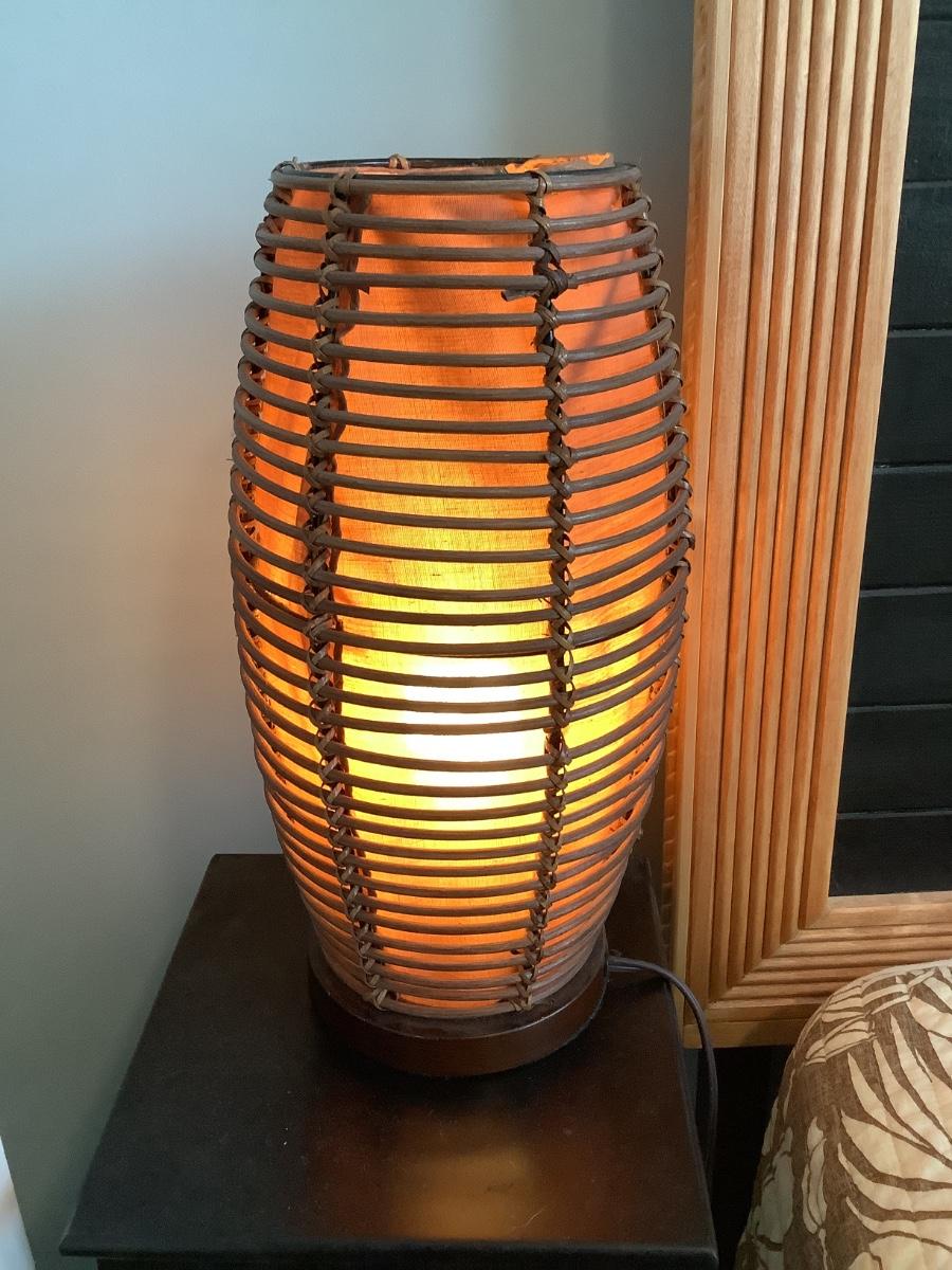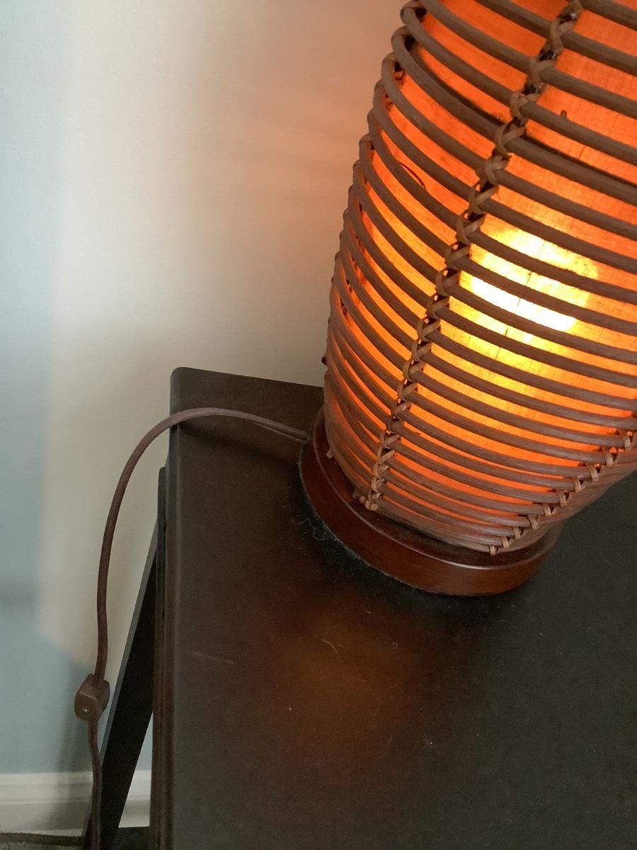 2 lamps, wicker & fabric inline switch 15”H 6”diameter