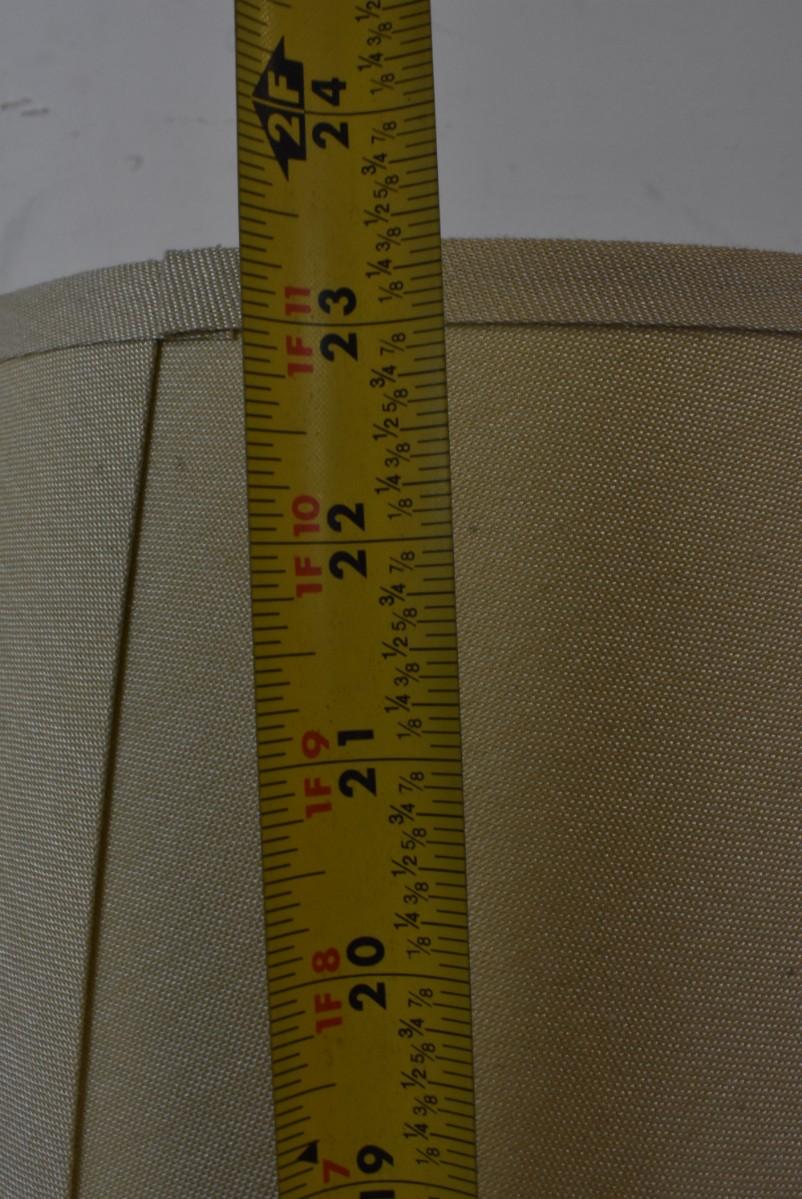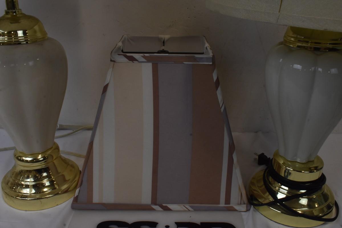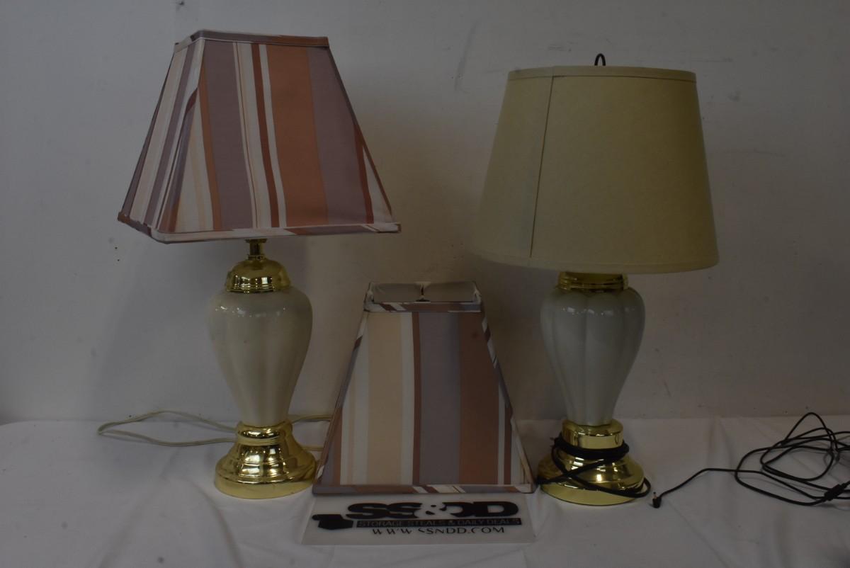 2 lamps with shades, 1 extra shade, lamp colors: cream nd white w/gold trim